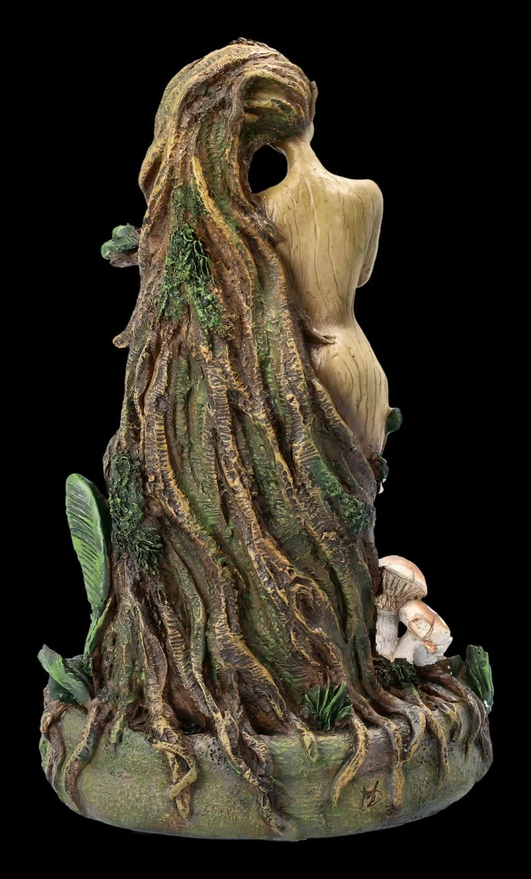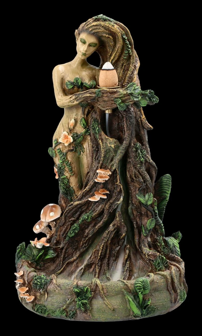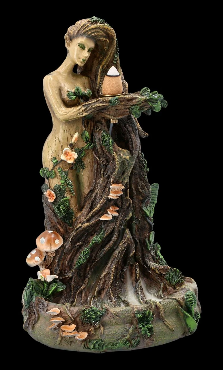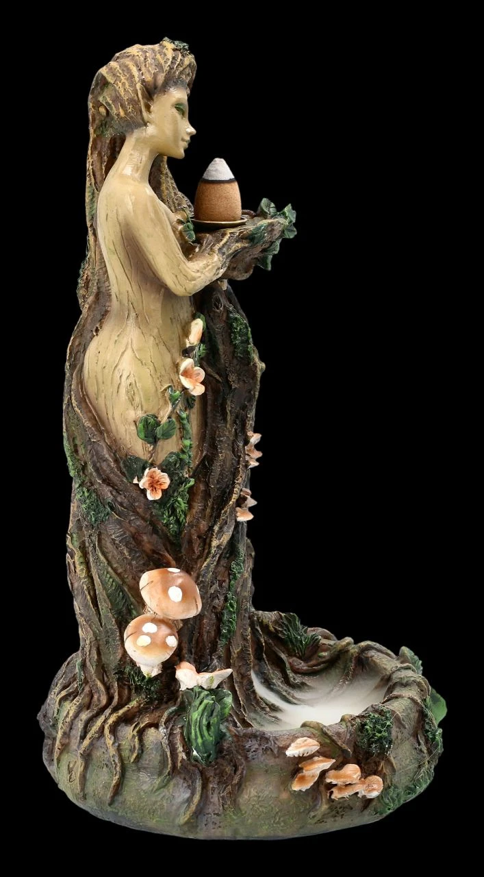 Dieser dekorative Backflow-Räucherkegelhalter zeigt Mutter Erde in ihrer ganzen Schönheit. Das ihren nackten Körper umfließende lange Haar bildet den Stamm eines uralten Baumes, an dem Glückspilze und Blumen wachsen. Der schöne Backflow Räucherhalter aus detailliert handbemaltem Kunststein (Polyresin) ist 23 cm hoch, 14 cm breit und 12 cm tief. Der Nebel des Backflow Räucherkegels fließt nach unten und wird in einem kleinen See am Fuße des Baumstammes aufgefangen. Ein Backflow Räucherkegel ist beigefügt, weitere finden Sie in unserem Shop.