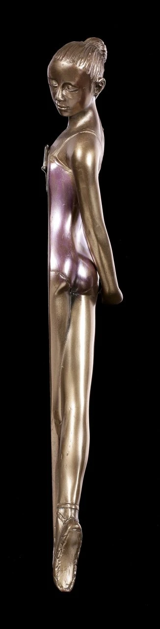 Das bronzierte und colorierte Wandrelief aus Kunststein (Polyresin) zeigt eine junge Ballerina bei Aufwärmübungen. Grazil dehnt sie ihre Arme und den Rücken und es scheint fast, als ob sie jeden Moment aus ihrer Starre erwacht und an Ihrer Wand entlang tanzt.