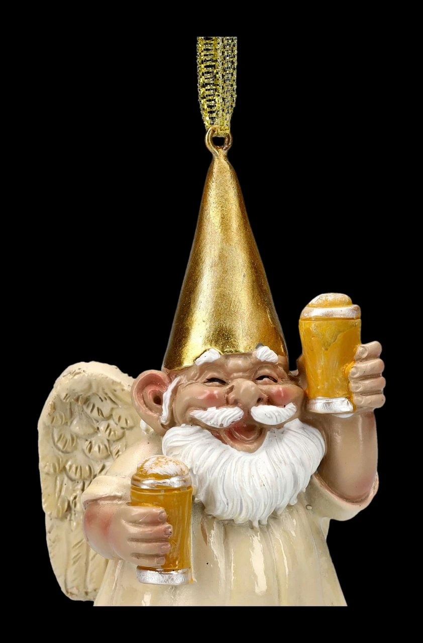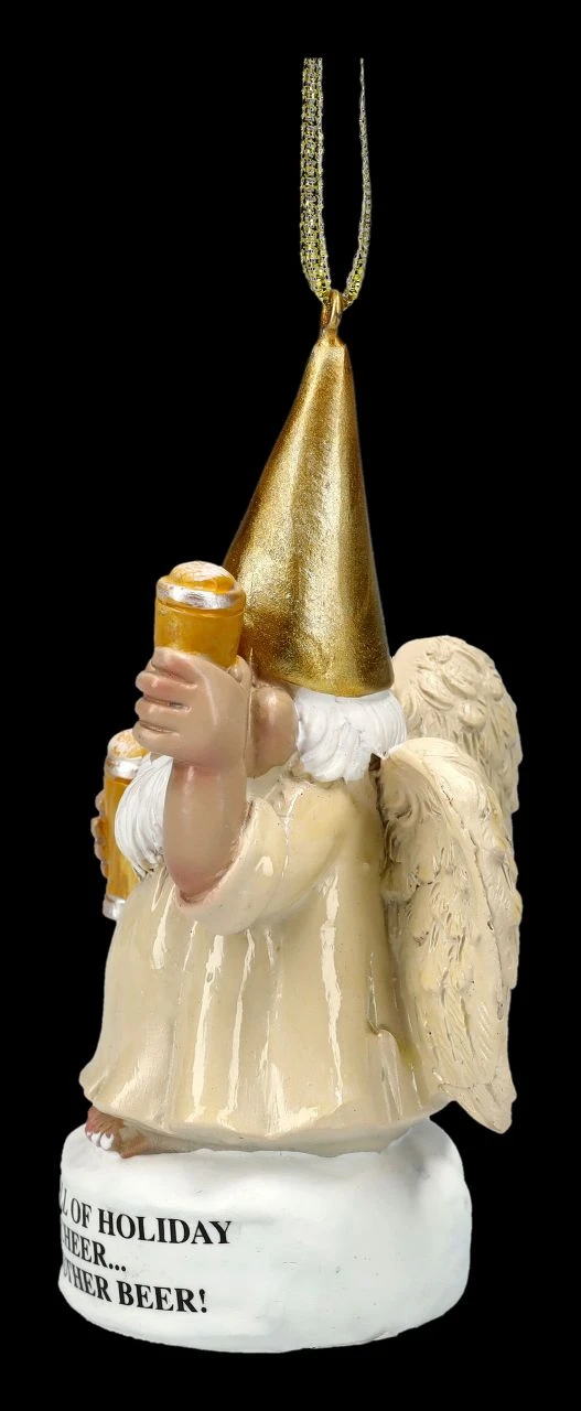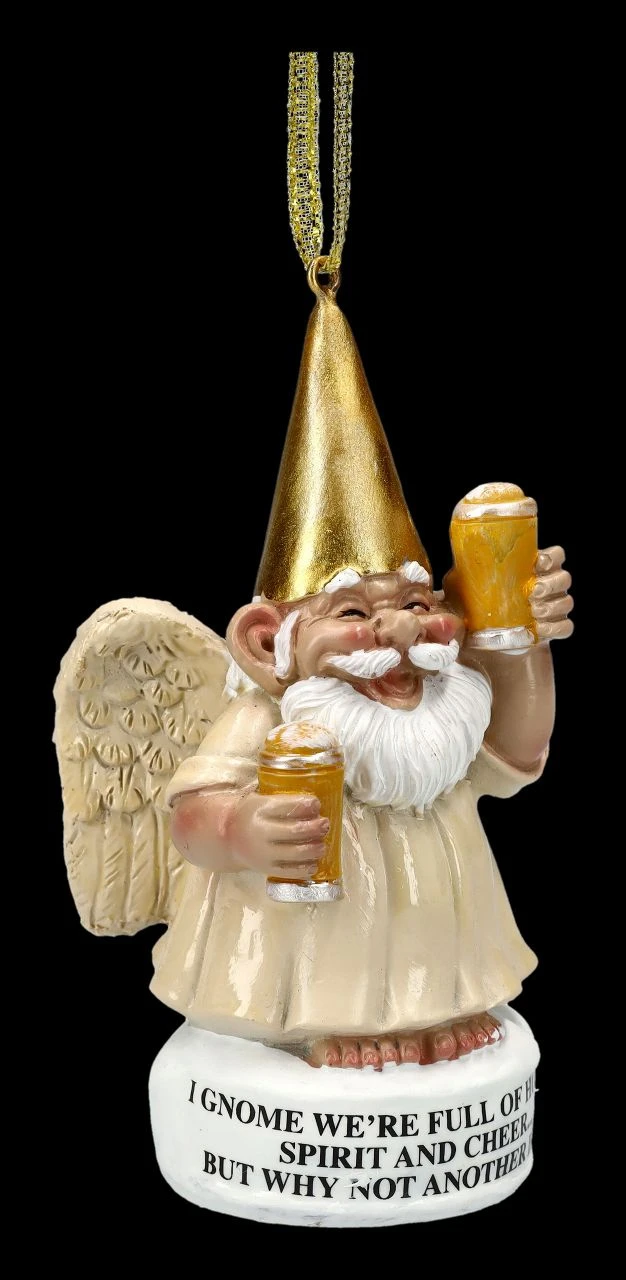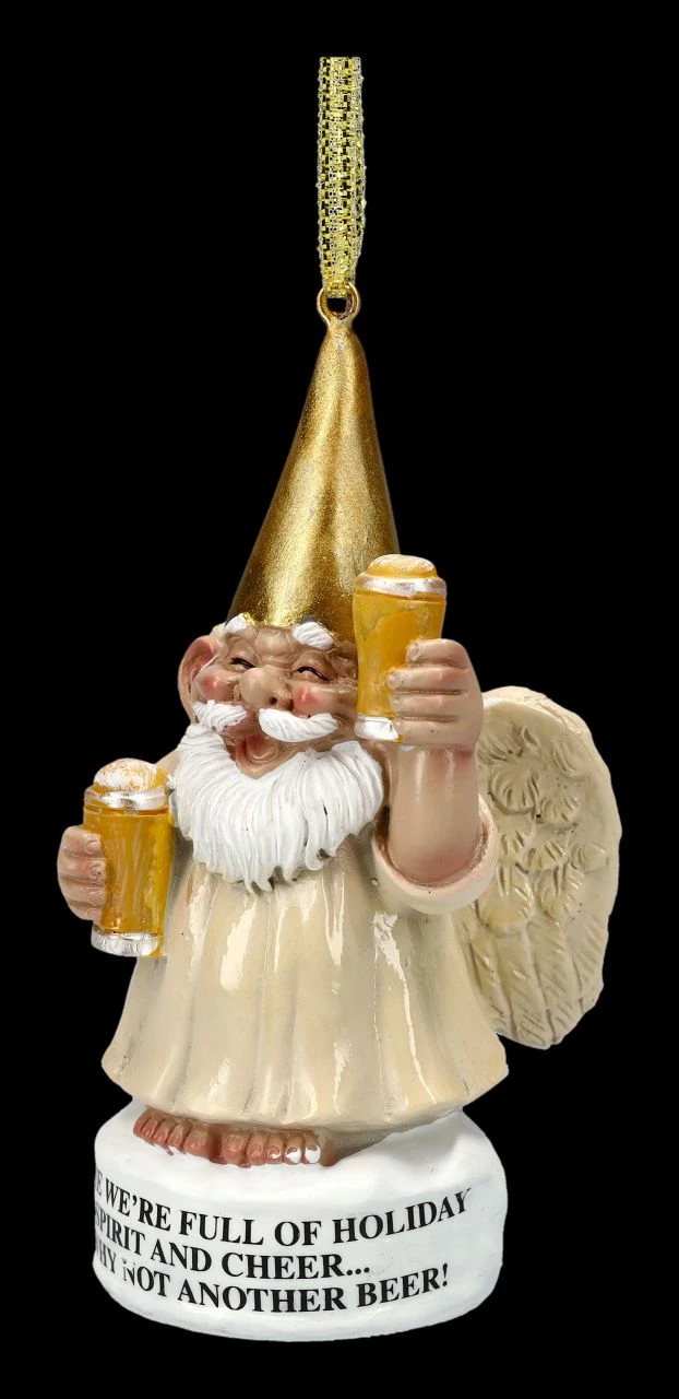 Eine Ähnlichkeit zum Weihnachtsmann lässt nicht verleugnen und für den leidenschaftlichen Gärtner ist es nur natürlich, dass Gartenzwerge auch auf einem Weihnachtsbaum auftauchen – auch mit Engelsflügeln und mit Bier in der Hand… Denn wie steht auf der Wolke doch übersetzt geschrieben: ‚Auch wir Gnome sind voller Feiertagsstimmung und Fröhlichkeit… also warum nicht noch ein Bier…‘ Also Prost! Der lustige Gartenzwerg-Engel als Christbaumschmuck wurde aus handbemaltem Kunststein (Polyresin) gefertigt und ist 10,5 cm hoch, 4,5 cm breit und 4,5 cm tief. Natürlich ist er auch als Geschenkanhänger für den einen oder anderen perfekt geeignet.
