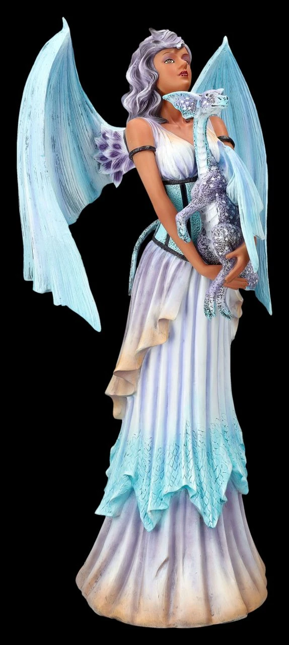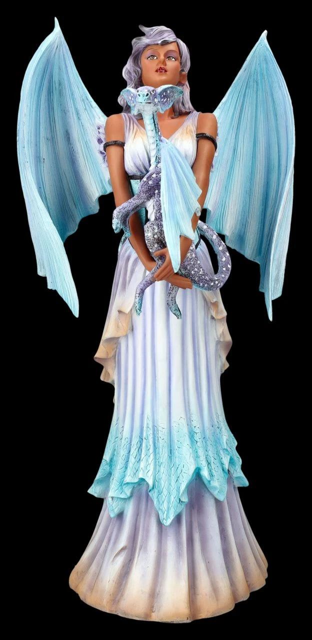 Aufrecht steht der stolze Engel da und hält den ihm anvertrauten Drachen fürsorglich in den Armen. Doch die pastellfarbene Kleidung des schönen Engels soll nicht darüber hinwegtäuschen, dass es sich um einen dunklen Engel handelt, dem man mit Vorsicht begegnen sollte – das beweisen die fledermausartigen Flügel. Die Dark Angel Figur ‚Dragon Keeper‘ der beliebten und berühmten Fantasykünstlerin Amy Brown ist detailreich aus liebevoll handbemaltem Kunststein (Polyresin) entstanden. Die Flügel des beeindruckenden, 42 cm hohen, 21 cm breiten und 17 cm tiefen dunklen Engels sind zum Stecken. Der faszinierende Engel mit dem Drachen ist nicht nur für Sammler ein prächtiges Geschenk.