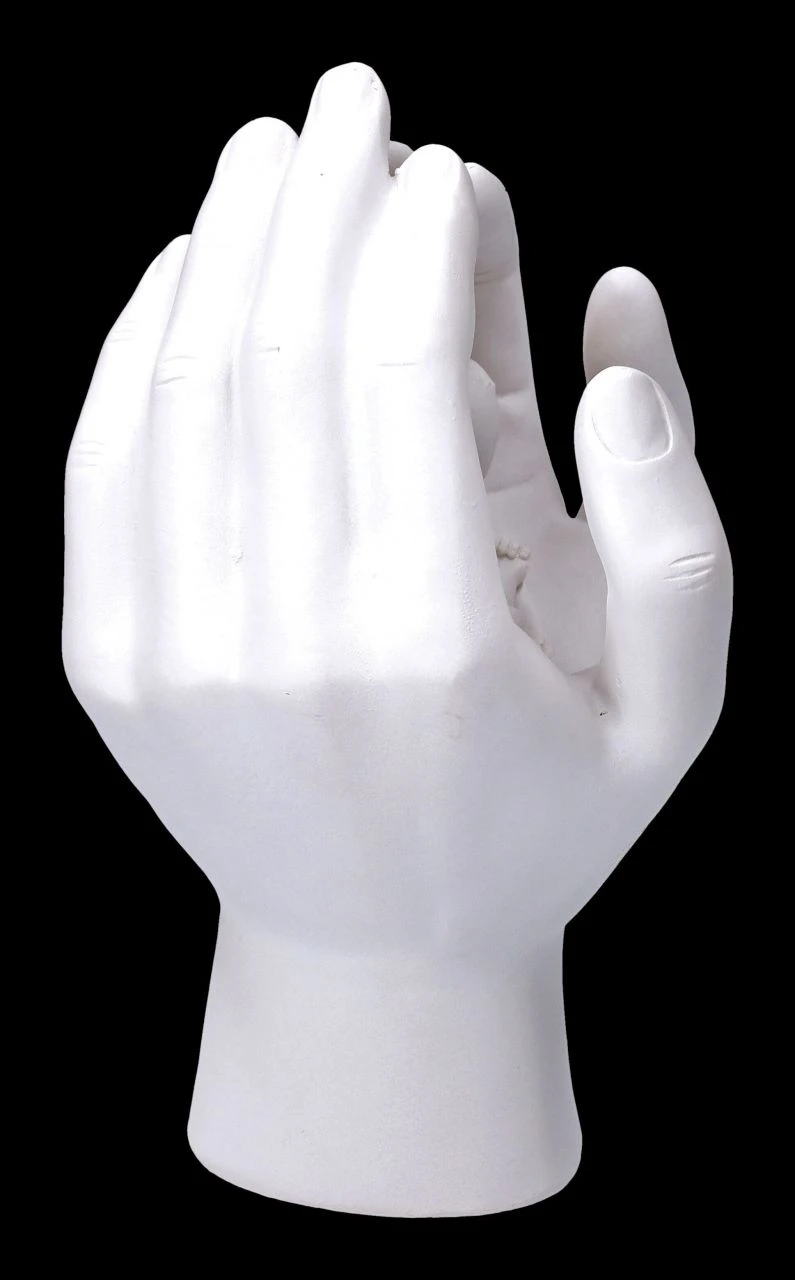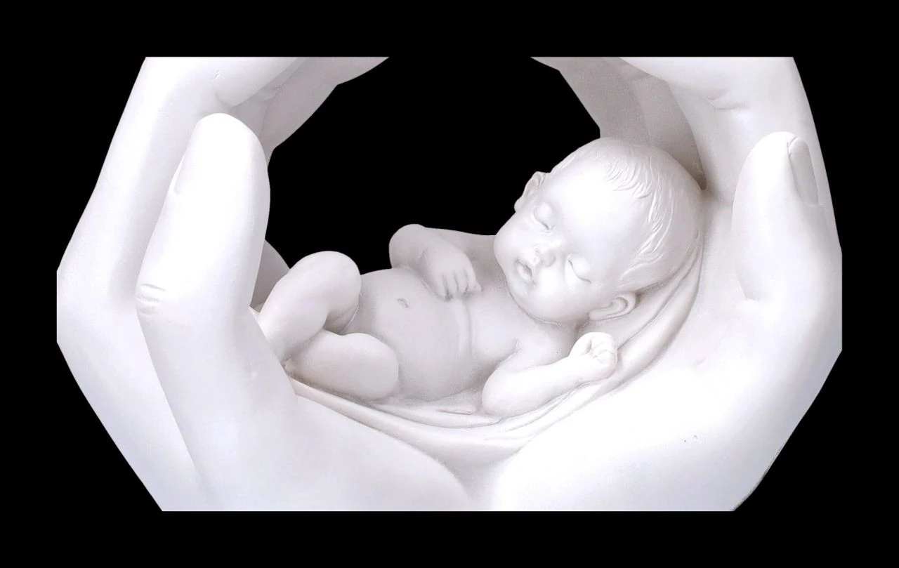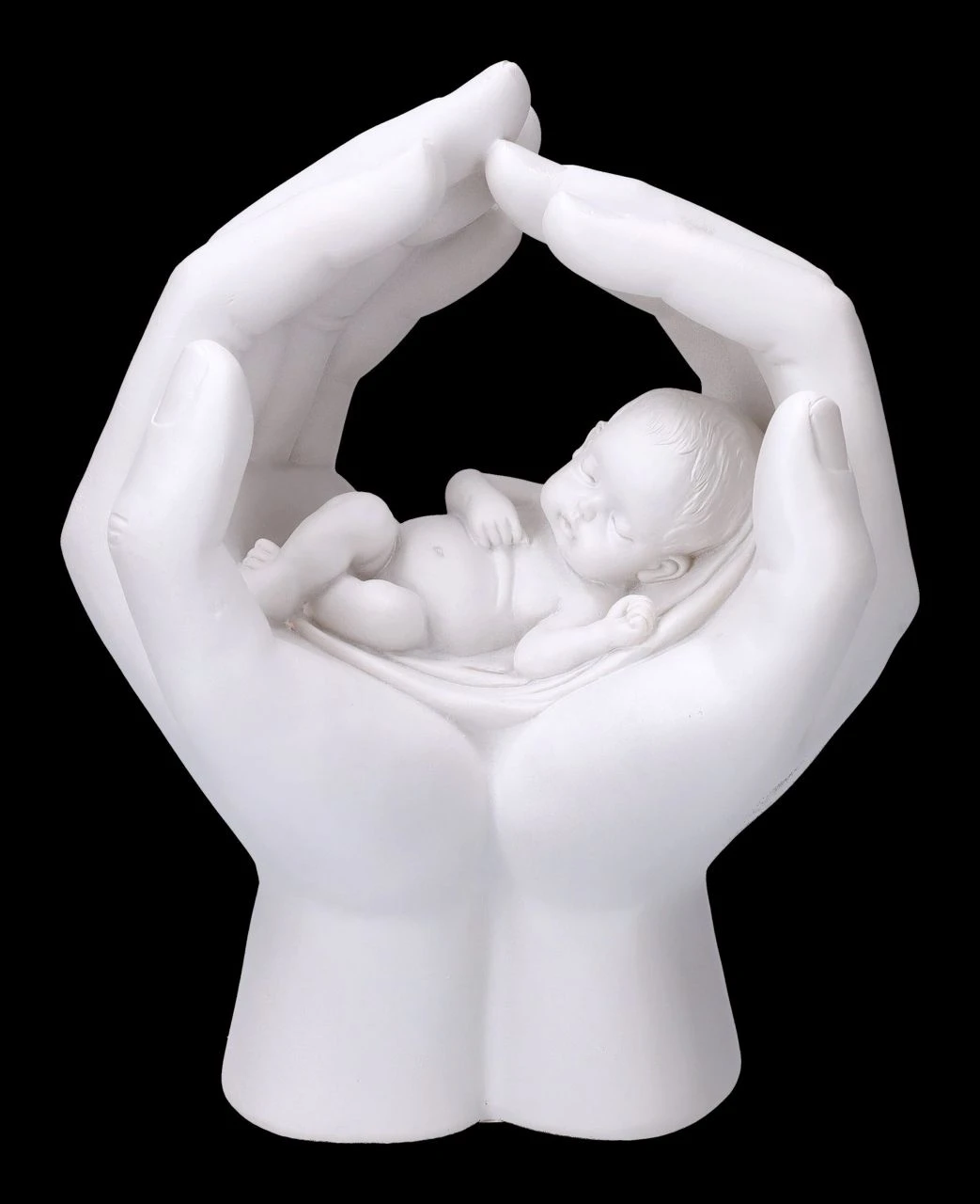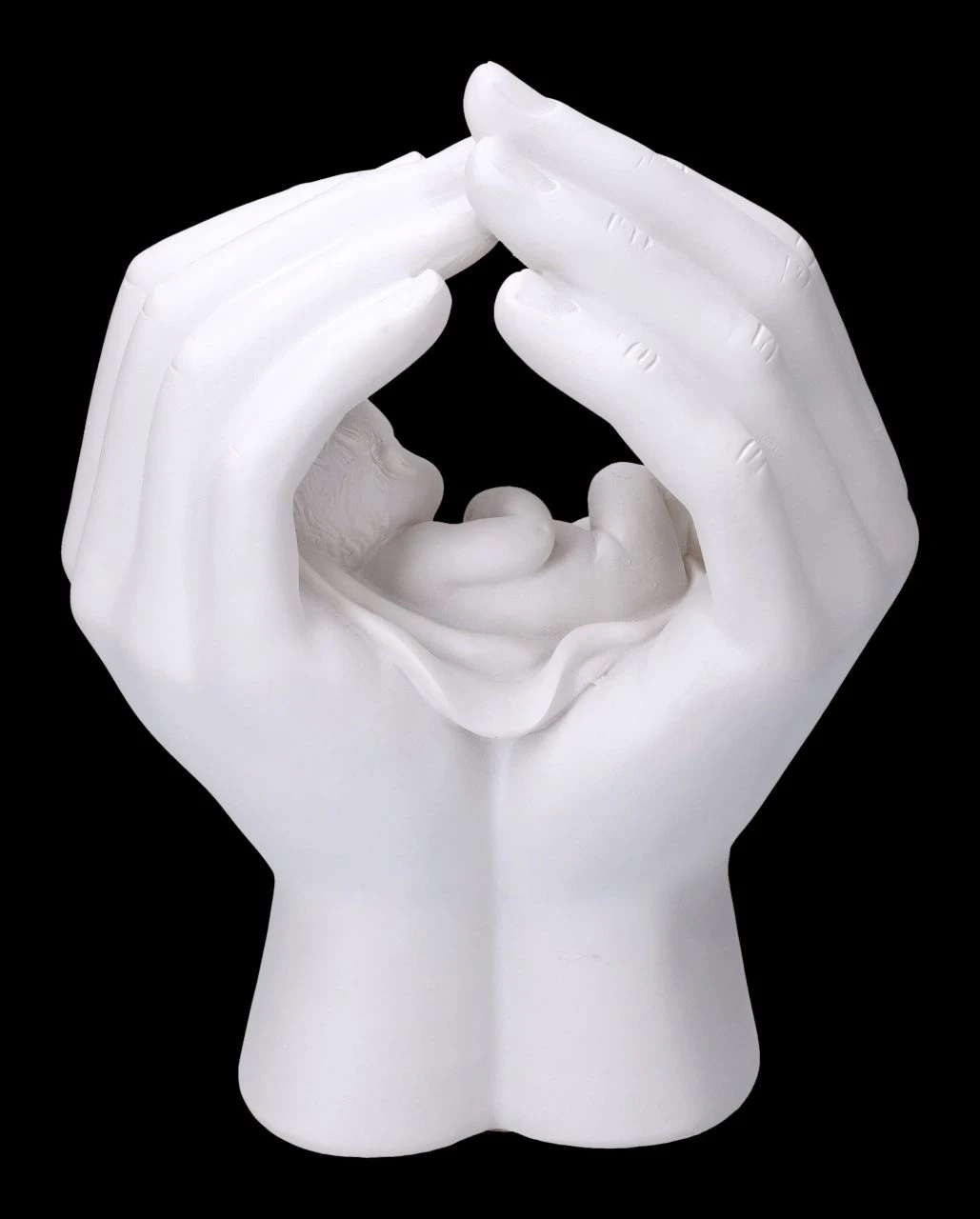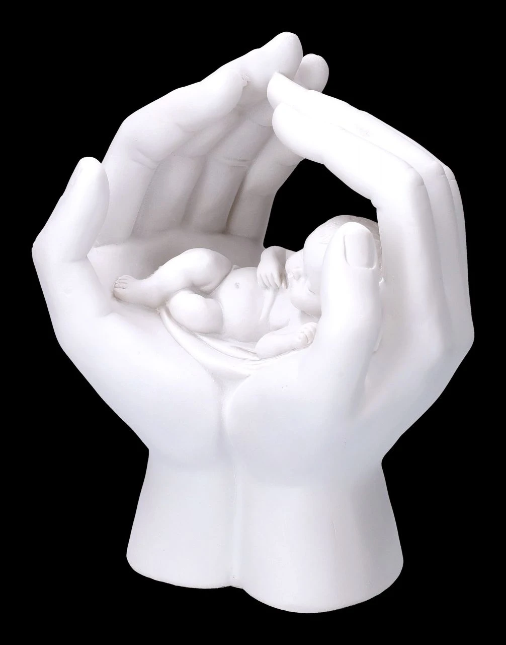 Sorgfältig schützend umfassen die beiden Hände das kleine schlafende Baby und halten es wie in einer Muschel fest. Aus weiß handbemaltem Kunststein (Polyresin) geschaffen, sind die Hände mit dem Baby ein fantastisches Geschenk für werdende Eltern. Shelter ist 17 cm hoch, 14 cm breit und 10 cm tief und mit der zärtlichen Gestaltung sind die schützenden Hände eine wunderbare Dekoration und ein Blickfang in jedem Ambiente.