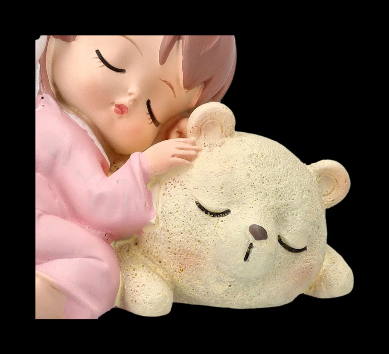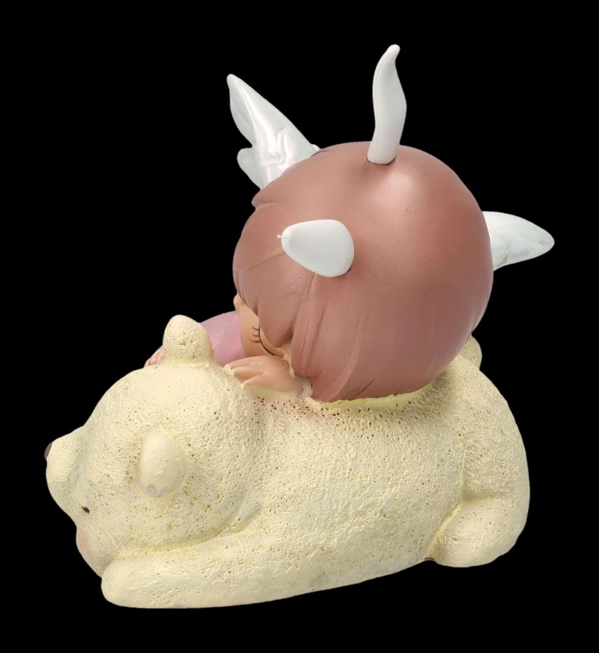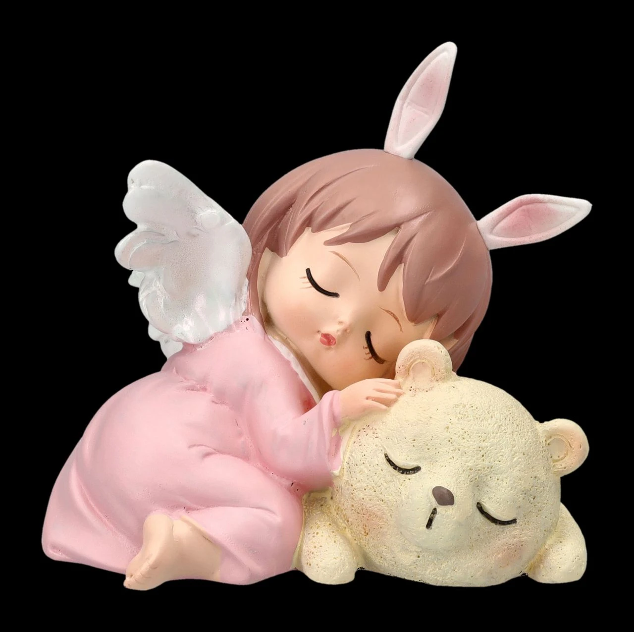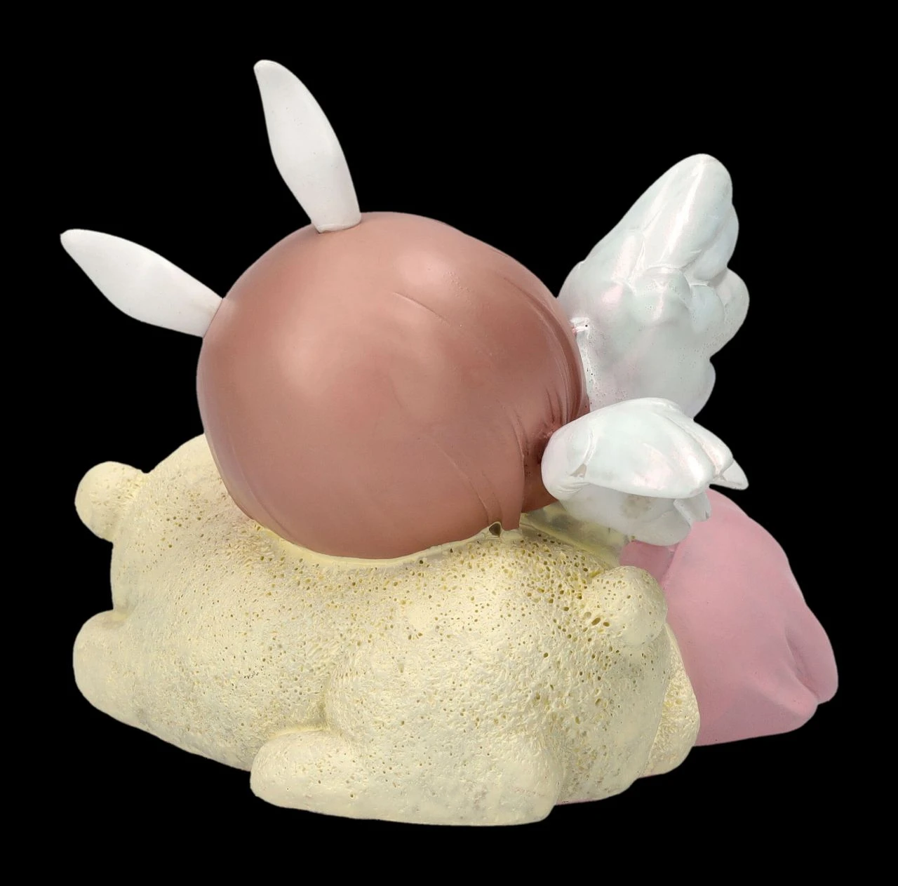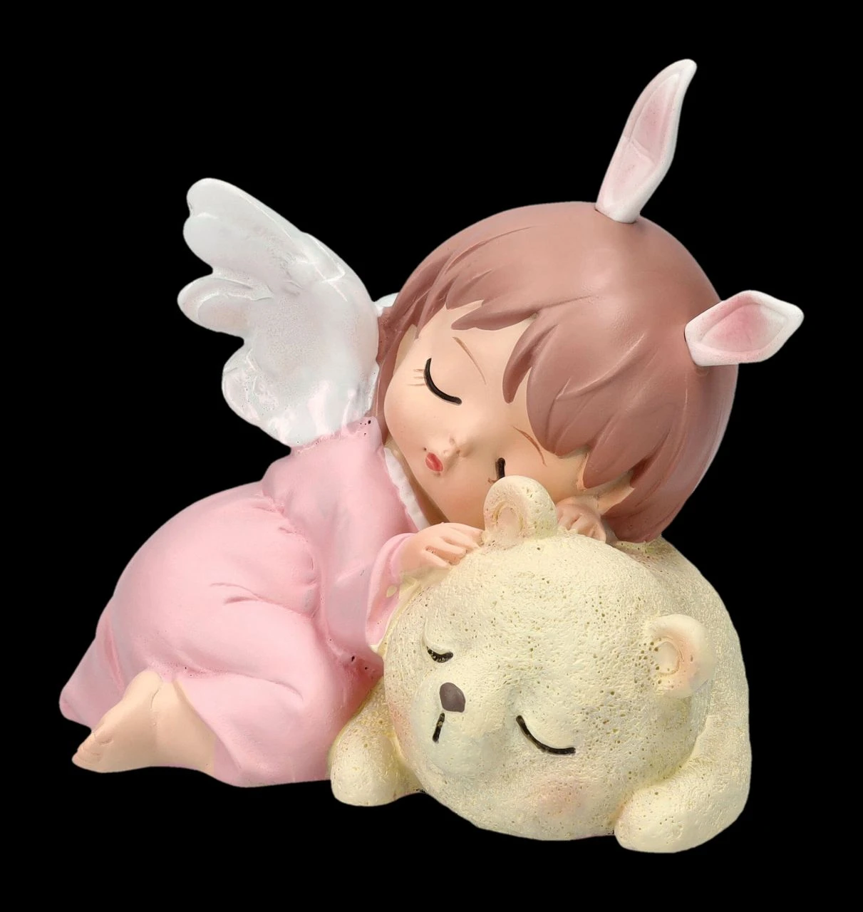 Schon die neugeborenen Bären haben ihren eigenen kleinen Schutzengel. Auch wenn er hier wie ein kleines Häschen aussieht und selig mit dem Bären schlummert. Das 7 cm hohe, 8 cm breite und 7,5 cm tiefe putzige schlafende Engelchen mit dem Bären wurde aus liebevoll handbemaltem Kunststein (Polyresin) gefertigt. Eine niedliche Frühlingsdekoration und ein süßes Geschenk für alle, die Engel lieben.