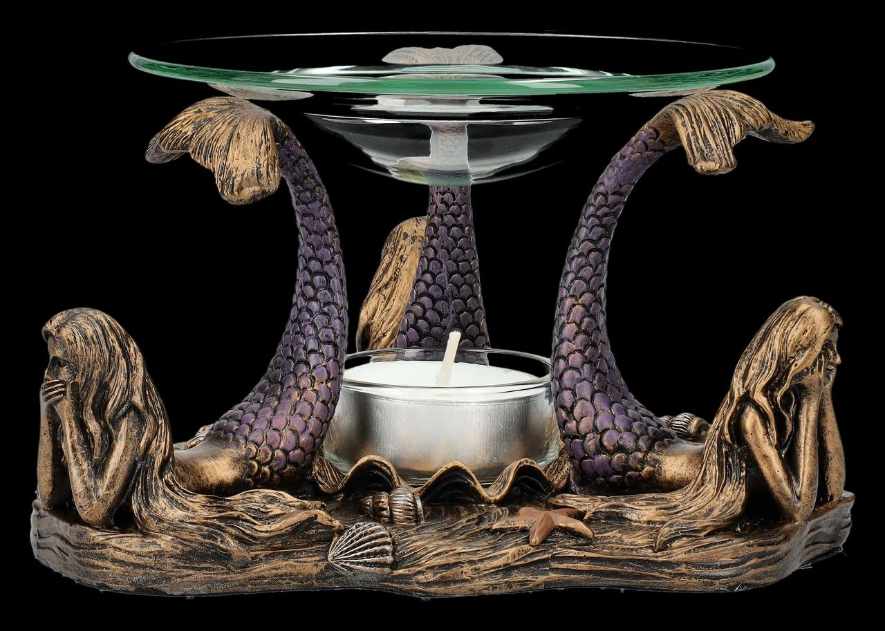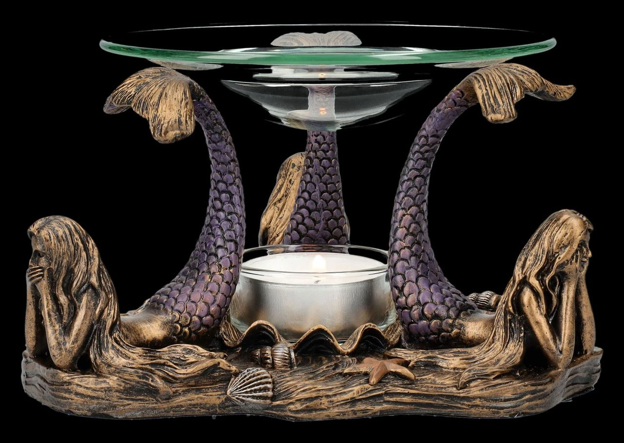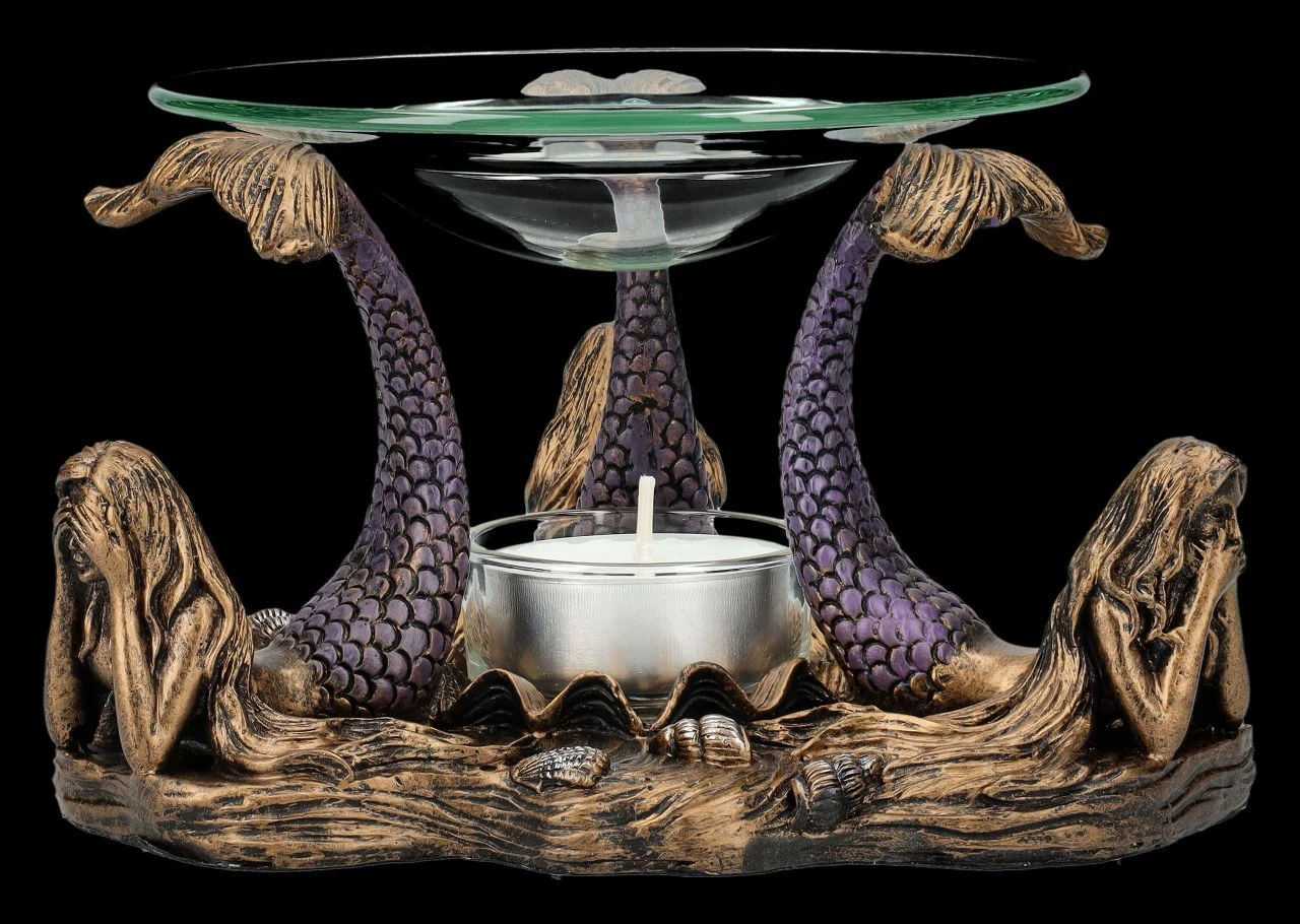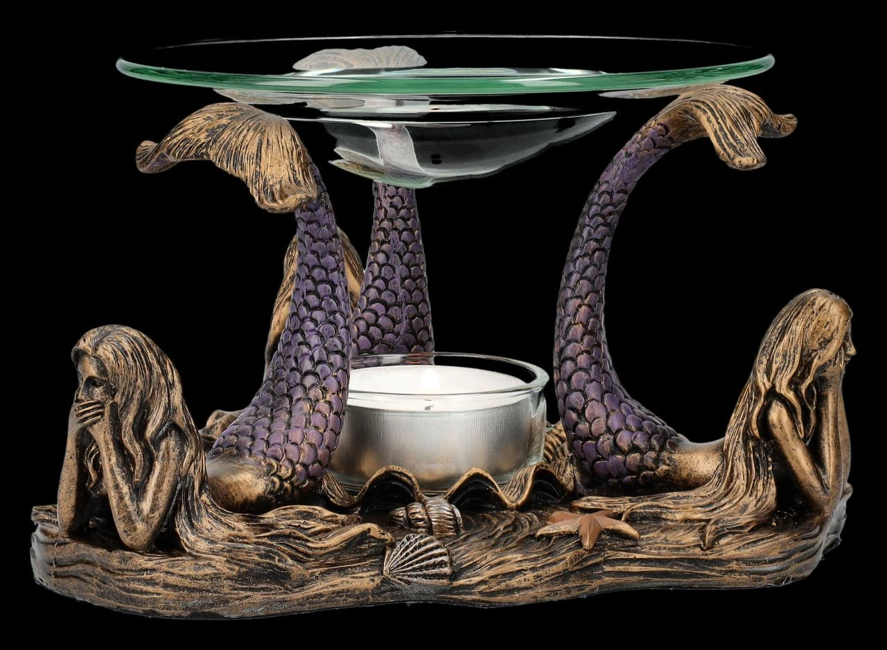 Nicht nur die drei weisen Affen demonstrieren das berühmte japanische Zitat, dass es besser ist, nichts Böses zu sehen, zu hören und schon gar nicht zu sagen. Es hat sich sogar bis zu den magischen Wesen auf dem Meeresgrund herumgesprochen. Und so zeigen die drei zauberhaften Meerjungfrauen, dass auch sie sich an diese Weisheit halten. Dabei balancieren sie auf den Flossen ihrer erhobenen Fischschwänze eine Glasschale mit 12 cm Durchmesser, die als Duftlampe dienen kann. Das Teelicht, das zwischen den drei Grazien auf dem Meeresboden abgestellt werden kann, kann nicht nur das Duftöl erhitzen, sondern beleuchtet auch magisch diese faszinierende Szene. Der Teelichthalter aus handbemaltem Kunststein (Polyresin) ist 9 cm hoch, 15 cm breit und 15 cm tief. Er ist nicht nur dekorativ, sondern auch ein zauberhaftes Geschenk. Die Lieferung erfolgt ohne Teelicht.