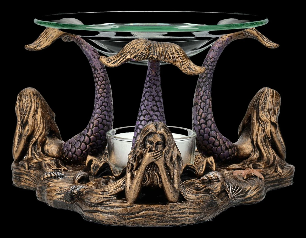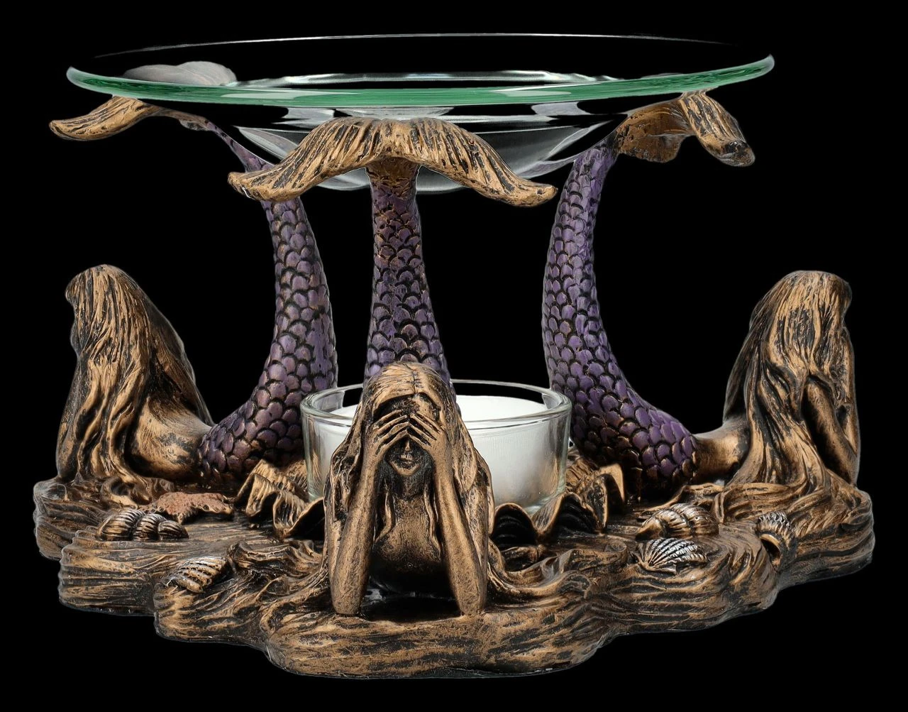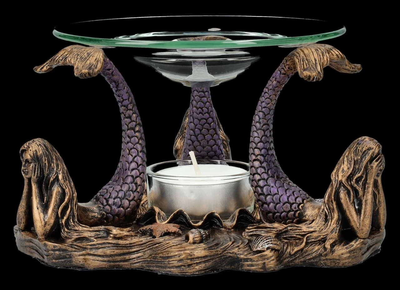 Nicht nur die drei weisen Affen demonstrieren das berühmte japanische Zitat, dass es besser ist, nichts Böses zu sehen, zu hören und schon gar nicht zu sagen. Es hat sich sogar bis zu den magischen Wesen auf dem Meeresgrund herumgesprochen. Und so zeigen die drei zauberhaften Meerjungfrauen, dass auch sie sich an diese Weisheit halten. Dabei balancieren sie auf den Flossen ihrer erhobenen Fischschwänze eine Glasschale mit 12 cm Durchmesser, die als Duftlampe dienen kann. Das Teelicht, das zwischen den drei Grazien auf dem Meeresboden abgestellt werden kann, kann nicht nur das Duftöl erhitzen, sondern beleuchtet auch magisch diese faszinierende Szene. Der Teelichthalter aus handbemaltem Kunststein (Polyresin) ist 9 cm hoch, 15 cm breit und 15 cm tief. Er ist nicht nur dekorativ, sondern auch ein zauberhaftes Geschenk. Die Lieferung erfolgt ohne Teelicht.