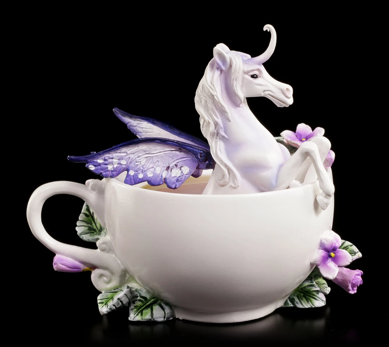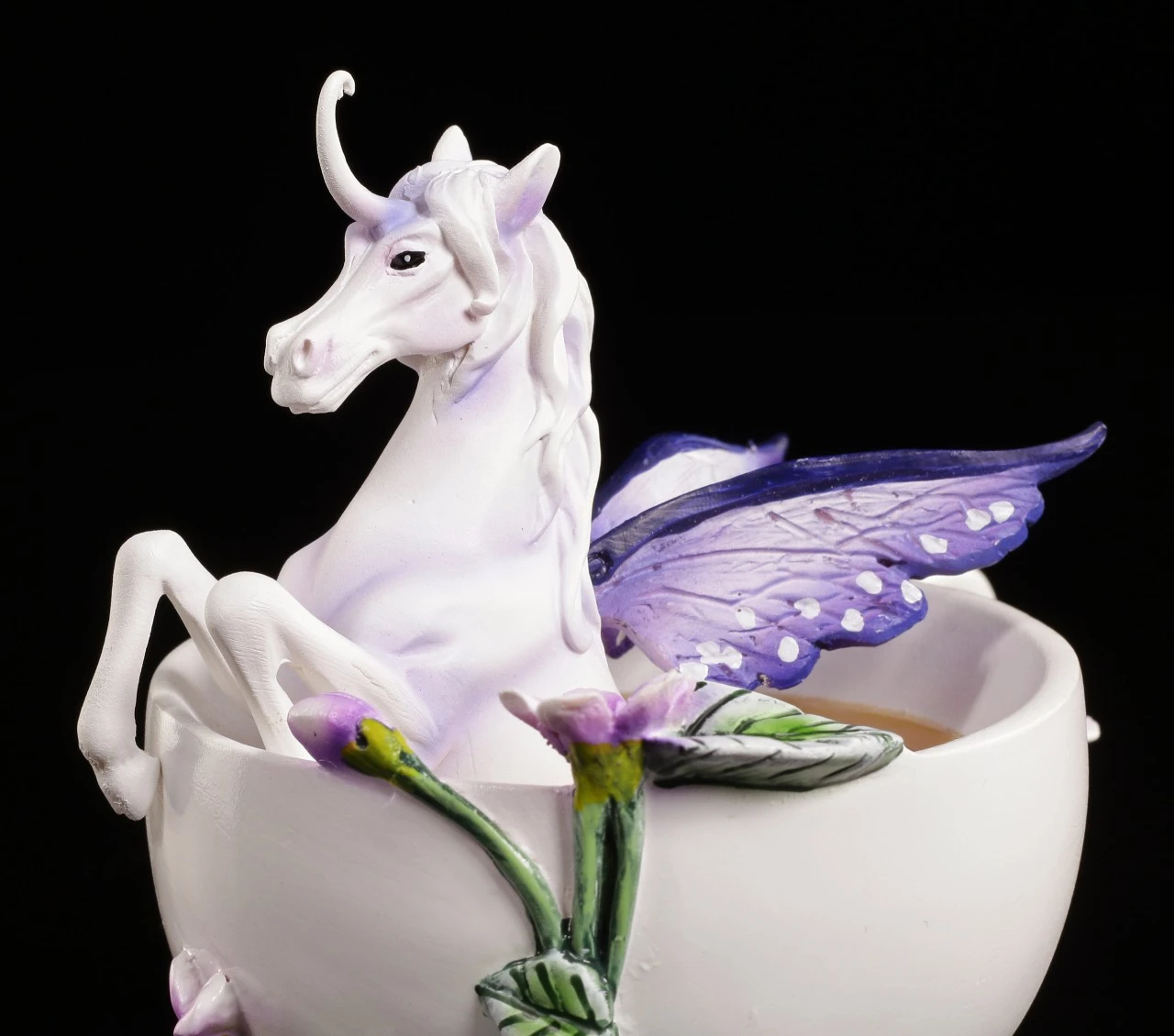 Das niedliche freche Einhorn gönnt sich ein Bad in einer Teetassse. Das Einhorn ist ein liebevolles Geschenk an einen Einhorn Liebhaber.