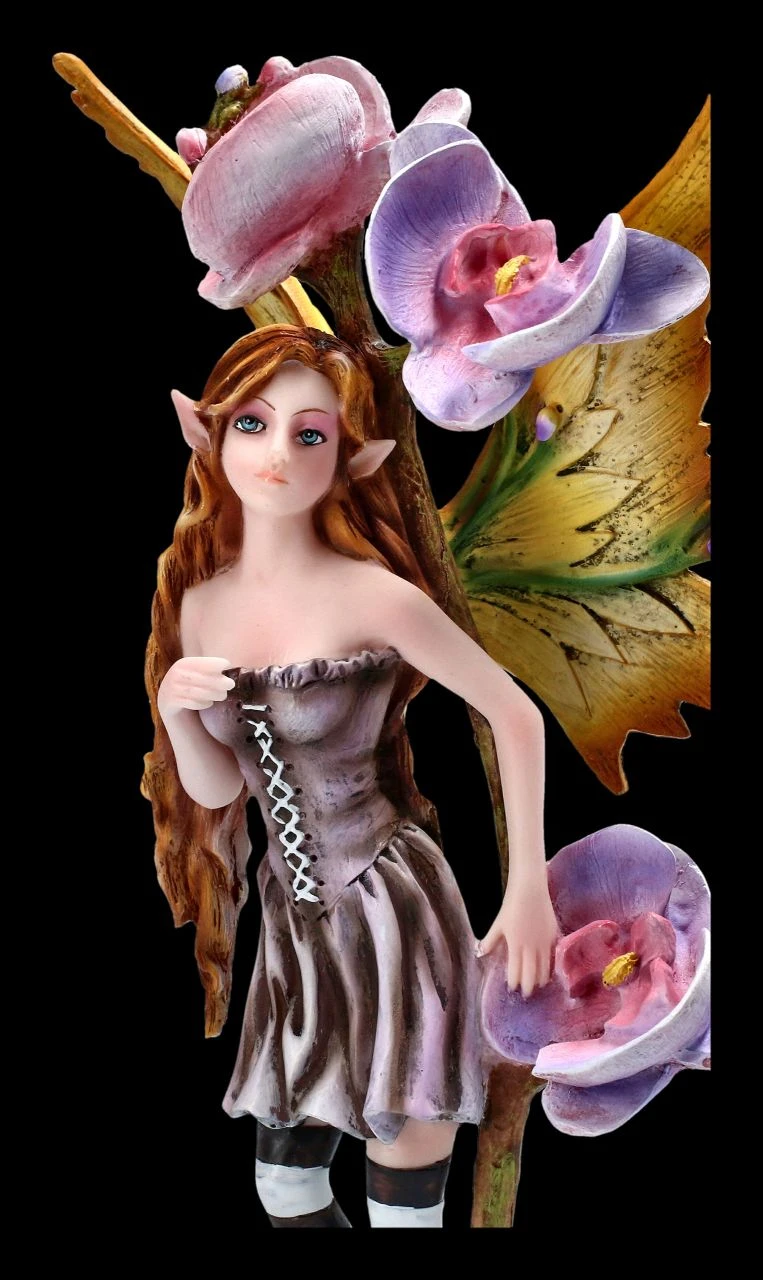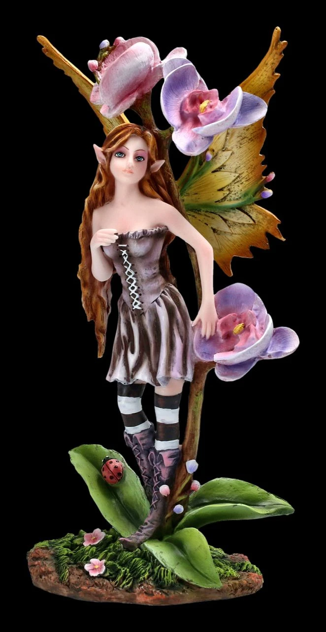 Mit unschuldigem Blick steht die Elfe Bluma vor einer wunderschön detaillierten Orchidee. Auf einem Blatt der Orchidee hat sich ein Marienkäfer nieder gelassen. Dass die niedliche Elfe aber genau weiß was sie will, zeigt sie schon mit ihrer Kleidung. Angefangen von den geschnürten Stiefeln, bis zu den geringelten Strümpfen und dem frechen Kleid strahlt Bluma Selbstbewusstsein aus. Aus sehr liebevoll handbemaltem Kunststein (Polyresin) gefertigt, freut sich jeder Orchideen- und Elfen-Freund über diese niedliche Elfen-Figur in wunderschönen Farben. Die Elfe Bluma ist 23 cm hoch, 11 cm breit und hat eine Tiefe von 8,5 cm. Die Flügel der Elfe sind zum Stecken. Auf der Blumenbank findet die Elfe Bluma sicher den passenden schönen Platz zwischen blühenden Orchideen.