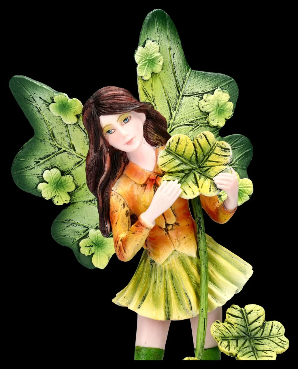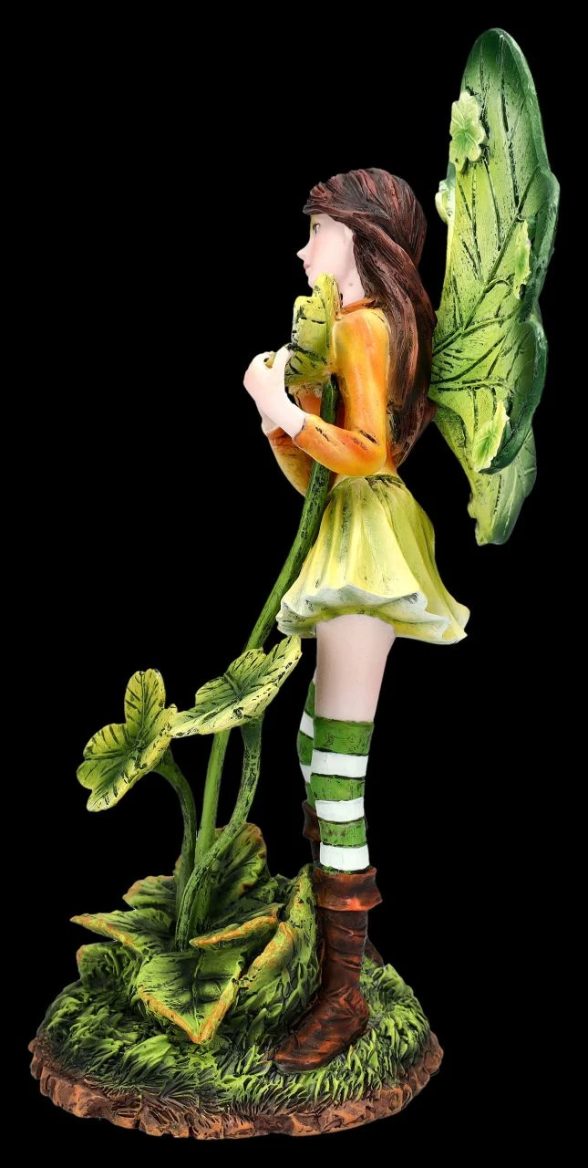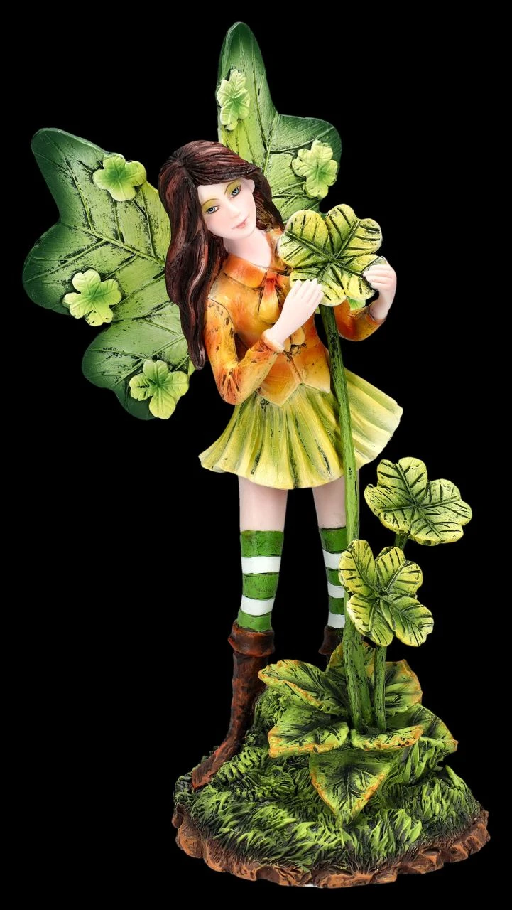 Hinter einem vierblättrigen Kleeblatt schaut neckisch die niedliche Glücksfee Indis hervor. Mit ihren Kleeblatt-Flügeln ist sie doch ein ganz bezaubernder Glücksbote und mit ihren grün geringelten Strümpfen schaut sie doch absolut niedlich aus. Die Flügel der 20,5 cm hohen, 10 cm breiten und 9,5 cm tiefen Elfenfigur aus liebevoll handbemaltem Kunststein (Polyresin) sind zum Stecken. Glück ist relativ und hat für jeden eine andere Bedeutung und es gibt zahlreiche Symbole. Ein vierblättriges Kleeblatt ist aber für viele ein wichtiges Glückssymbol – und das sicher nicht nur zu Neujahr. Daher ist die Glücksfee Indis doch ein perfektes Geschenk für alle, denen Sie Glück wünschen möchten.