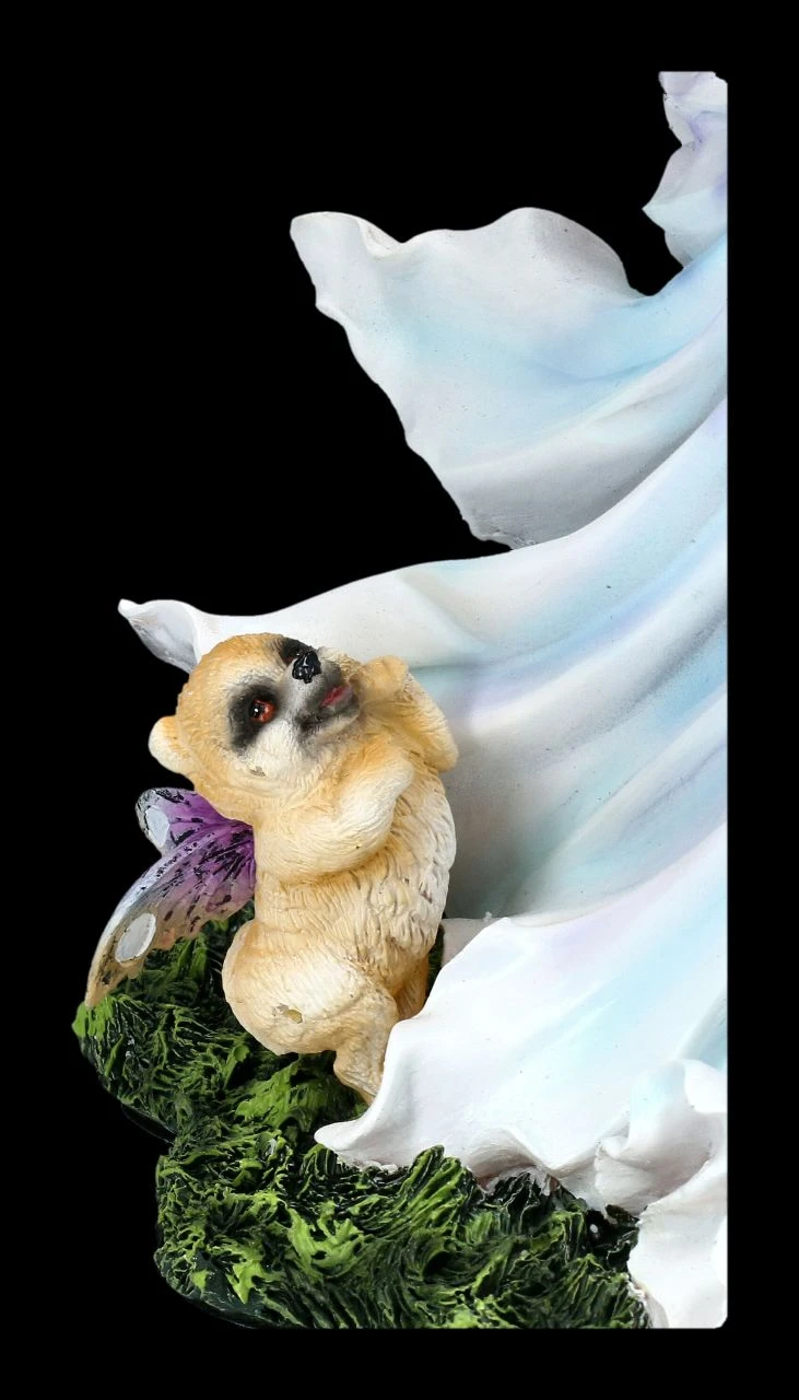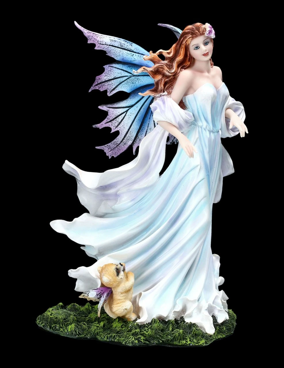 Wie ein Windhauch oder ein Engel schwebt die Elfe Heavana in Ihr Heim. In ihr langes rotes Haar hat sie eine Blüte gesteckt. Ihr kleines, putziges Seelentier mit dem braunen Fell und den rosa Flügeln ist vor ihr auf dem Rasenstück gelandet und möchte jetzt unbedingt hoch gehoben werden. Heavana ist in ein langes, zart hellblaues Kleid gehüllt. Ihre Stola, die sie über dem Rücken und den Armen trägt, wirkt wie eine weiße Wolke. Die Elfe Heavana ist aus detailreich handbemaltem Kunststein (Polyresin) gefertigt. Sie ist 26,0 cm hoch, 18,0 cm breit und 23,0 cm tief. Ihre filigranen blauen Flügel mit den lila Spitzen und Einsprenkeln sind zum Stecken. Heavana ist ein liebevolles Geschenk für Elfen-Sammler.
