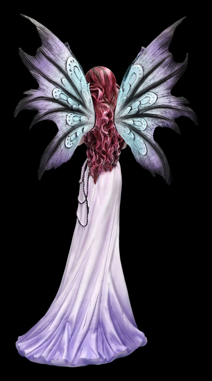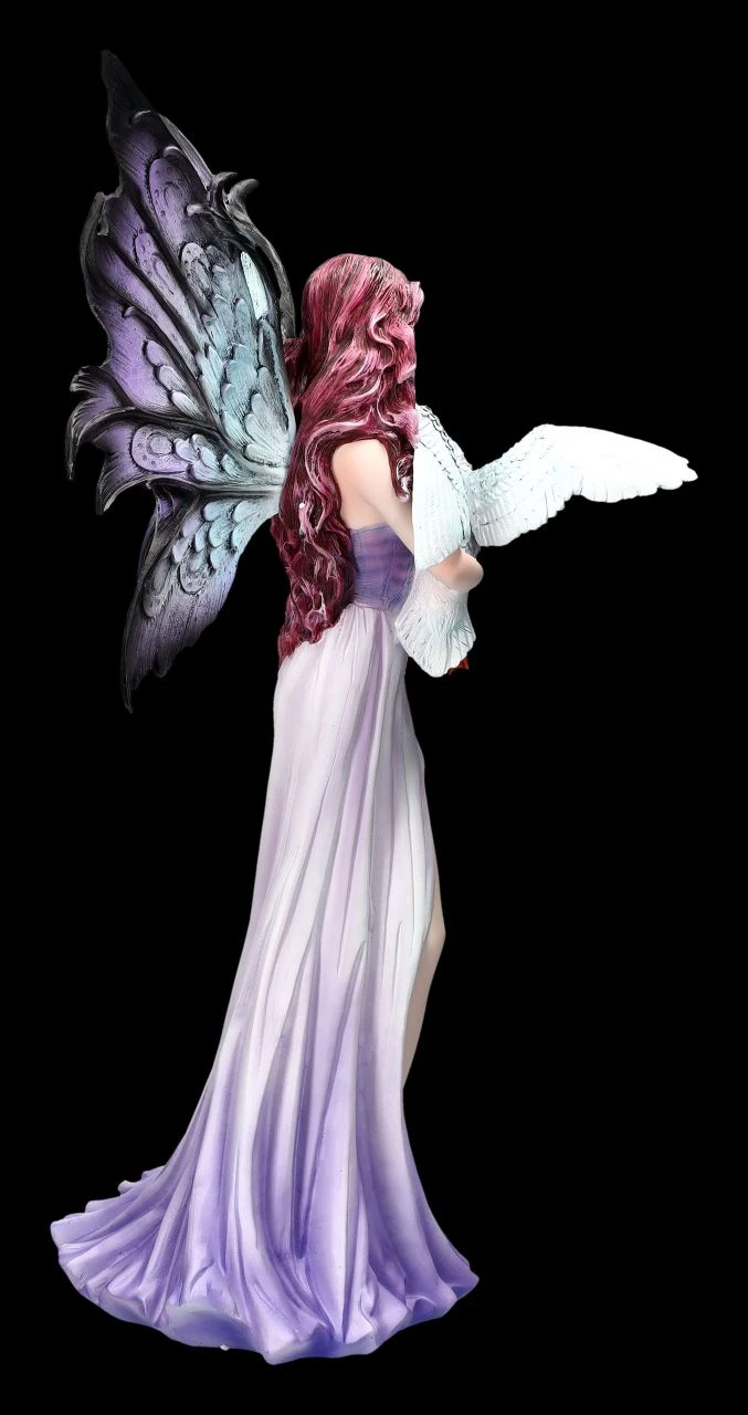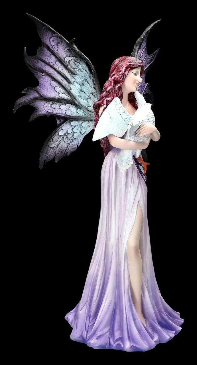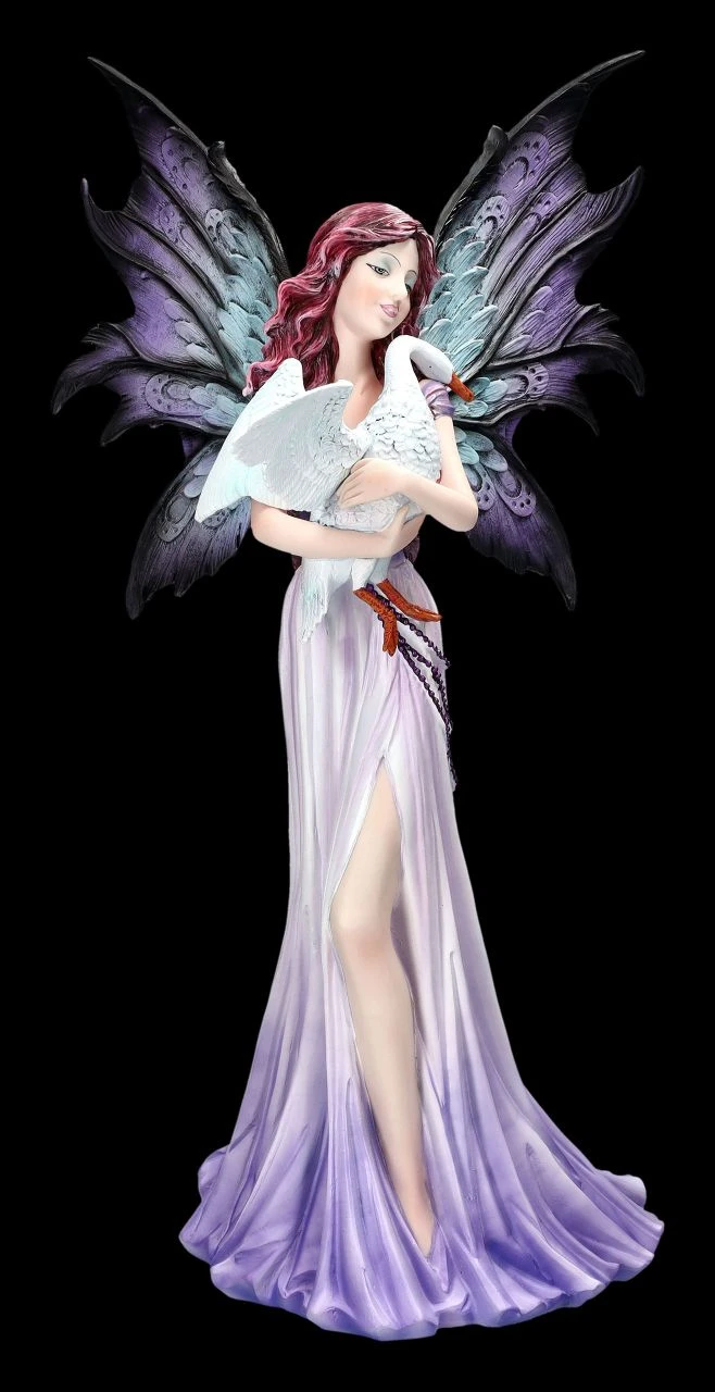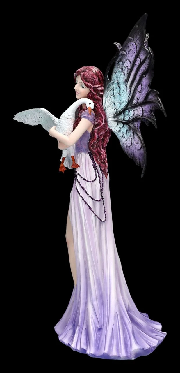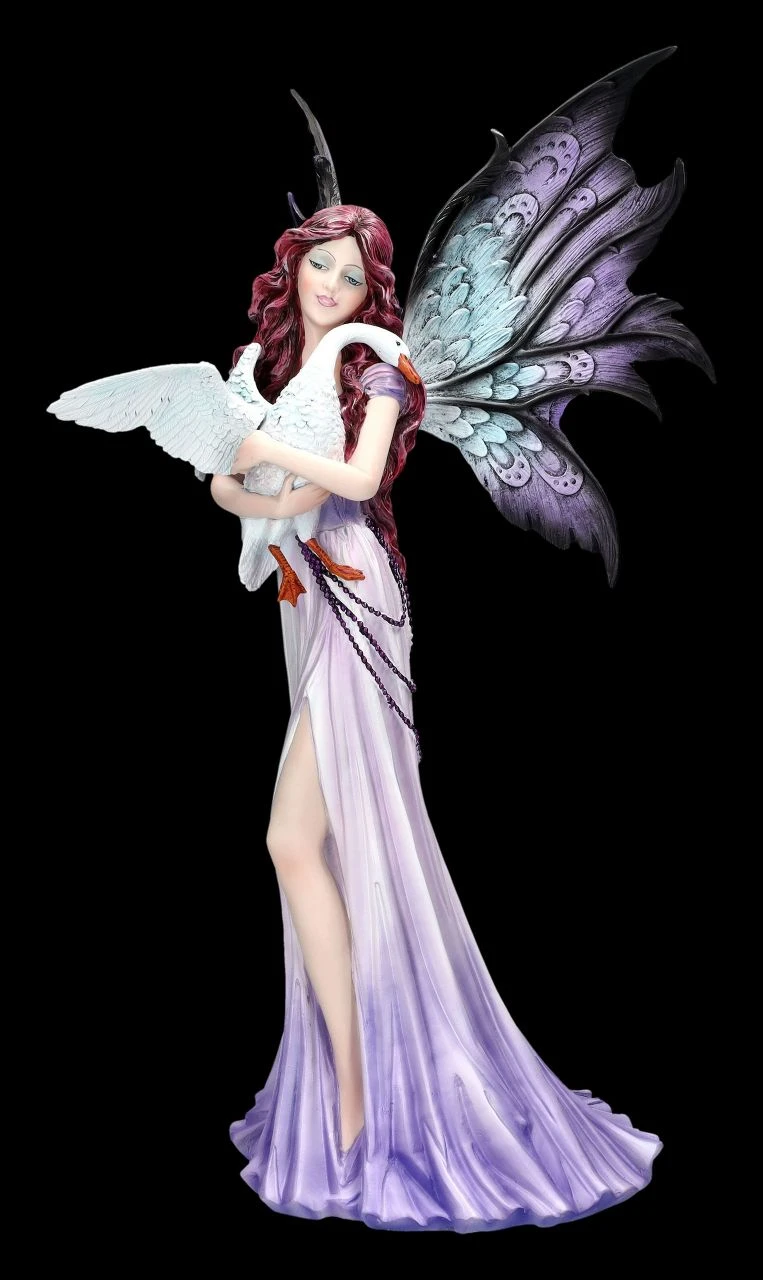 Zärtlich schmiegt der Schwan seinen Kopf an den Hals der wunderschönen Elfe Kassandra. In der griechischen Mythologie gab einst Gott Apollon ihrer Namensschwester, betört von ihrer Schönheit, die Gabe der Weissagung. Auch die Elfe Kassandra ist nicht nur schön, sondern hat ebenfalls diese Gabe. So konnte sie den verzweifelten Kampf des schönsten der weißen Schwäne gegen Unholde im See entdecken und ihn retten. Nachdem sie die Unholde vertrieben und den Schwan von seinen Verletzungen geheilt hatte, will sie ihn wieder zu seinen Gewässern bringen. Allerdings sieht es so aus, dass er lieber in ihren Armen bleiben möchte. Kein Wunder, denn die Elfe Kassandra mit den roten langen Haaren sieht in ihrem seidig fallenden Kleid und mit den schönen Flügel in den Farben eines Nachtfalters einfach herrlich aus. Die beeindruckende Elfe Kassandra mit dem Schwan ist 47 cm hoch, 23 cm breit und 18 cm tief. Sie wurde aus liebevoll handbemaltem Kunststein (Polyresin) gefertigt und ist auch ein wunderbares Geschenk für jeden, der von der mystischen Welt der Elfen begeistert ist.