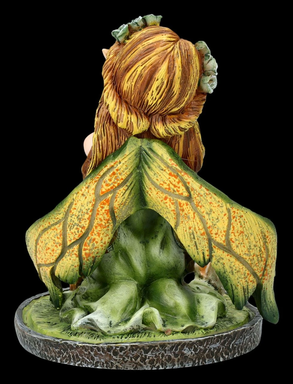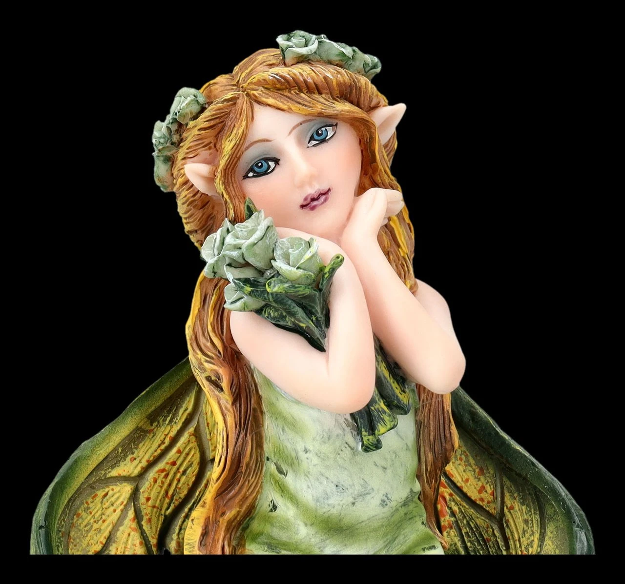 Die kleine Elfe Morsna liebt nicht nur die wunderschönen Rosenblüten, sondern auch den betörenden Duft der Rosen über alles. Nun kniet sie neben einem Schmetterling auf der grünen Waldlichtung und hält voll Begeisterung die ersten Rosen in ihren Armen. Auch ihre langen rötlichen Haare hat sie mit Rosenblüten geschmückt. Die niedliche kleine Elfe Morsana mit den Rosen in dem zartgrünen Kleidchen und den wie Blütenblätter wirkenden Flügeln ist eine zauberhafte Deko zwischen den Pflanzen auf der Blumenbank. Die süße Elfen-Figur ist aus liebevoll handbemaltem Kunststein (Polyresin) und 9 cm hoch, 7 cm breit und 7 cm tief. Morsana ist auch ein perfektes kleines Geschenk für alle, die sich gerne mit mystischen Elfen umgeben