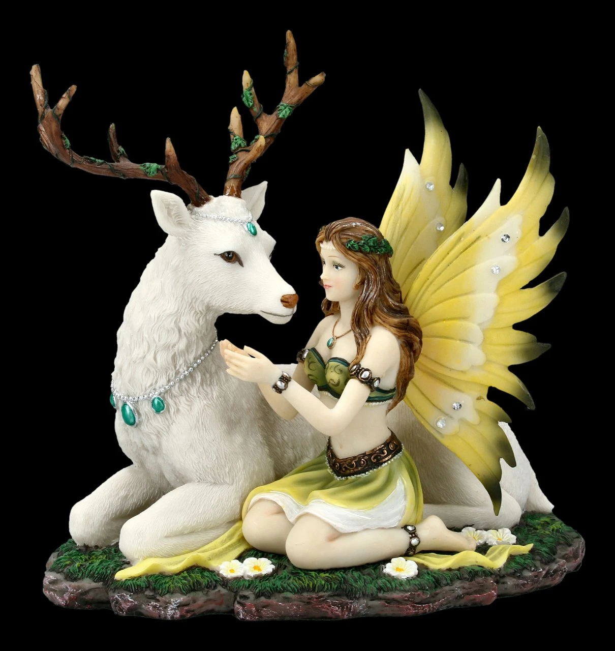 Liebevoll kümmert sich die hübsche Elfe um den König der Wälder, einem stattlichen weißen Hirsch. Ihr gelb-weißes Kostüm lässt sie sinnlich und zugleich zart wirken und harmoniert hervorragend mit ihren gelben, mit kleinen glänzenden Schmucksteinen verzierten Flügeln. Die Elfe und der weiße Hirsch sind nicht nur für die herbstliche Jahreszeit eine schöne Dekoration in Ihrer Wohnung.