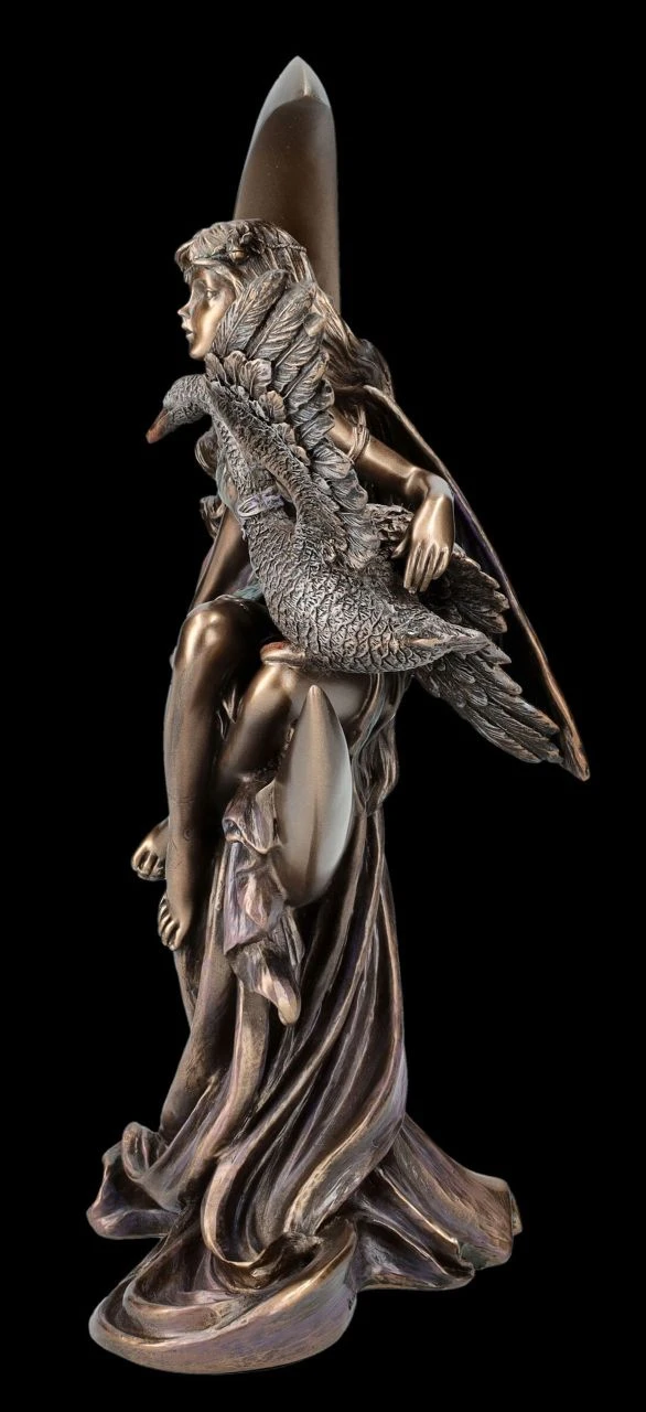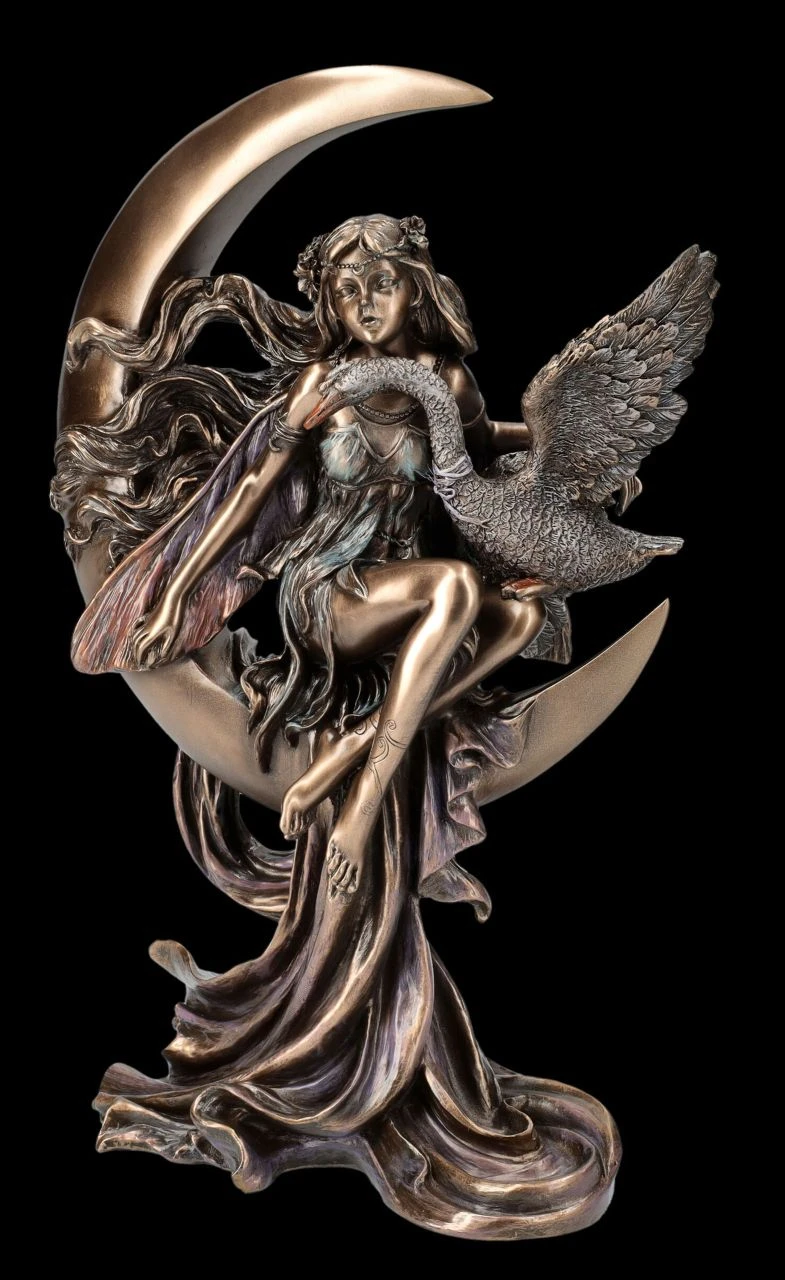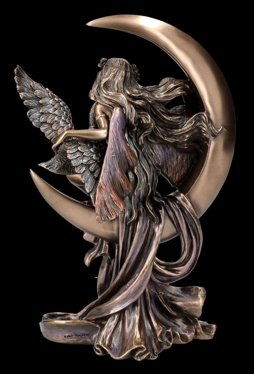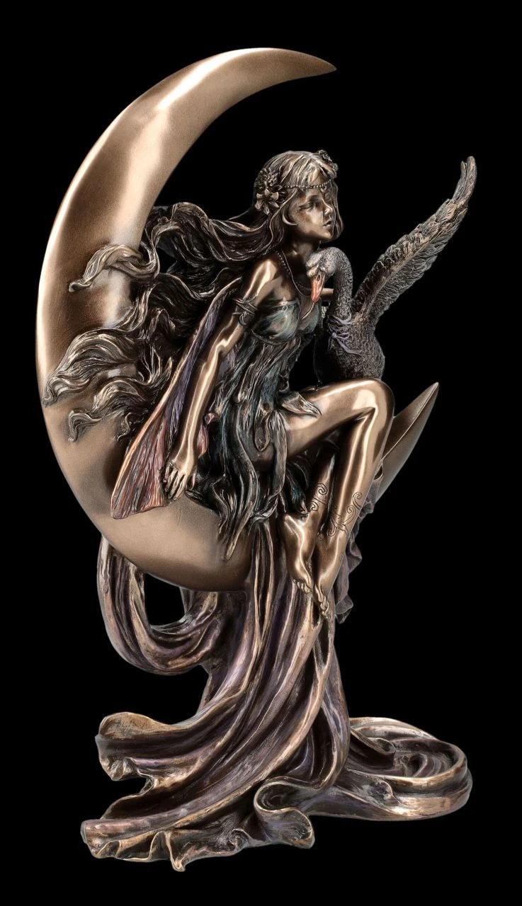 Die entzückende Mondelfe ist mit ihrem Freund, dem großen Schwan, um die Wette geflogen und hat gerade ihren Aussichtsplatz auf dem Mond eingenommen. Ihre langen Locken flattern noch durch den stürmischen Flug und da landet auch schon der schöne Schwan auf ihren nackten Knien. Bis zu den feinen Gesichtszügen der bezaubernden Elfe, den mit Blüten geschmückten langen Locken und dem fließenden Kleid, das wie ein Nebel weit über die Mondsichel bis auf den Boden reicht und dem schönen Schwan mit den großen Flügeln ist diese faszinierende Elfen-Figur aus der Studio Collection von Veronese wunderschön und detailreich aus hochwertigem Kunststein (Polyresin) gefertigt. Durch die edle Bronzierung und sehr feine und abgestimmte Colorierung wirkt diese zauberhafte Elfenskulptur beinahe wie eine Arbeit aus der Jugendstilzeit. Die 24,5 cm hohe, 16 cm breite und 10 cm tiefe entzückende Elfe mit dem Schwan auf dem Mond ist ein wahres Schmuckstück in jedem Ambiente. Die zauberhafte Mondelfe ist für jeden Sammler und für alle, die die fantasievolle Welt der Elfen lieben, ein wunderschönes Geschenk.