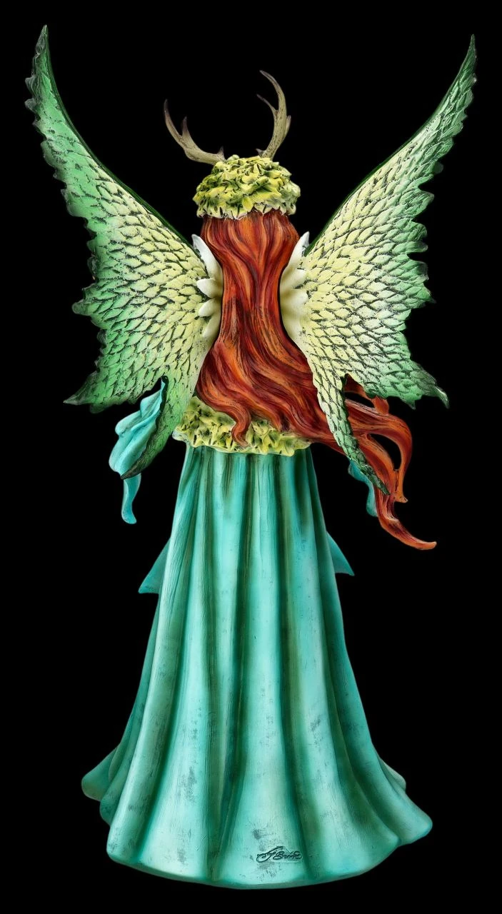 Wer mit offenen Augen durch einen Wald spaziert, wo sich Fuchs und Hase ‚Gute Nacht‘ sagen, hat manchmal das Gefühl, dass magische Wesen jeden Schritt beobachten. Denn auch die Tiere des Waldes und all die magischen Wesen haben Schutzengel. Wie diese wunderbare Waldelfe, die von den Tieren des Waldes freudig begrüßt wird. ‚Caretaker‘ nennt die beliebte amerikanische Fantasy- und Gothic-Künstlerin Amy Brown diese bezaubernde Elfe. Hoch aufgerichtet steht die schöne Elfe mit dem Blätterkranz und dem Geweih auf den roten Locken und dem wunderschönen Kleid einer königlichen Waldelfe mit den Tieren auf dem Waldboden. Auf ihren ausgebreiteten Händen haben sich eine Eule und ein Rabe ihren Platz gesucht. Die beeindruckende Elfen-Figur mit den Waldtieren von Amy Brown ist bis zu den einzelnen Details aus liebevoll handbemaltem Kunststein (Polyresin) entstanden. Die zu dem Elfenkleid passenden Flügel sind zum Stecken. Die wunderschöne Elfe-Figur ist 46 cm hoch, 23 cm breit und 18 cm tief und nicht nur ein perfektes Geschenk, sondern auch eine wunderbare Ergänzung einer Sammlung und sollte einen Platz finden, an dem sie bewundert werden kann.