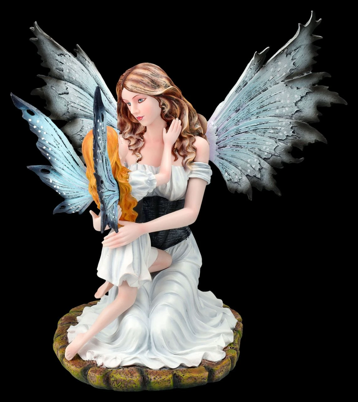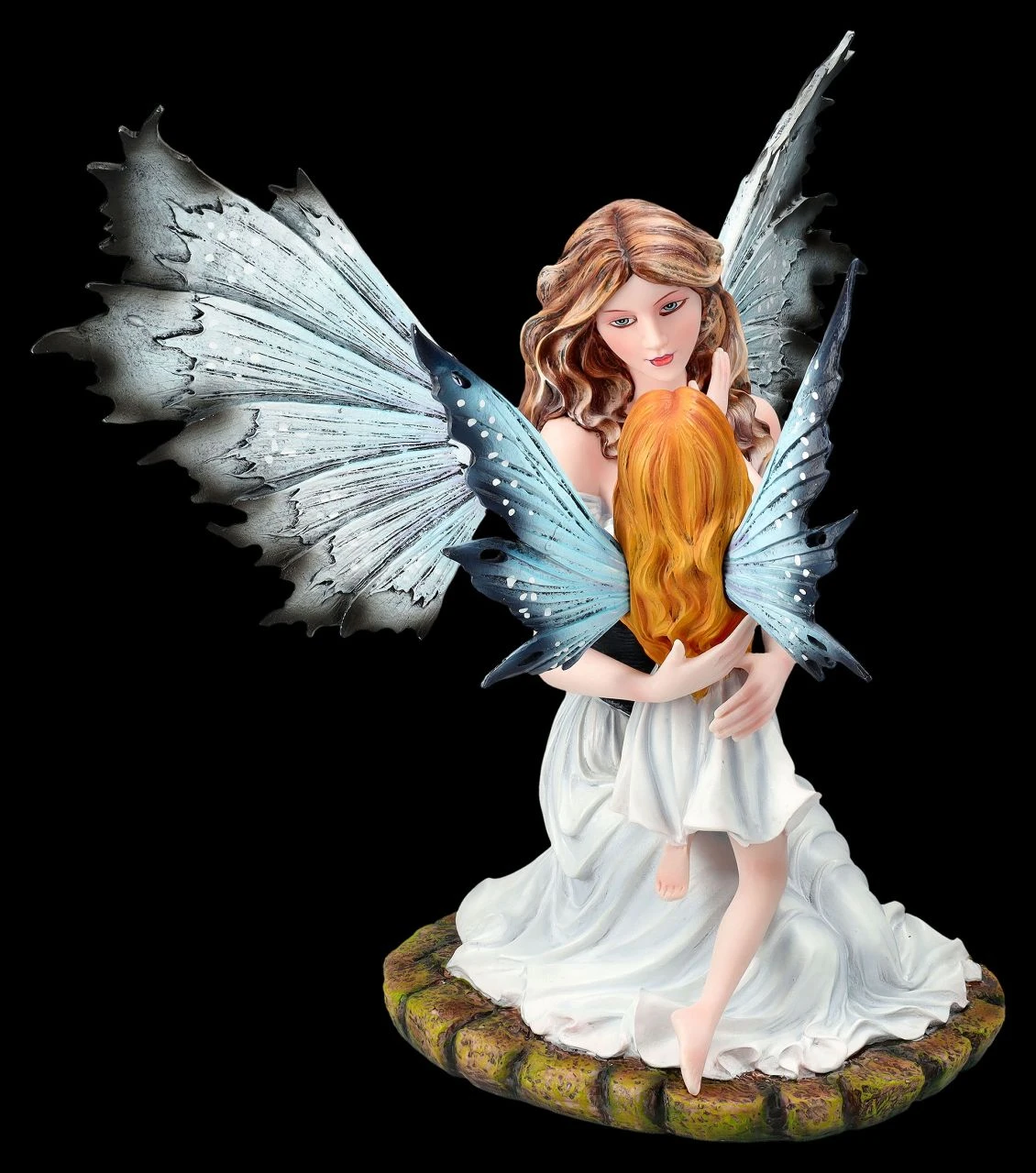 Mami – wieso, weshalb, warum? Die Elfe Tamy nimmt zärtlich ihre Tochter in den Arm und beantwortet geduldig alle Fragen. Schließlich möchte sie ihr Töchterlein so gut es geht beschützen und auf das Leben vorbereiten. Denn auch im Land der Elfen müssen, wie im Land der Menschen, manche Hürden gut und mutig bewältigt werden. Tamy mit ihrer kleinen Tochter im Arm wurde aus liebevoll handbemaltem Kunststein (Polyresin) gefertigt. Die niedliche Elfen-Figur ist 28 cm hoch, 29 cm breit und 30 cm tief. Die schönen filigranen Flügel sind zum Stecken. Die schöne Elfe Tamy mit ihrer kleinen Tochter ist ein wunderbares Geschenk für Mütter, aber auch für alle, die sich manchmal in die Welt der Elfen träumen.
