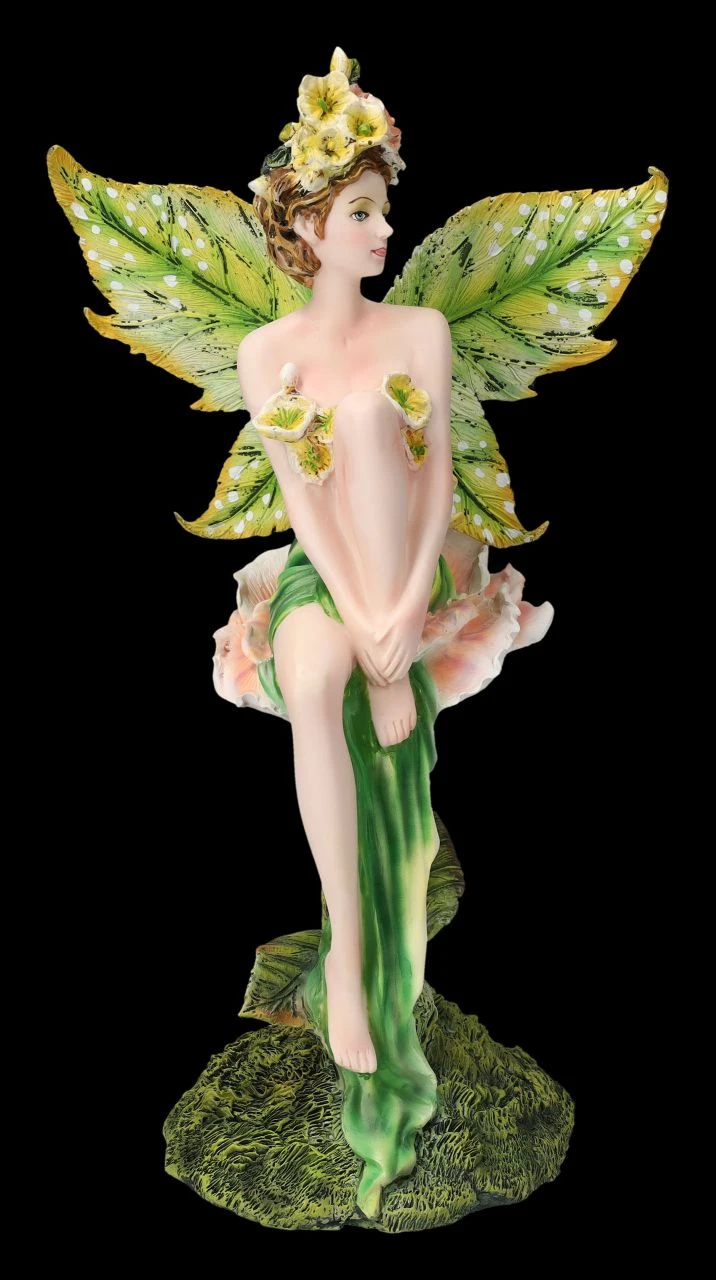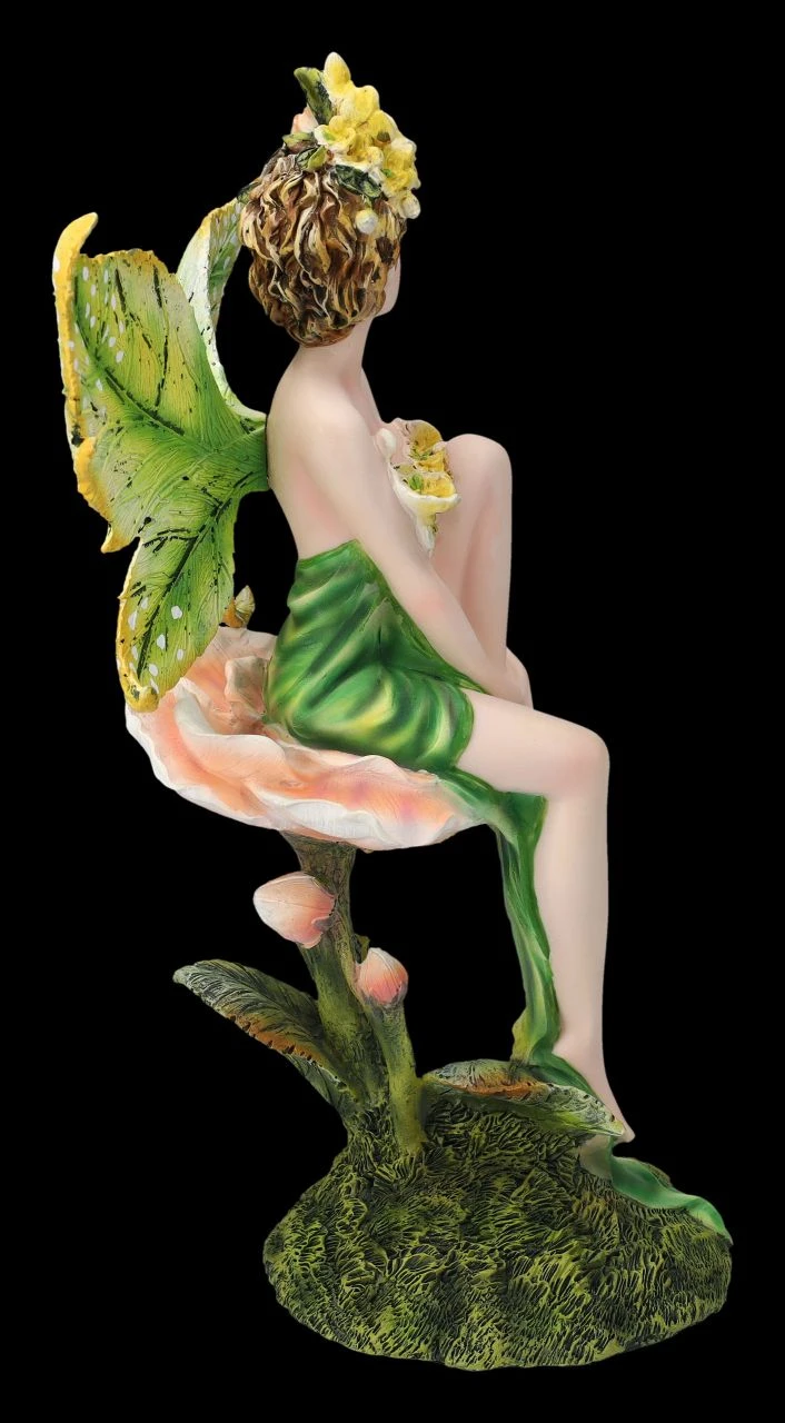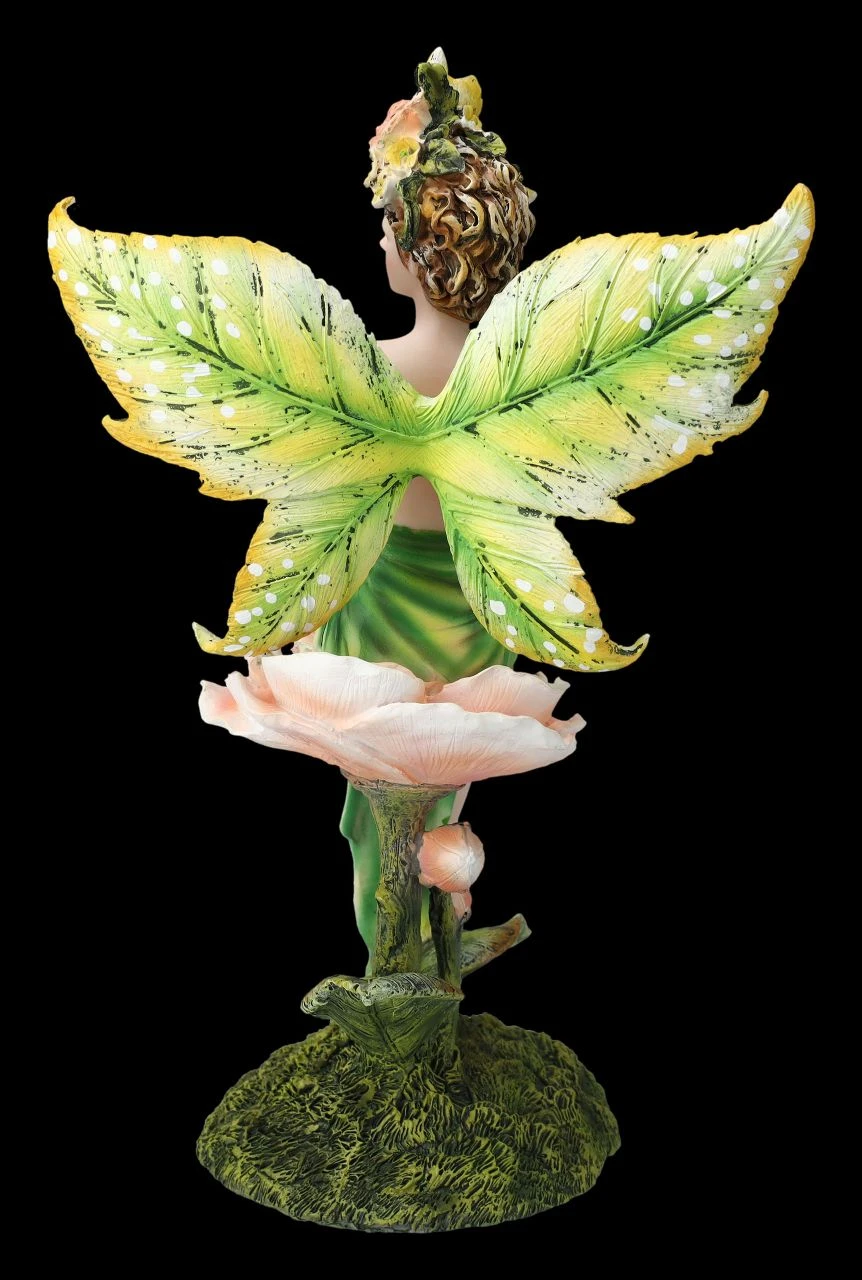 Den vielen Blumen auf der Wiese konnte sie nicht widerstehen. Ein paar mussten einfach für ihre neue Hutkreation gesammelt werden. So schön geschmückt setzt sich die Elfe Tiniwen wie ein bunter Schmetterling auf eine große Rosenblüte und genießt den herrlichen Sommertag. Die wunderhübsche Elfe Tiniwen wurde aus liebevoll handbemaltem Kunststein (Polyresin) geschaffen. Mit der Höhe von 29 cm, der Breite von 17,5 cm und der Tiefe von 13 cm ist sie eine fantastische Dekoration für die Fensterbank oder die Blumenbank. Ihre schönen, blattähnlichen Flügel sind zum Stecken. Die niedliche Elfe Tiniween mit dem Blumenhut ist aber auch – vielleicht mal statt Blumen – ein fantasievolles Geschenk für alle, die Elfen lieben.