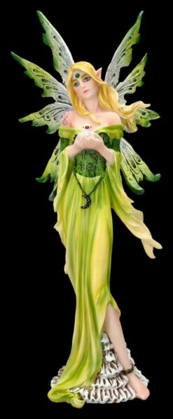Auch im weit entfernten und geheimnisvollen Land der Elfen, Feen und Zauberwesen bekommen Prinzessinnen eine Aufgabe, die zu ihrem Charakter passt. So wurde die wunderschöne Fee Mira von der Mondgöttin als Friedensfee ausgewählt. Sie ist damit auch für die Friedenstauben.verantwortlich, die sorgfältig von ihr gehütet werden und die sie sofort fliegen lässt, wenn sie Gefahr von Streitigkeiten im Land der Elfen vermutet. Die wunderschöne Elfe Mira mit den langen blonden Locken ist in ihrem blattgrünem Kleid zauberhaft anzusehen. An ihrem Gürtel trägt sie stolz das Symbol der großen Mondgötttin und in ihren Händen hält sie die flugbereite Friedenstaube. Die 28 cm hohe, 12,5 cm breite und 11 cm tiefe zauberhafte Elfenfigur ist bis zu den schönen filigranen grünen Flügeln, die übrigens zum Stecken sind, sehr detailreich aus Kunststein (Polyresin) gefertigt und liebevoll von Hand bemalt. Als Symbol für den Frieden ist die schöne Fee Mira mit ihrer Taube ein wunderbares Geschenk für alle, die von der Welt der Elfen und Feen bezaubert sind.