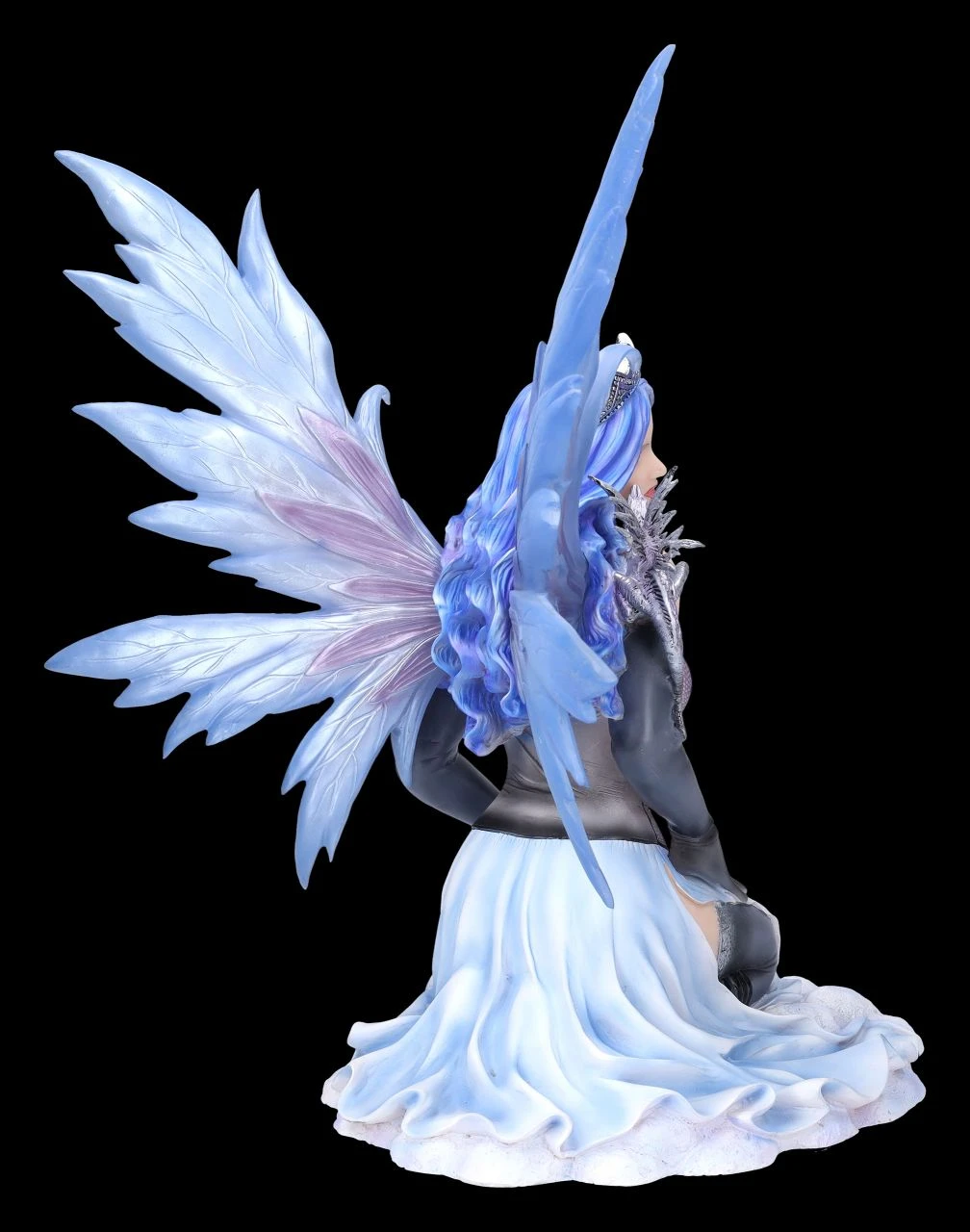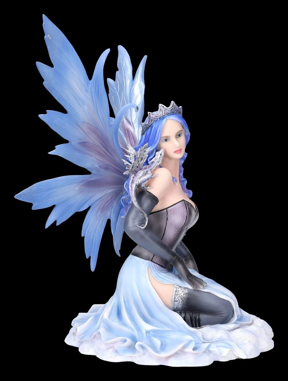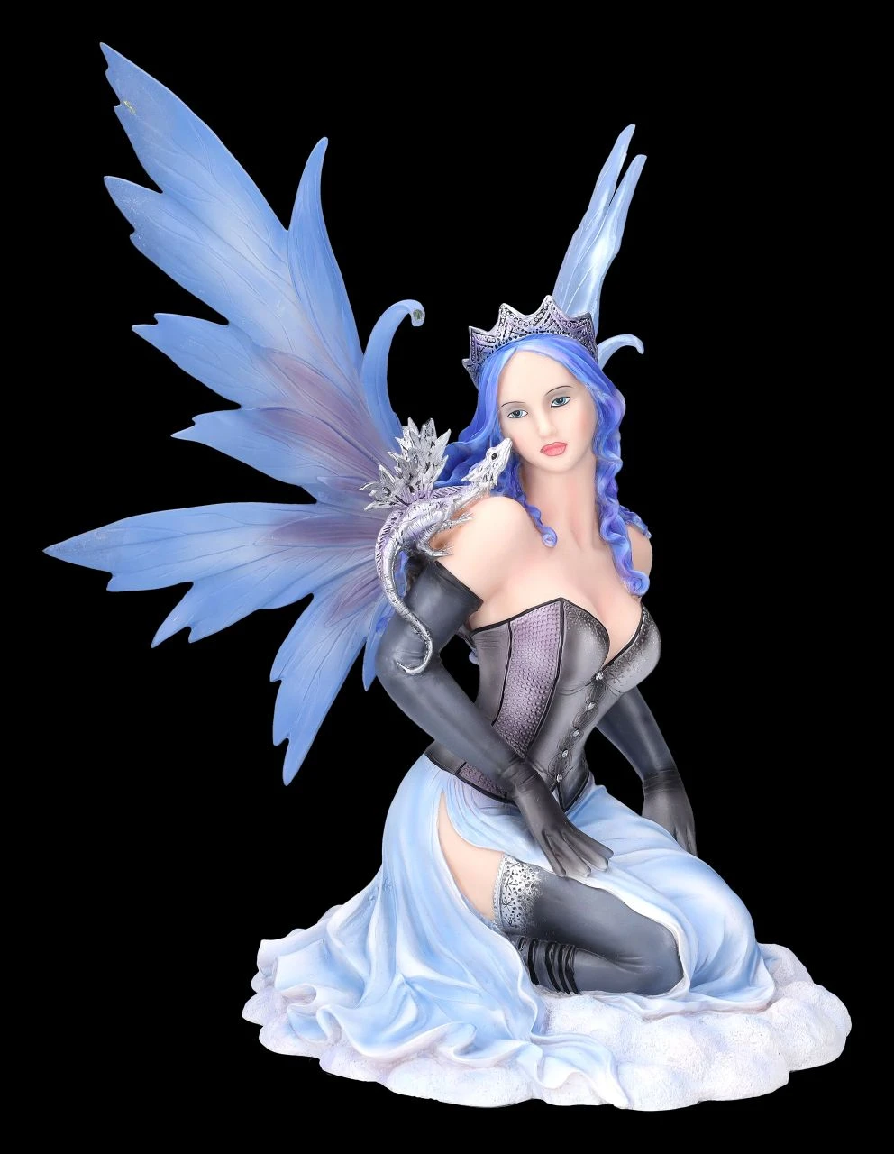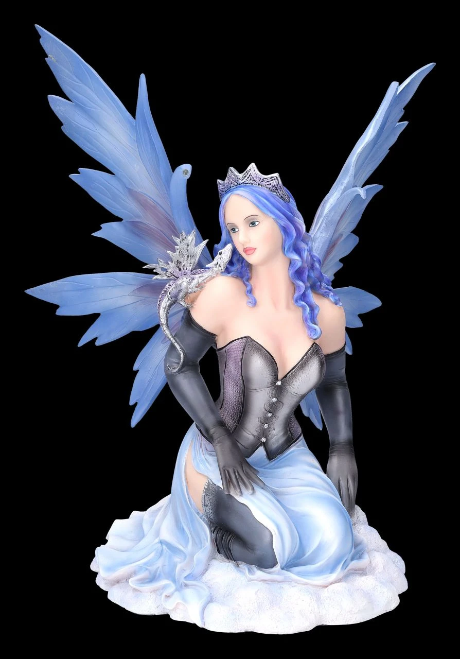 Komm Liebster, sei mutig und folge mir in mein Versteck hinter den Schäfchenwolken hoch am Himmel. Neckisch auffordernd rafft die Elfenprinzessin Vanda ihr himmelblaues Kleid mit dem schwarzen Mieder und zeigt verführerisch ihr langes Bein mit dem Spitzenband an den schwarzen Strümpfen. Die himmlische Vanda mit dem kleinen grauen Drachen auf der Schulter wurde bis zu den filigranen blauen Flügeln, die zum Stecken sind, und der Krone auf dem langen himmelblauen Haar detailreich aus Kunststein (Polyresin) gefertigt und liebevoll von Hand bemalt. Die bezaubernde Elfe Vanda ist mit ihrer Höhe von 38 cm, der Breite von 29 cm und der Tiefe von 28 cm ein himmlisches Geschenk für alle Elfenfreunde.