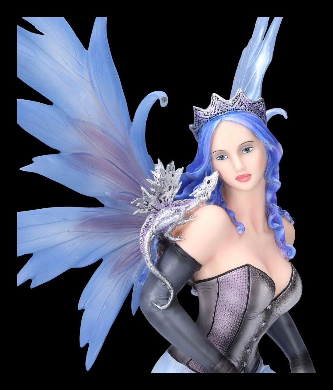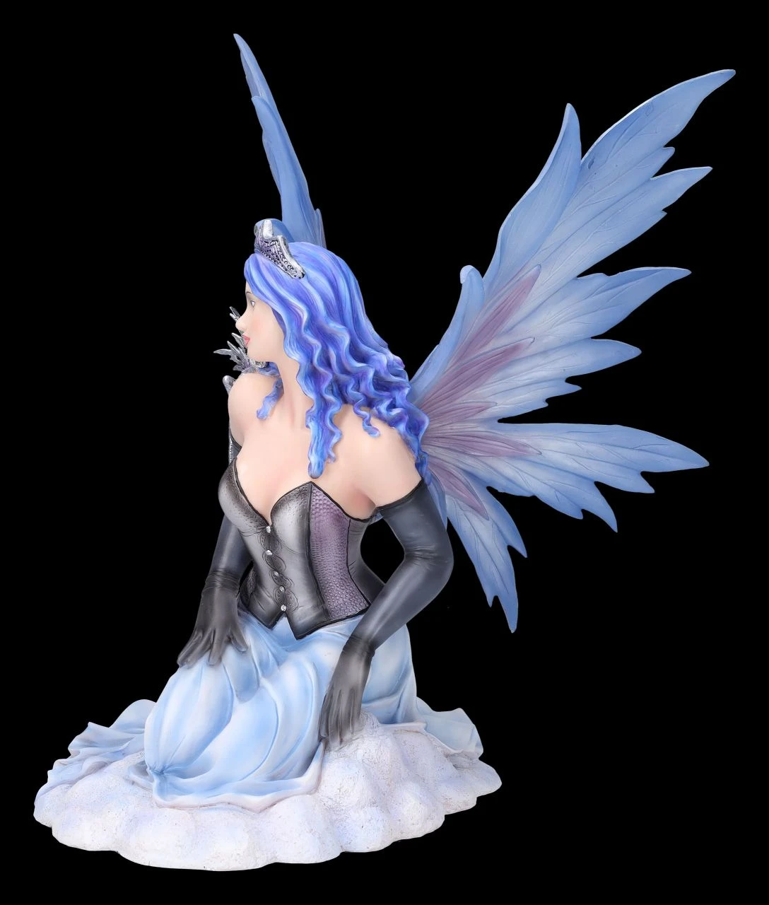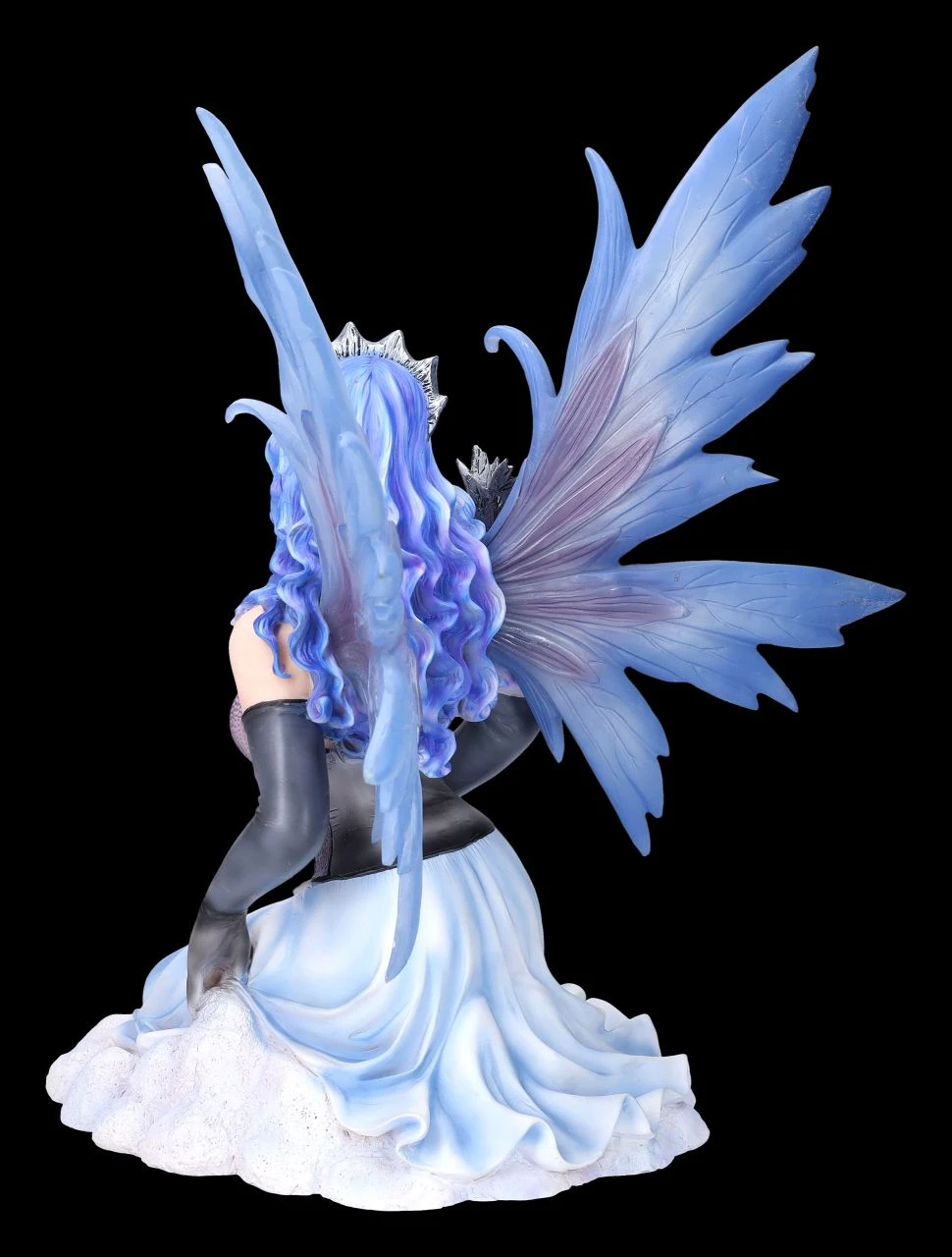Komm Liebster, sei mutig und folge mir in mein Versteck hinter den Schäfchenwolken hoch am Himmel. Neckisch auffordernd rafft die Elfenprinzessin Vanda ihr himmelblaues Kleid mit dem schwarzen Mieder und zeigt verführerisch ihr langes Bein mit dem Spitzenband an den schwarzen Strümpfen. Die himmlische Vanda mit dem kleinen grauen Drachen auf der Schulter wurde bis zu den filigranen blauen Flügeln, die zum Stecken sind, und der Krone auf dem langen himmelblauen Haar detailreich aus Kunststein (Polyresin) gefertigt und liebevoll von Hand bemalt. Die bezaubernde Elfe Vanda ist mit ihrer Höhe von 38 cm, der Breite von 29 cm und der Tiefe von 28 cm ein himmlisches Geschenk für alle Elfenfreunde.
