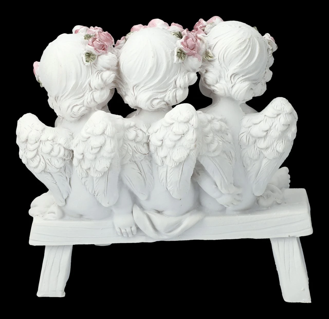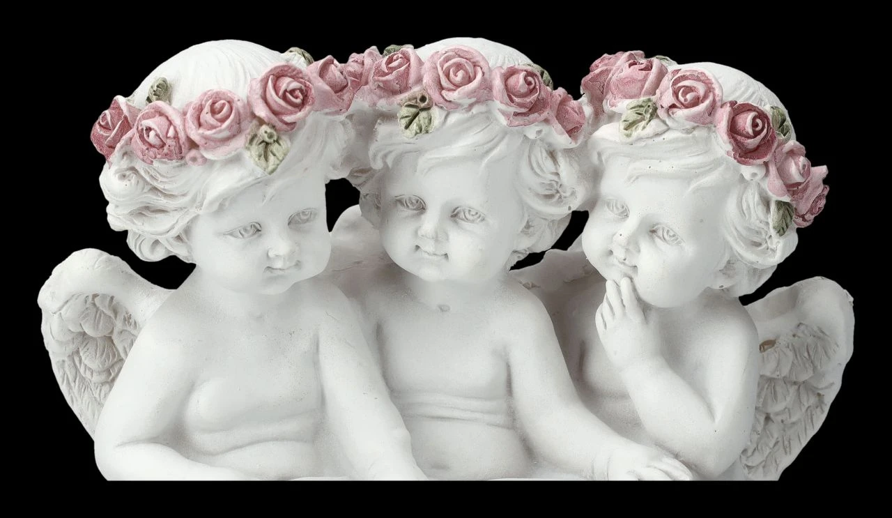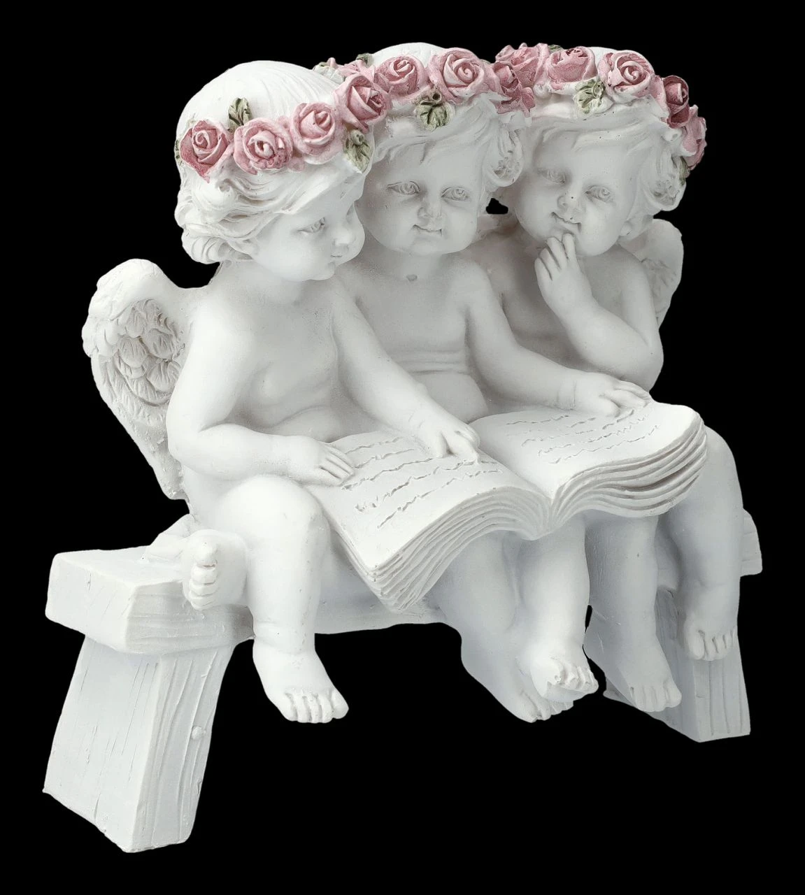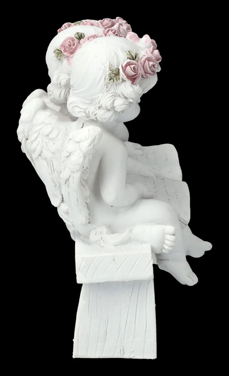 Was wohl Spannendes in diesem großen Buch aufgeschrieben steht? Fasziniert hören zwei kleine Engelchen ihrer Vorleserin zu. Die drei in einem Buch lesenden niedlichen Putten gehören zu der großen Engelschar, die in unserem Shop gelandet ist. Die hübsche Deko wurde aus liebevoll handbemaltem Kunststein (Polyresin) gefertigt und ist 11,5 cm hoch, 12 cm breit und 7,5 cm tief. Nicht nur für jeden Hochzeitstisch sind die kleinen Putten eine tolle Deko, sie sind auch ein romantisches Geschenk für den ganz persönlichen Engel.