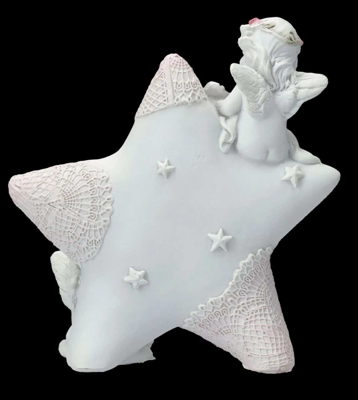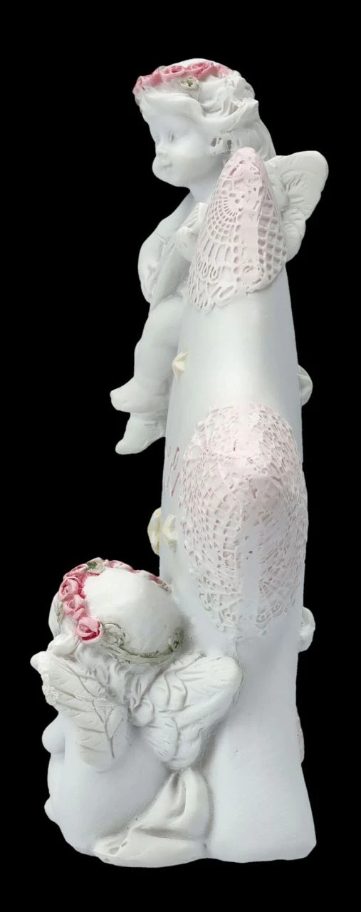 Auf einem mit zarten Spitzen verzierten Stern mit dem Schriftzug ‚Love‘ sitzt eine kleine niedliche, mit Rosen bekränzte Putte und spielt auf der Laute, während eine weitere süße Putte am Boden sitzt und den Klängen lauscht. Dieses putzige Engel-Figur ist eine wirklich zauberhafte Dekoration auf einer Hochzeitstafel, aber auch ein reizendes Geschenk, denn bereits in der Antike kannte man den pausbäckigen ‚Putto‘, was im Lateinischen eigentlich ‚Knäblein‘ bedeutete, als Liebesengel. Die bezaubernden Putten mit dem Stern ‚Love‘ sind aus liebevoll handbemaltem Kunststein (Polyresin). Die kleine Engel-Figur ist 12 cm hoch, 11 cm breit und 5,5 cm tief.