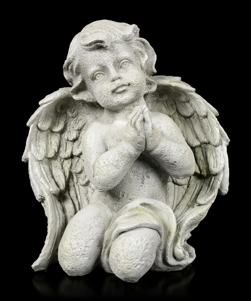Der kleine Engel Junge hat sich auf die Knie gesetzt, die Hände gefaltet und blickt betend gen Himmel. Der hübsche Engel ist eine tolle Ergänzung in Ihrem Garten. Die handbemalte Gartenfigur aus Magnesia-Glasfaser wird sich wunderbar in jede Gartengestaltung einbinden lassen. Natürlich ist der kleine Engel auch auf einer Terrasse oder in einem Wohnraum sehr hübsch anzusehen.