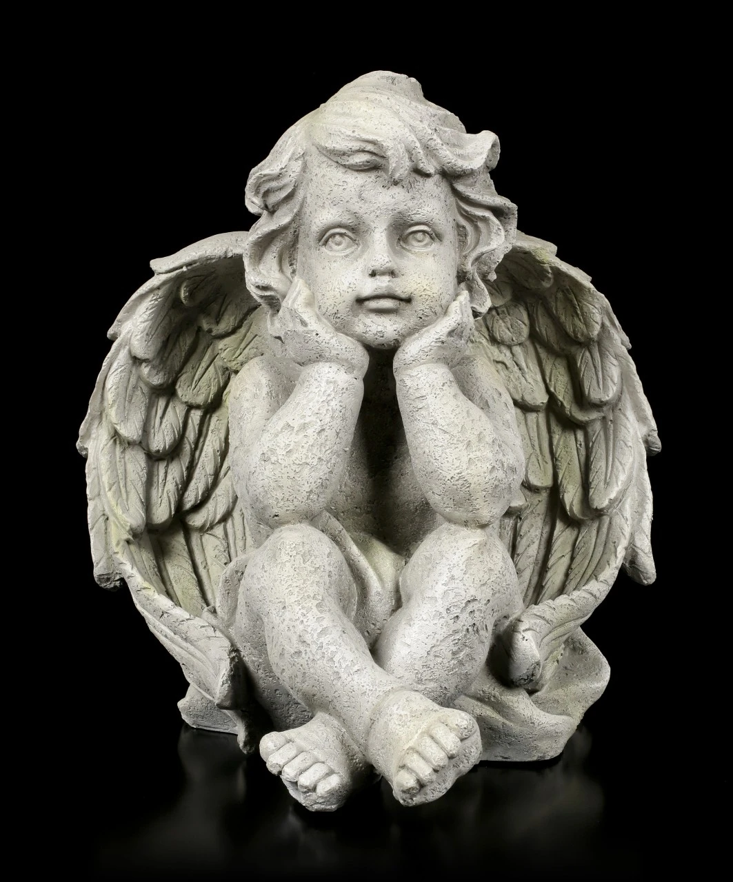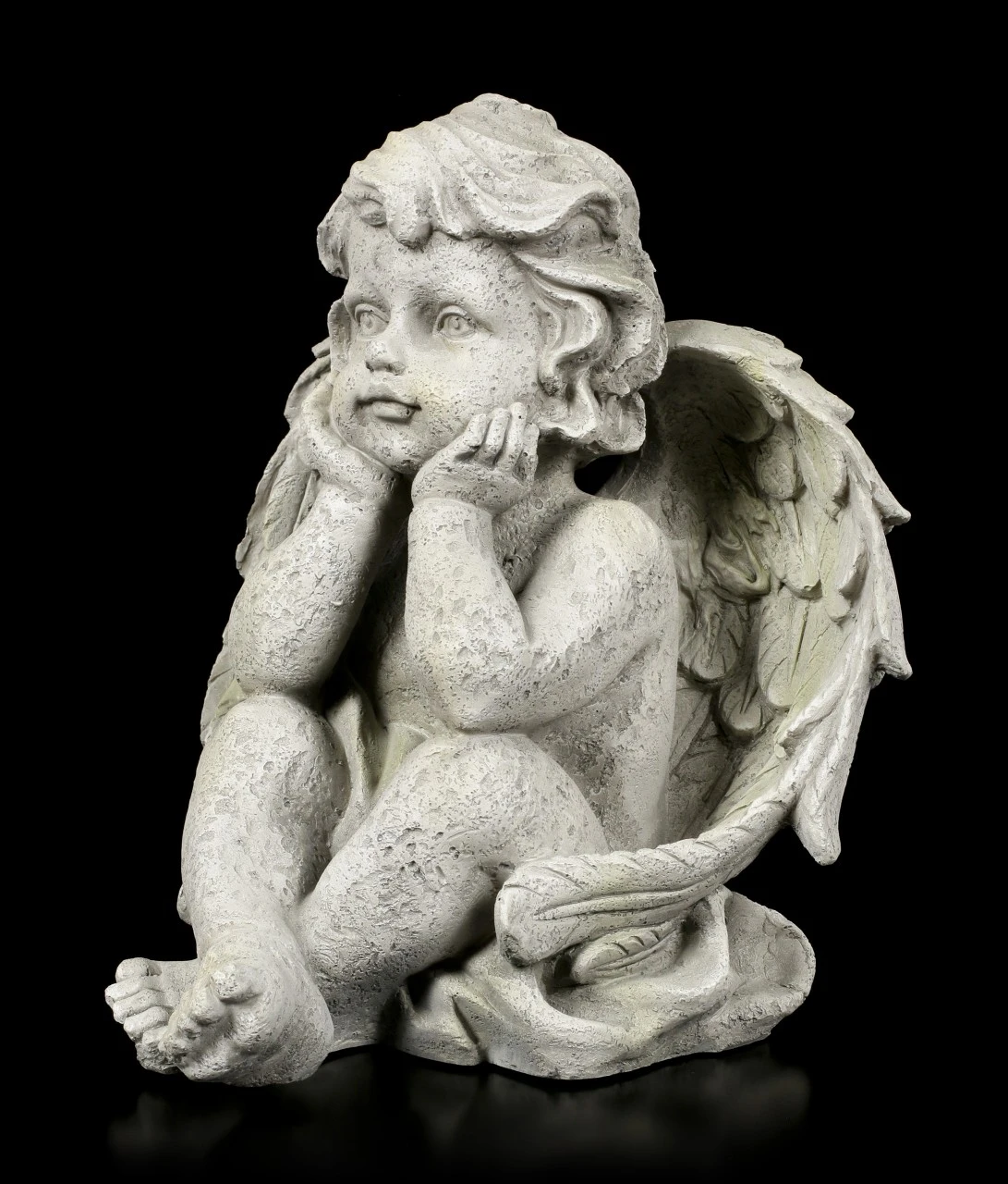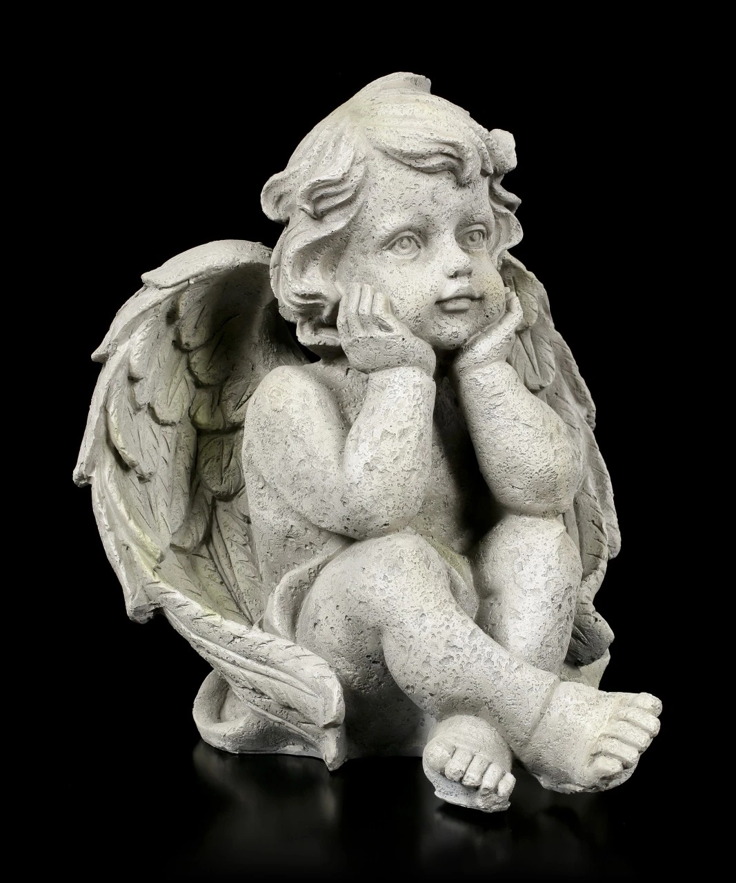 Ganz in Gedanken versunken sitzt der kleine Engel Junge in Ihrem Garten und beobachtet das Treiben der Tiere um sich herum. Die handbemalte Gartenfigur aus Magnesia-Glasfaser wird sich wunderbar in jede Gartengestaltung einbinden lassen. Natürlich ist der kleine Engel auch auf einer Terrasse oder in einem Wohnraum sehr hübsch anzusehen.