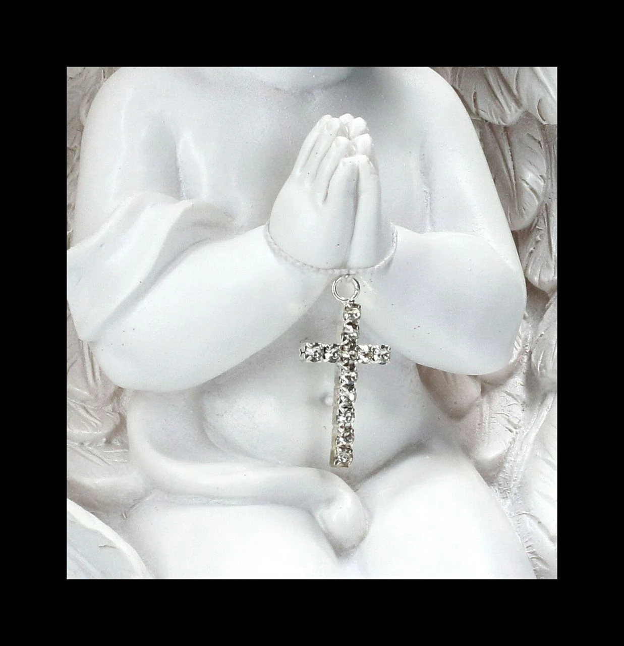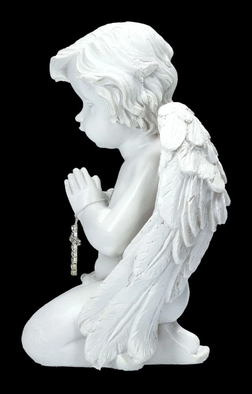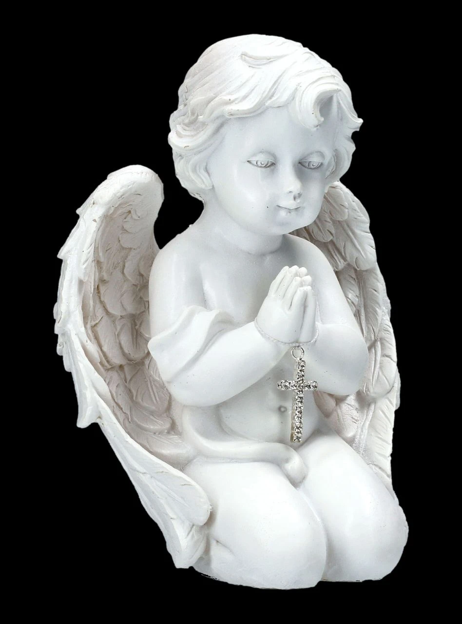 In seinen Händen hält der kleine betende Engel ein mit Schmucksteinen verziertes Kreuz. Der handbemalte weiße Engel ist 13 cm hoch, 10 cm breit und 7,5 cm tief. Er ist sehr detailreich aus Kunststein (Polyresin) gefertigt. Der niedliche Engel ist ein schönes Geschenk für jemand besonderen und zeigt, dass man jeden Tag an ihn denkt.