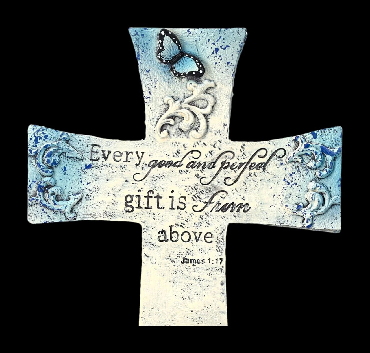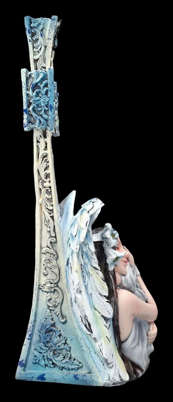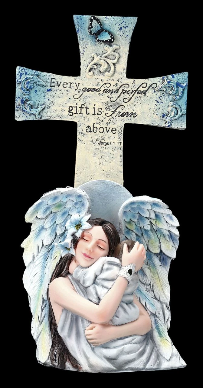 Vor einem Kreuz ist ein wunderschöner Engel mit langen dunklen Haaren zu sehen, der selig lächelnd ein Baby schützend in den Armen hält. Auf dem Kreuz ist der Bibelspruch ‚Every good and perfect gift is from above‘ zu lesen, den sicher jeder schon mal selbst als ‚Alles Gute kommt von oben‘ gehört oder gesagt hat. Der herrliche Engel stammt aus dem Atelier der Künstlerin Jessica Galbreth und wurde aus zart und liebevoll handbemaltem Kunststein (Polyresin) geschaffen. Die wunderbare Engelfigur mit dem Baby ist 25 cm hoch, 12,5 cm breit und 10 cm tief. Die beschützende Engelfigur wird überall zum sofortigen Blickfang und wird auch als Geschenk – vielleicht gleich für Eltern mit einem Baby – große Freude machen.