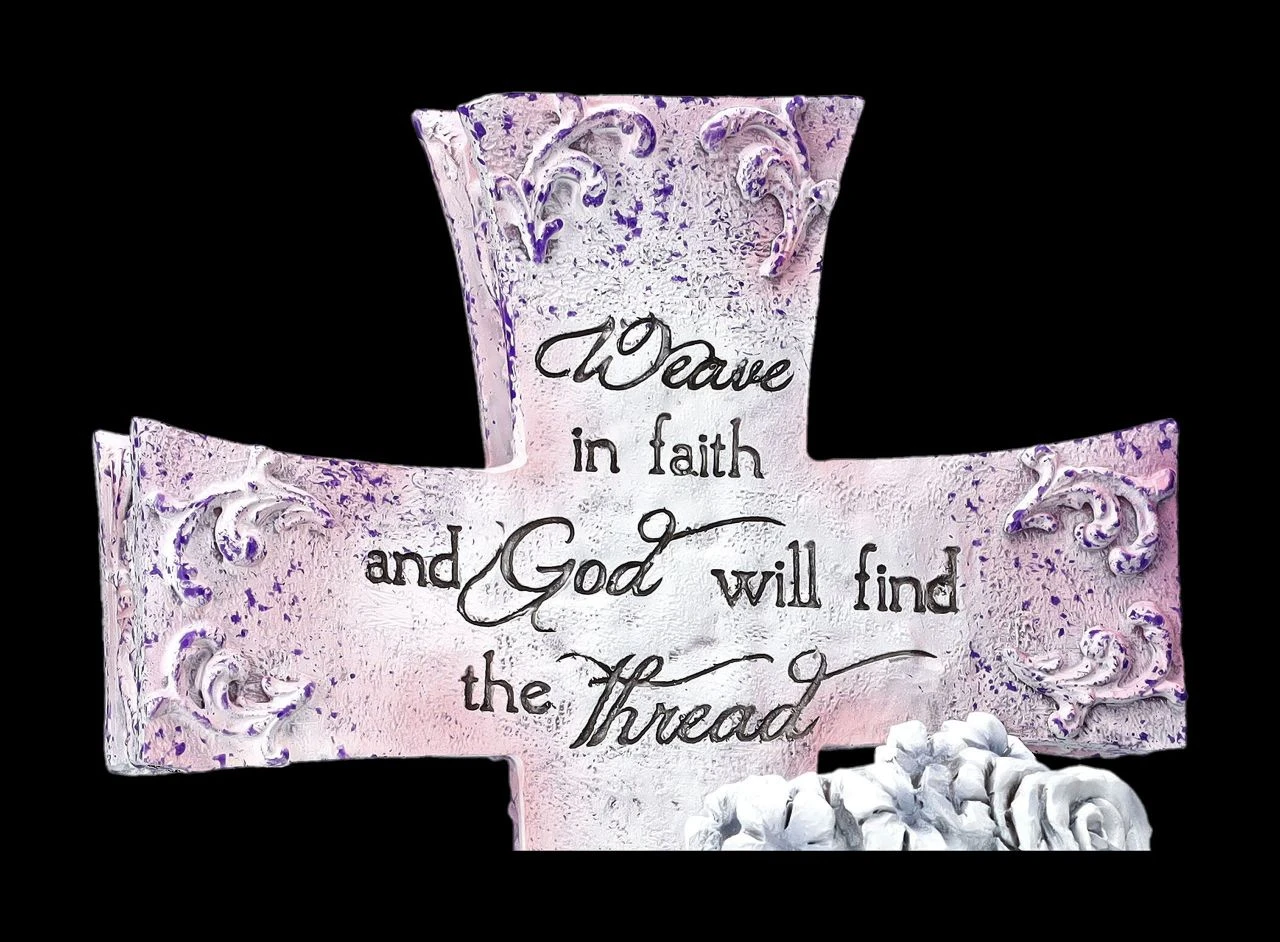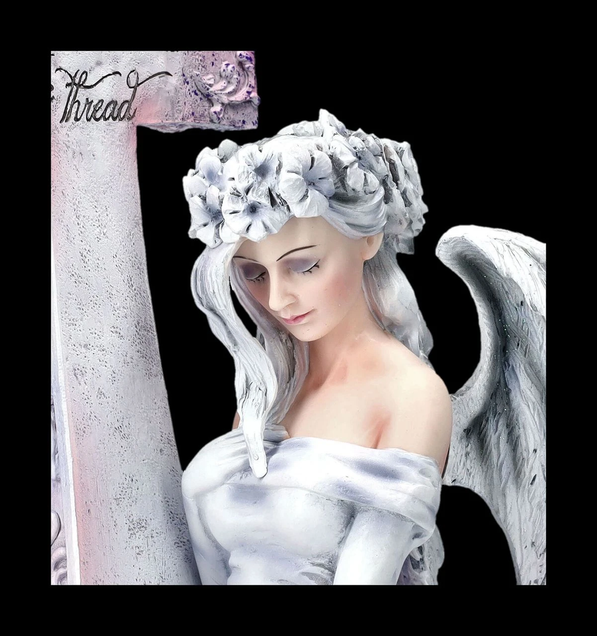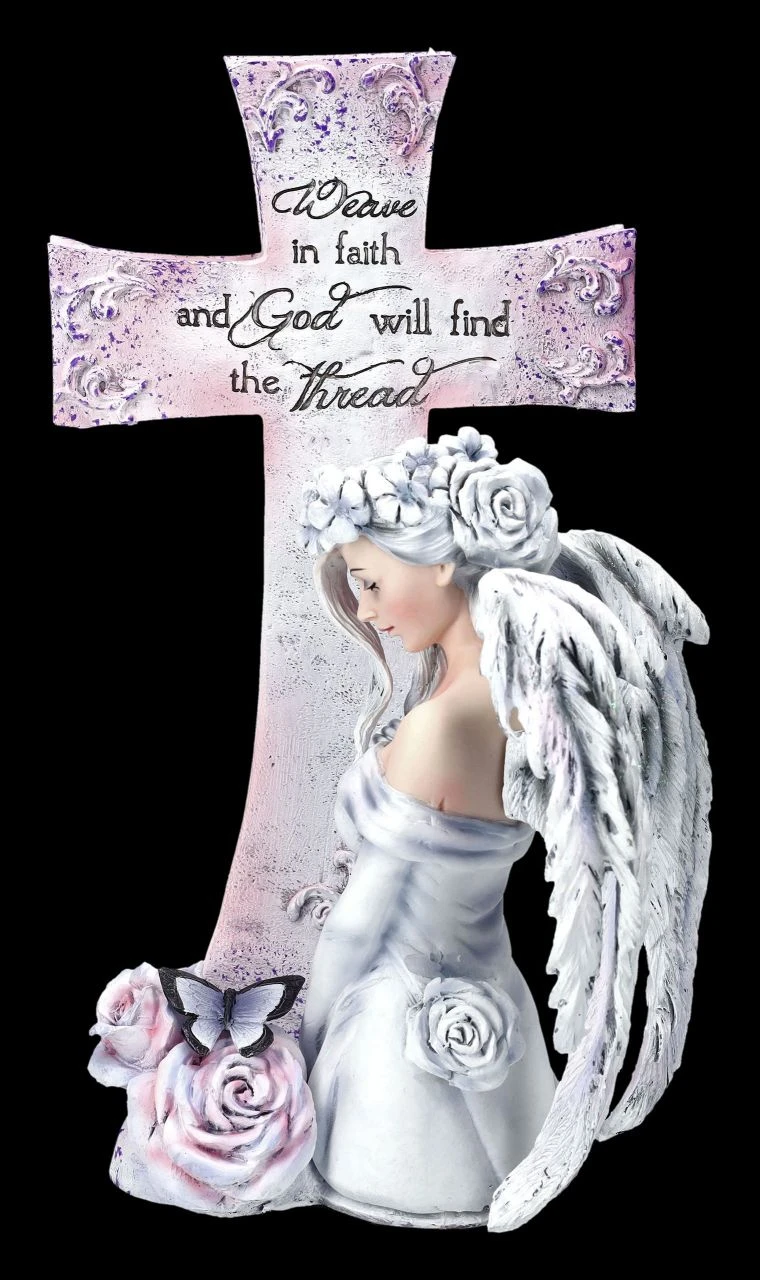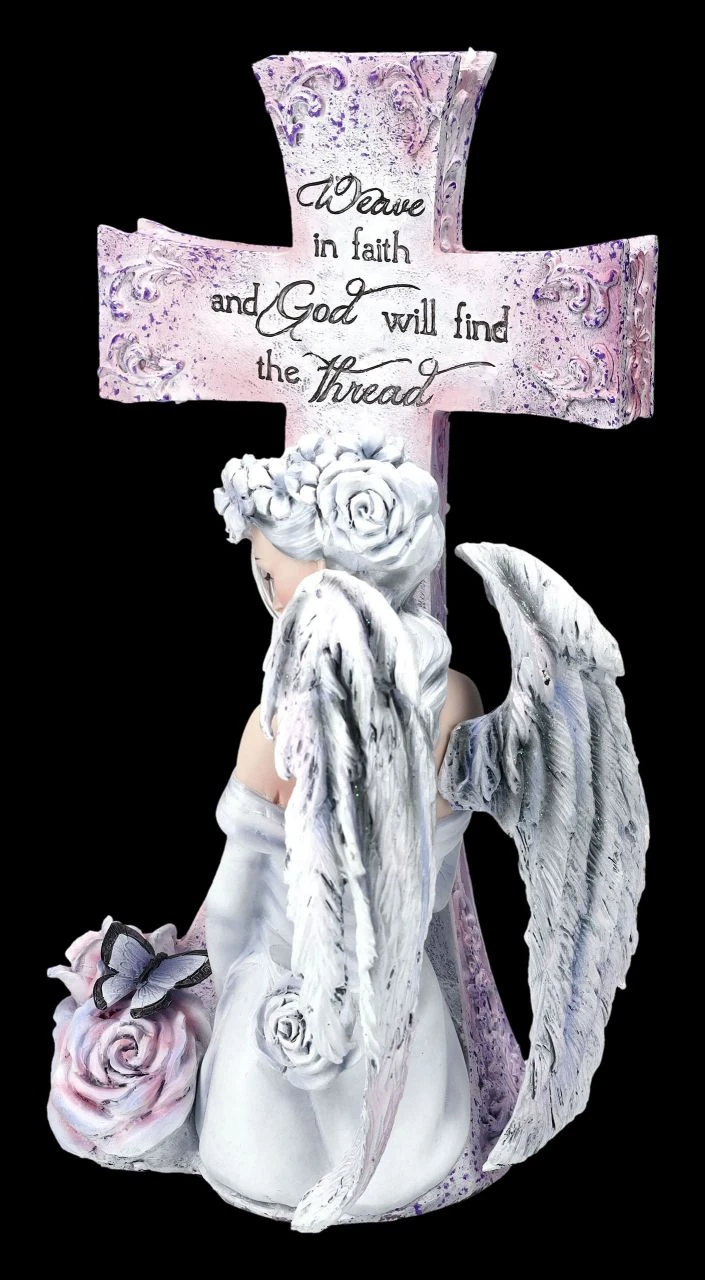 ‚Webe im Glauben und Gott wird den Faden finden‘ ist – übersetzt – auf dem Kreuz zu lesen, vor dem ein herrlicher Engel in Gedanken versunken kniet. Der mit Blumen bekränzte Engel mit den großen Flügeln sieht aus wie eine wunderschöne Braut und auf den Rosen neben dem Engel ist ein schöner Schmetterling gelandet. Die Engelfigur stammt aus dem Atelier der Künstlerin Jessica Galbreth und wurde aus zart und liebevoll handbemaltem Kunststein (Polyresin) geschaffen. Die wunderbare Engelfigur mit dem Kreuz ist 25 cm hoch, 13,5 cm breit und 13,5 cm tief. Sie wird überall zum sofortigen Blickfang und wird auch als Geschenk große Freude machen.