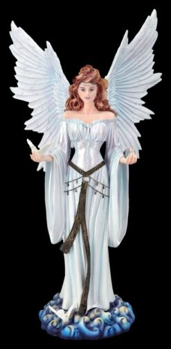 Der wunderschöne Engel steht auf einem Wolkenband und lässt die Friedenstaube in seiner rechten Hand losfliegen. Zu seinen Füßen wartet bereits eine weitere Taube. In der linken Hand hält der bezaubernde Engel eine Kristallkugel. Wer möchte nicht einen liebevollen Engel an seiner Seite haben, der ihn beschützt und zwar nicht den Himmel auf Erden verspricht, aber einen kleinen Blick in die Kristallkugel auf den HImmelsfrieden werfen lässt? Die 42 cm hohe, 23 cm breite und 16 cm tiefe beeindruckende Engelsfigur mit den Tauben ist detailreich aus liebevoll handbemaltem Kunststein (Polyresin) gefertigt. Die herrlichen Flügel des schönen Engels sind zum Stecken. Für jeden dem man sagen möchte, dass ihn sein Schutzengel stets begleitet, aber auch zum Beispiel für eine Hochzeitstafel, ist dieser Engel mit den Tauben ein zauberhaftes Geschenk.