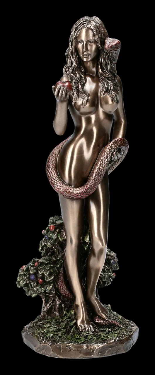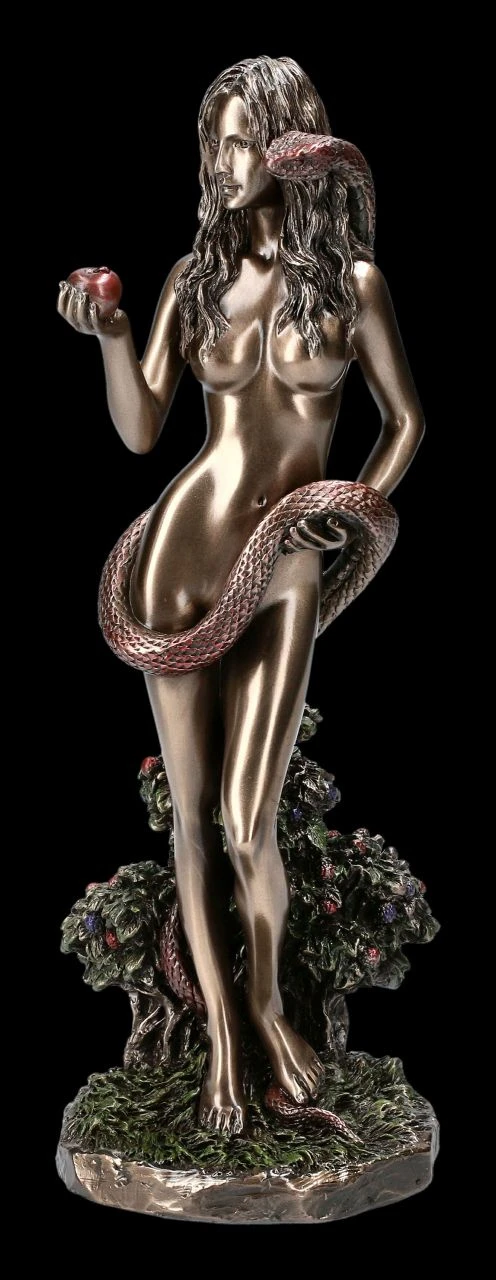 Verführerisch hält Eva dem Betrachter einen Apfel entgegen. Ihr wunderschöner nackter Körper wird nur von der Schlange, die sie sanft umwindet, notdürftig bedeckt. Die Schlange scheint ihr auch alle Worte ins Ohr zu flüstern, mit denen Eva jeden dazu verlocken soll, den Apfel der Sünde zu probieren. Die erotische und ästhetisch schöne Eva mit der Schlange und dem Apfel aus der Studio Collection von Veronese ist edel bronziert und fein coloriert. Sie ist stilvoll aus Kunststein (Polyresin) gefertigt und mit der Höhe von 25 cm, der Breite von 9 cm und der Tiefe von 9 cm eine wunderbar edle Dekoration für jedes Ambiente und wird mit Sicherheit die Blicke Ihrer Besucher auf sich ziehen.