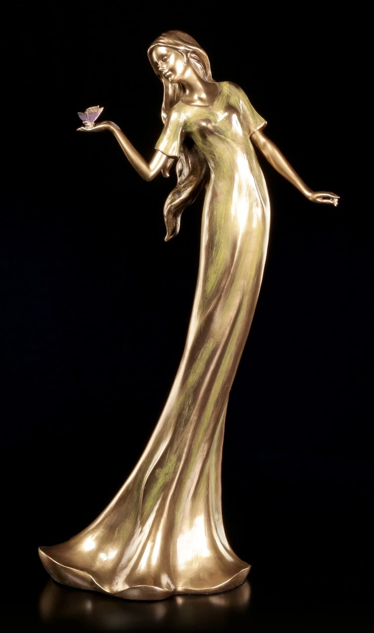 Sieht diese junge Frau nicht höchst elegant aus? So wie sie anmutig zu einem Schmetterling beugt, den sie in der Hand hält. Die Lady mit dem Schmetterling ist ein Kunstwerk vom bekannten Hersteller Veronese. Sie stammt aus der Studio Collection Serie und wurde liebevoll bronziert und coloriert. Durch die überlangen Beine, die schlanke Silhouette und die S-Form des Körpers wirkt die junge Frau lebendig und in Bewegung.