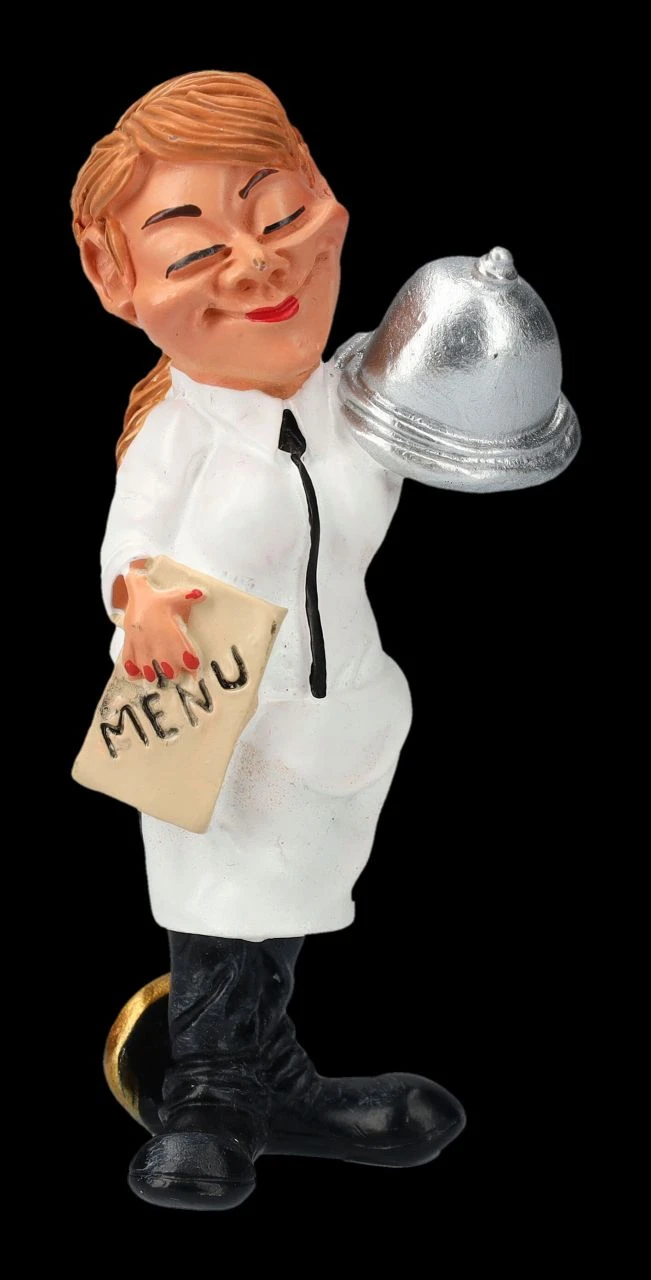 Darf ich noch ein Nachtisch bringen? Von dieser freundlichen Kellnerin lässt man sich doch gerne noch etwas bringen. Die lustige Funny Job Figur wurde aus Kunststein (Polyresin) gefertigt und von Hand bemalt. Mit der Höhe von 8,5 cm, der Breite von 3,5 cm und der Tiefe von 2,5 cm ist sie ein nettes kleines Geschenk für eine aufmerksame und stets freundliche Kellnerin.
