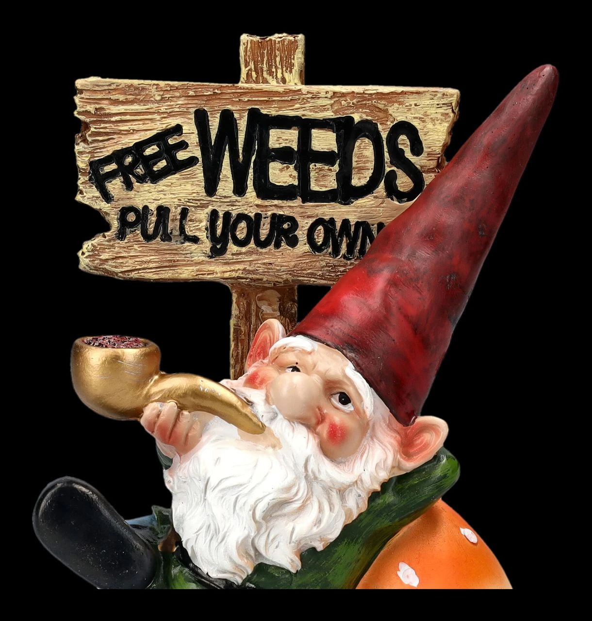 In diesem Garten darf das Unkraut von jedem kostenlos geerntet werden. Dieser Gartenzwerg hat jedenfalls keine Lust dazu und bietet das großzügig an. Gemütlich die Pfeife schmauchend sitzt er vor dem Schild mit der Aufschrift ‚Free Weeds – pull your own….‘ Die witzige, 18,5 cm hohe, 14 cm breite und 8,5 cm tiefe Gartenzwerg-Figur wurde aus liebevoll handbemaltem Kunststein (Polyresin) gefertigt. Sie ist ein lustiges Geschenk für jeden, der das Unkraut auch mal Unkraut sein lassen sollte.