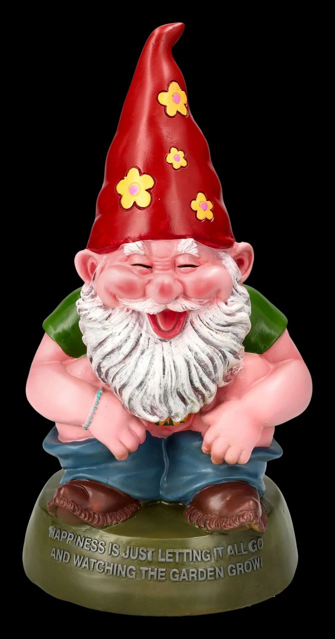 Ganz schön frech – der fröhliche Hippie Gnom lässt einfach seine Hosen fallen. Der Gartenzwerg steht auf einem Podest, auf dem übersetzt zu lesen ist: ‚Glück ist, einfach alles loszulassen und dem Garten beim Wachsen zuzusehen.‘, aber anscheinend möchte er mit Dünger etwas nachhelfen. Aber hoffentlich stört sich der Gartennachbar nicht daran… Der fröhlich lachende Gartenzwerg trägt eine mit Hippieblumen verzierte Zipfelmütze. Er ist 28 cm hoch, 15 cm breit und 14 cm tief und wurde aus handbemaltem Kunststein (Polyresin) gefertigt. Der Gartenzwerg-Hippie, der die Hosen runter lässt, ist eine freche und lustige Deko, aber auch ein witziges Geschenk für ewige Hippies.
