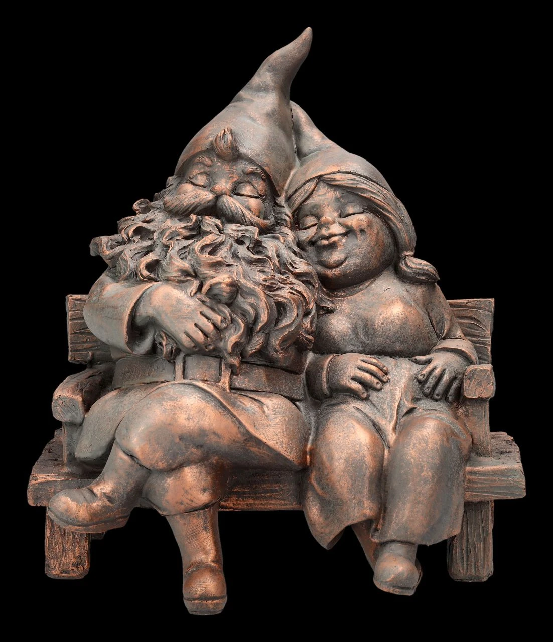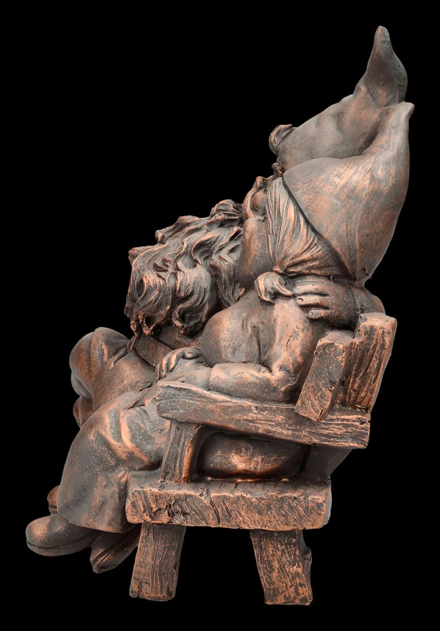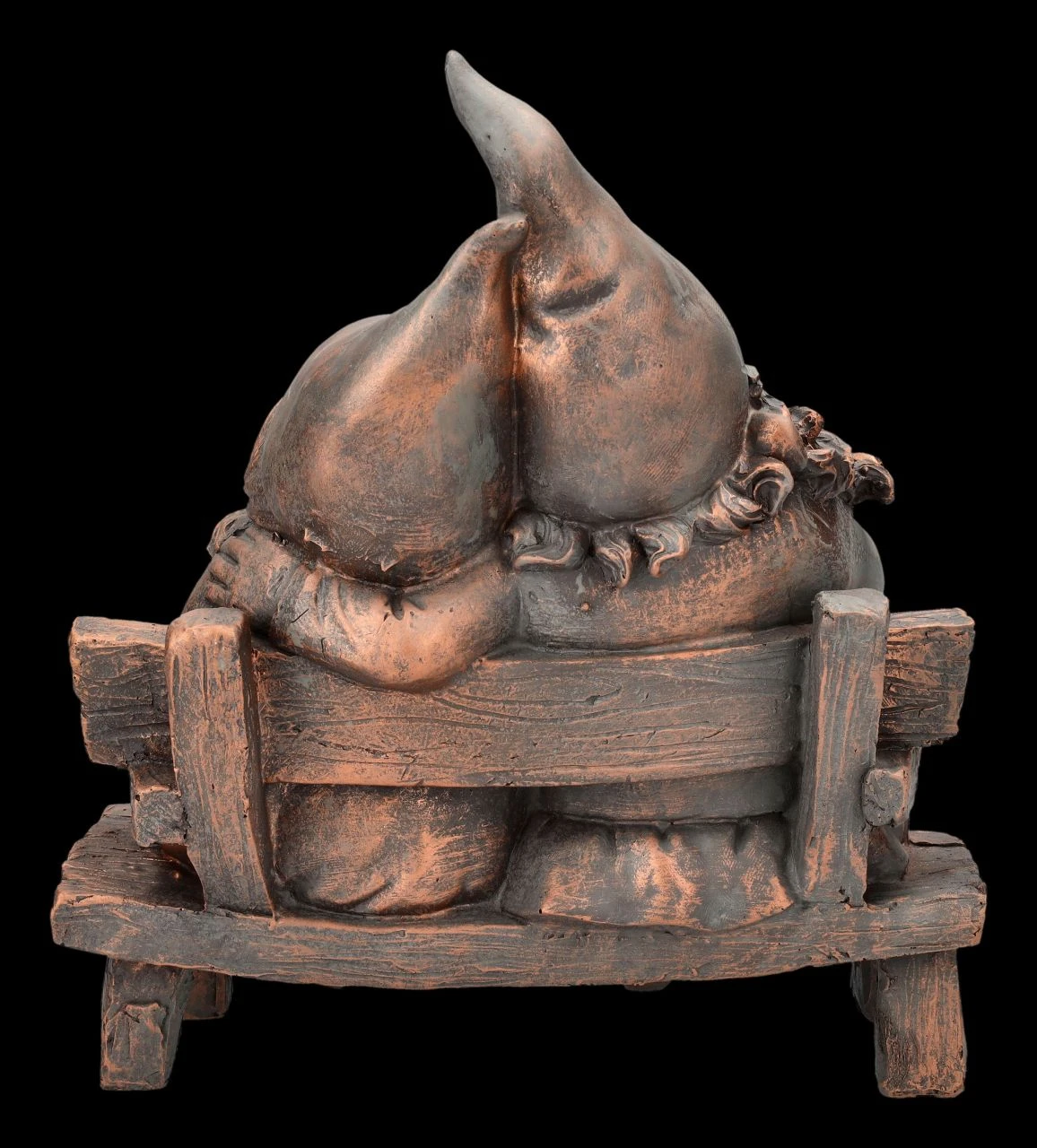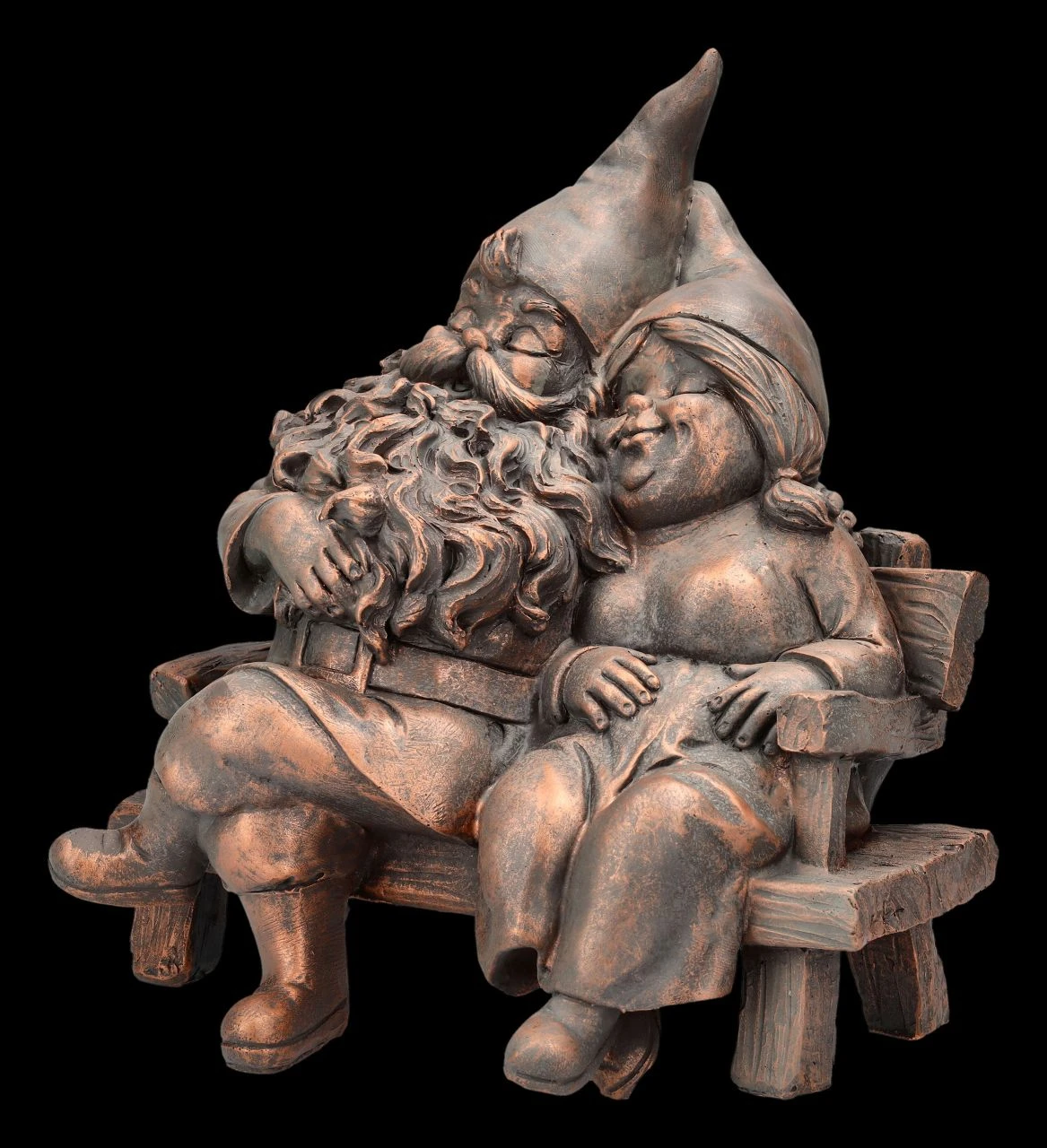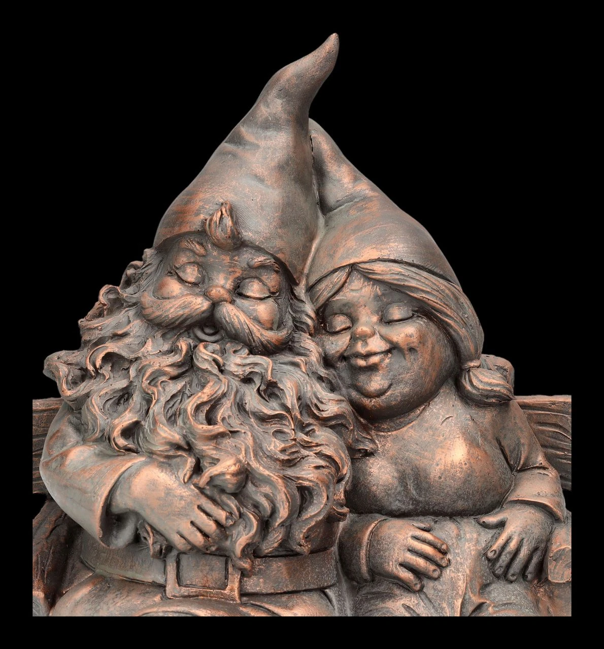 Die Arbeit ist getan! Müde, aber glücklich und zufrieden lächelnd kuscheln sich das Paar auf der Bank aneinander, um die abendlichen Sonnenstrahlen zu genießen. Das niedliche Gartenzwerg-Pärchen auf der Bank ist der absolute Hingucker. Die 23 cm hohe, 21 cm breite und 16 cm tiefe Gartenzwerg-Figur wurde liebevoll und detailreich aus Kunststein (Polyresin) gefertigt und bronzefarben handbemalt. Dadurch erhalten die beiden Zwerge auf der Bank ein wunderbar nostalgische Aussehen. Sie sind nicht nur eine niedliche Deko für den Balkon, die Terrasse oder die Blumenbank, sondern auch ein entzückendes Geschenk für liebe Gartenfreunde.