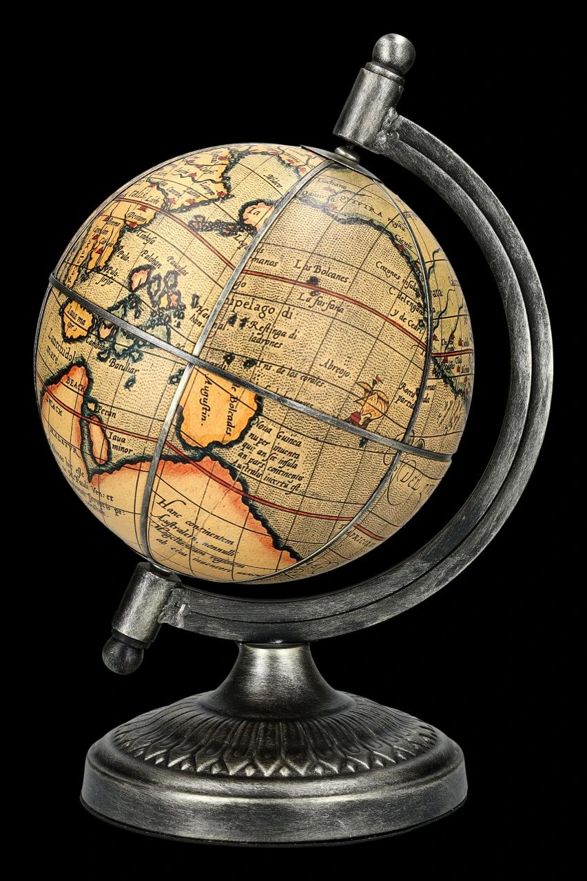 Der mit einer antik aussehenden Karte überzogene klassische Globus aus mit Kunstleder überzogenem Kunststoff ist ausgesprochen dekorativ. Er steht auf einem Sockel aus satiniertem Metall, aus dem auch die Halterung gefertigt ist. Der 35 cm hohe, 21 cm breite und 24 cm tiefe Globus macht einen edlen und alten Eindruck, als wäre er ein Erbstück oder ein Objekt das auch in ein Museum passt. Der beeindruckende klassische Globus wird in jeder Einrichtung zum sofortigen Blickfang. Jeder der ihn entdeckt wird in Versuchung geraten, die Welt aus der früheren Sicht zu erkunden. Er ist auch ein wunderbares Geschenk für jeden, der von der früheren Welt fasziniert ist.