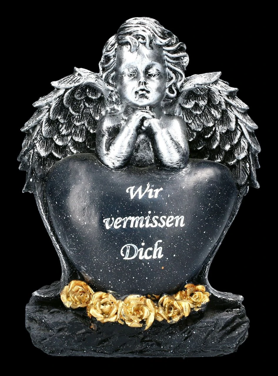 ‚Wir vermissen Dich‘, so lautet die Inschrift auf dem wie aus einem schwarzen Granit gearbeiteten Herz, hinter dem nachdenklich der süße, barocke Engel steht. Die fünf goldarbenen Rosen am Fuß des Herzens gibt diesem Grabengel ein edles Aussehen. Der Grabengel ist sehr detailreich aus liebevoll handbemaltem Kunststein (Polyresin) gefertigt. Er ist 17 cm hoch, 13 cm breit und 6,5 cm tief und sehr detailreich gestaltet.