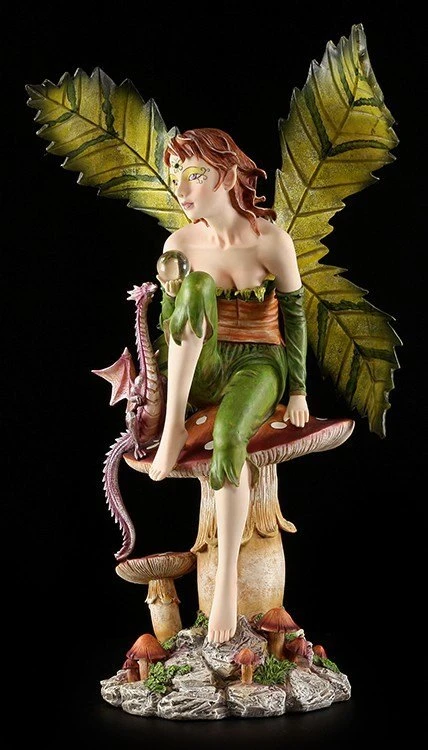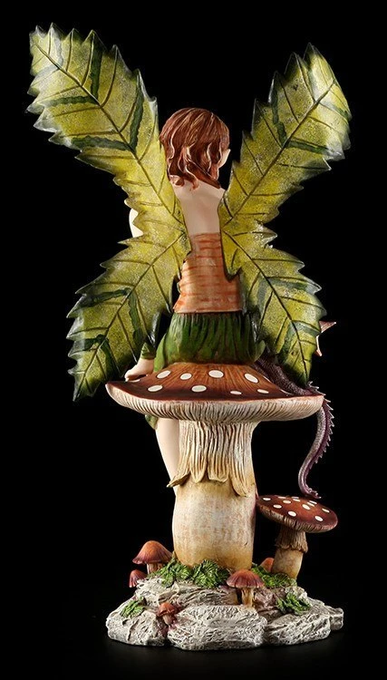 Waldelfen sind ein sehr scheues Elfen Volk. Sie wohnen tief verborgen in alten und naturbelassenen Wäldern und kümmern sich dort – vernab von den Menschen – um große und kleine Tiere und Planzen. So ist die anmutige Waldelfe Dorna ein äußerst seltener Anblick. Sie hat sich mit ihrem kleinen Drachenfreund auf einem Pilz niedergelassen und genießt die Ruhe ihrer Umgebung. Die wunderschöne Elfen Figur ist aufgrund der Größe und der detaillierten Ausarbeitung ein sehenswerter Anblick und wird zu dem Blickpunkt in einer Sammlung.