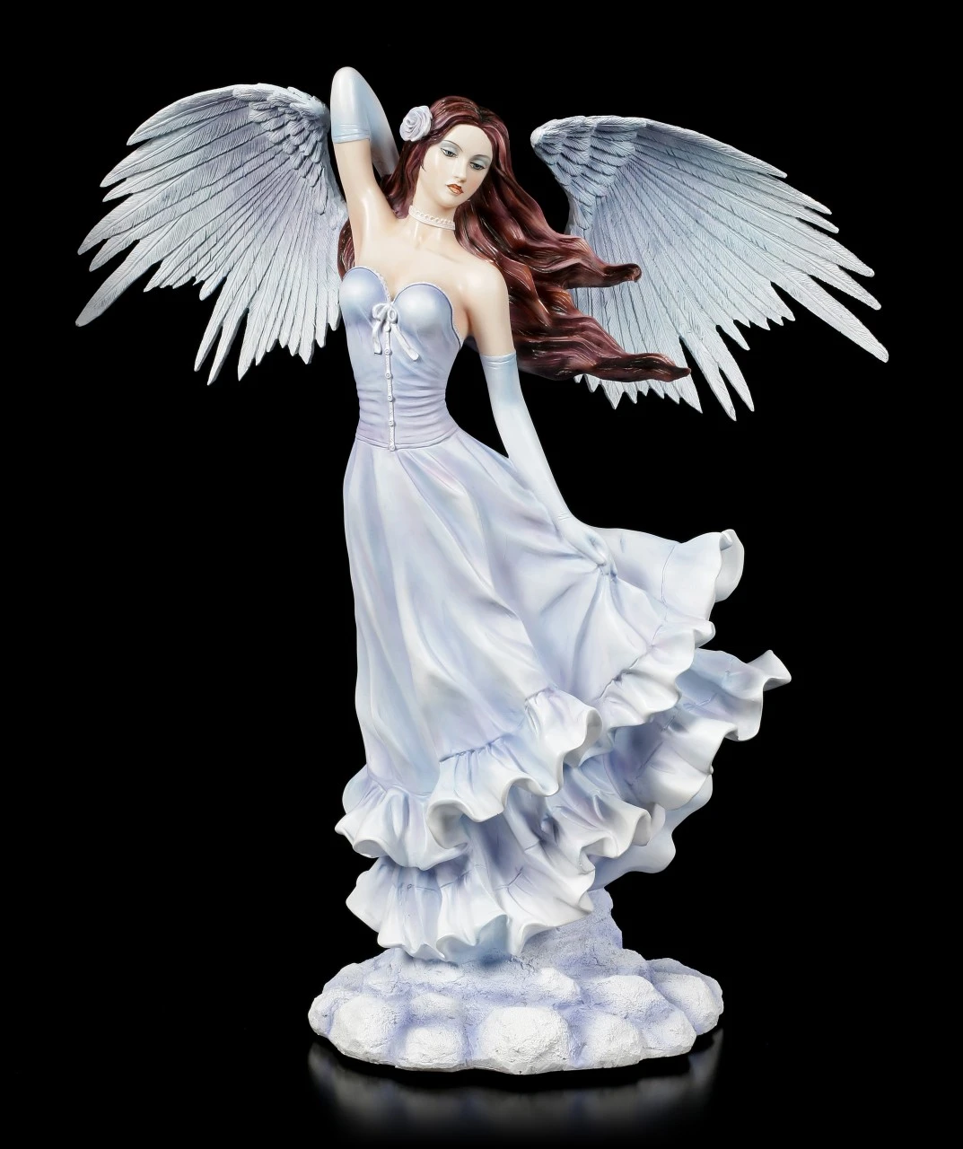 Hoch oben auf einem Wolkenturm tanzt der wunderschöne Engel Lydia mit dem Wind. Sie liebt es, wie dieser durch ihr langes braunes Haar fährt und ihr hellblaues Kleid aufbauscht. Die beeindruckende Engel Figur Lydia aus handbemaltem Kunststein (Polyresin) ist eine Augenweide in jeder Engel Sammlung.