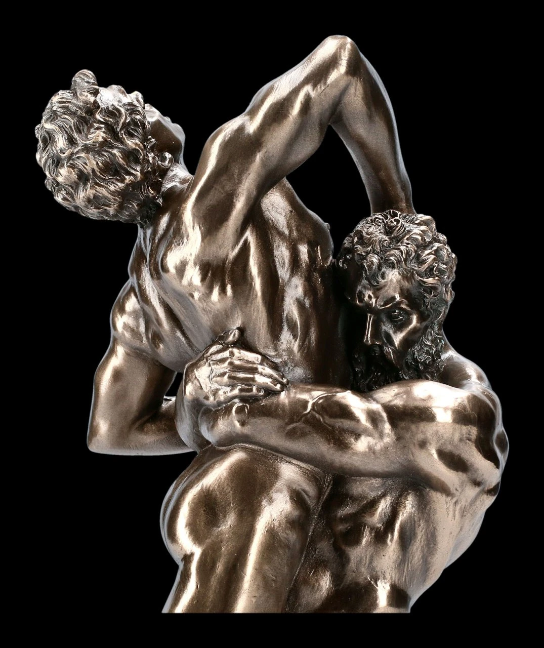 Diese ästhetische Nachbildung zeigt den Kampf zwischen Herkules und Antäus aus der antiken Mythologie. Als Sohn der Erdgöttin Gaia bezog der Riese Antäus seine Kraft aus dem Kontakt zur Erde. Herkules erkannte dies sehr bald und konnte Antäus bezwingen, indem er ihn in die Luft hob und erdrückte. Die Darstellung der Ringenden im Stile einer antiken Bronze zeigt Herkules bei dieser Figur aus detailliert bronziertem und coloriertem Kunststein (Polyresin) im Augenblick des Sieges über Antäus. Mit einer Höhe von 26,5 cm, einer Breite von 11,5 cm und einer Tiefe von 12 cm ist dieser edle und dekorative Männerakt aus der Studio Collection von Veronese ein effektvoller Blickpunkt in Ihrem Wohn- oder Arbeitsbereich.