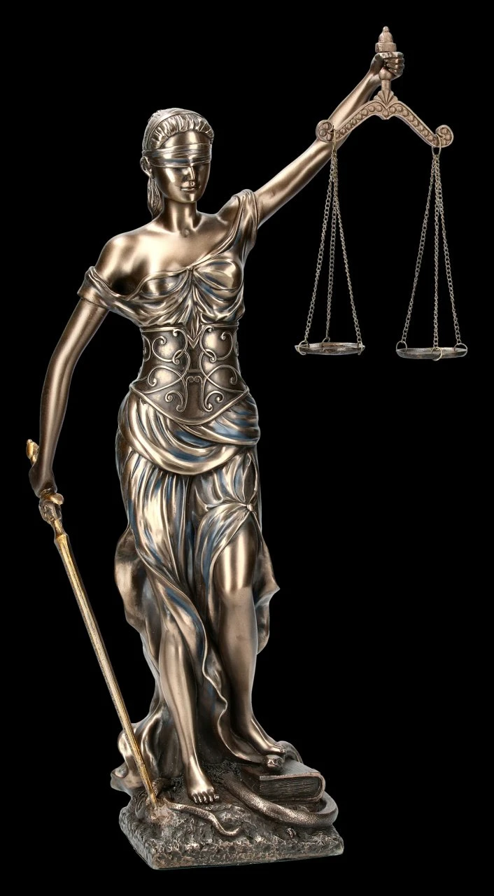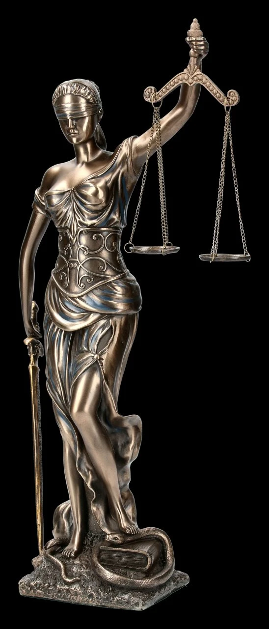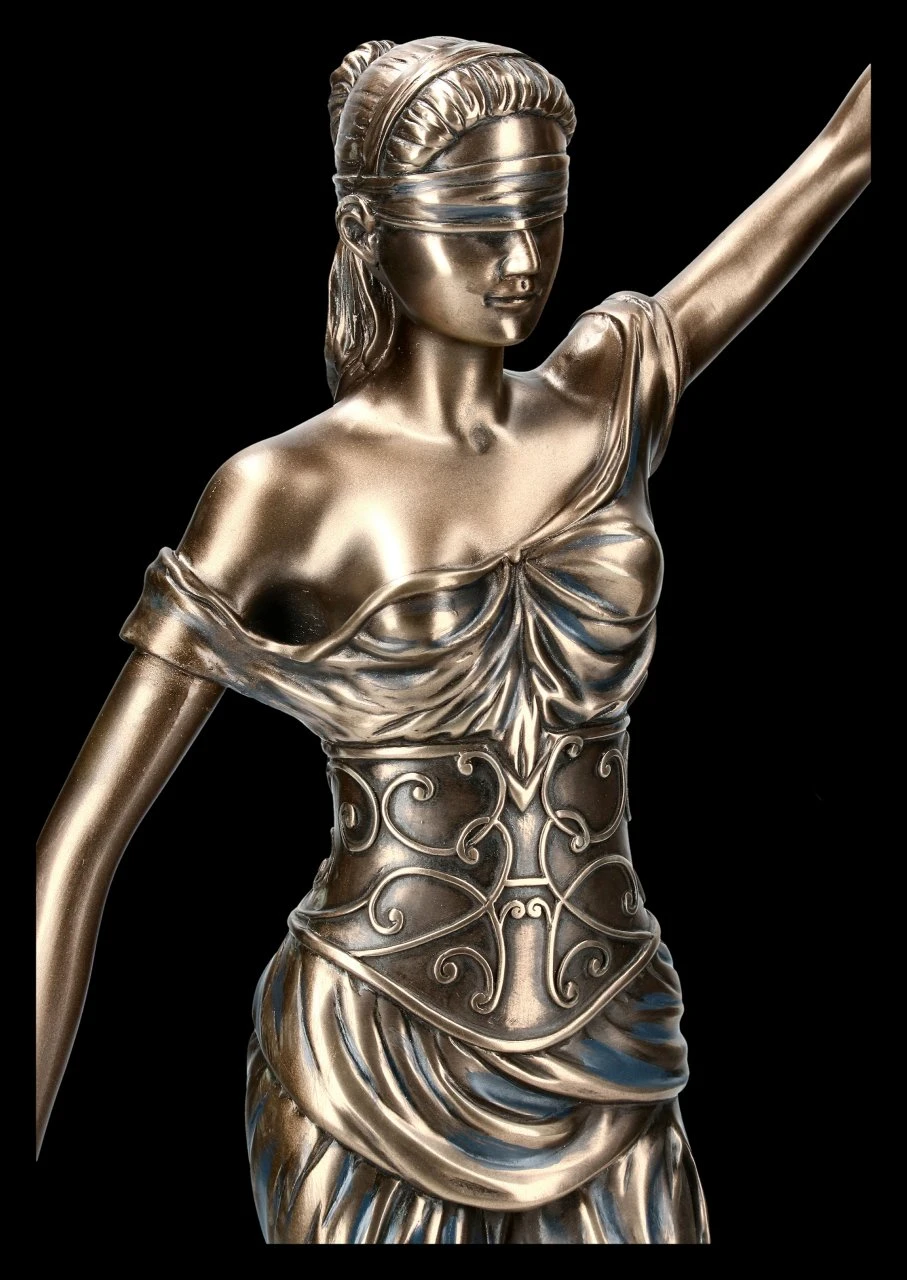 Diese wunderbare Gartenfigur zeigt die römische Göttin der Gerechtigkeit. Im Griechischen wird sie Dike genannt. Die mittelgroße Darstellung der Justitia mit Waage (Abwägen der Sachlage), dem Richtschwert (durchführen der Entscheidung) und der Augenbinde (Unvoreingenommenheit) ist aus edel bronziertem Kunststein (Polyresin).