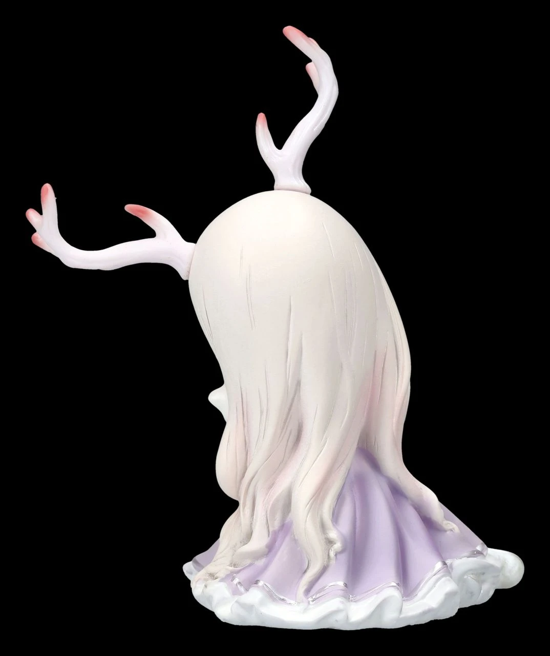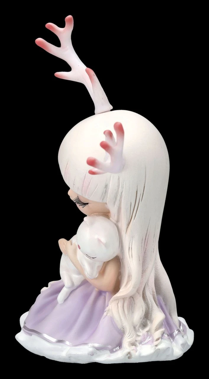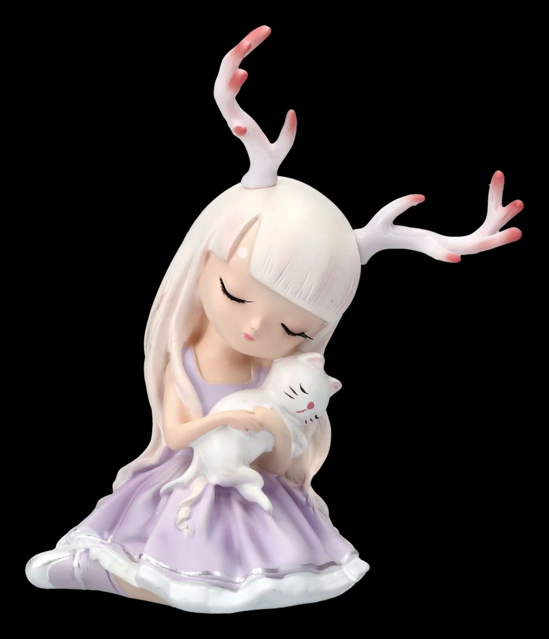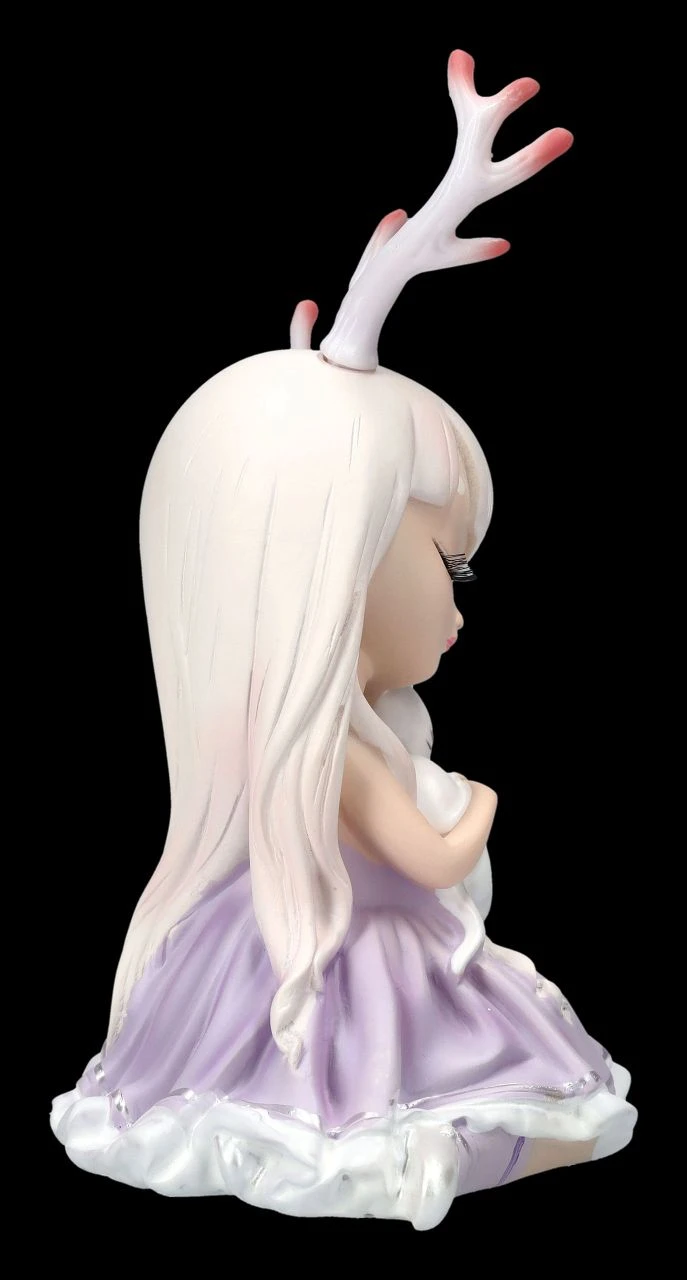 Fürsorglich und zärtlich streichelt die kleine Fee das weiße Kätzchen, das sie gerade im Wald gefunden hat. Wie man am Geweih erkennen kann, gehört sie eigentlich zu der Elfenschar, die sich um die neugeborenen Bambis kümmern soll. Aber die kleine Fee liebt eben alle Tiere. Aus liebevoll handbemaltem Kunststein (Polyresin) gefertigt, ist die 13,5 cm hohe, 8 cm breite und 7,5 cm tiefe kleine Fee mit Geweih und Katze ein wunderbares Geschenk für alle, die gerne von der Welt der Feen und Elfen träumen. Gemeinsam mit ihren Freundinnen aus unserem Shop ist sie auch eine niedliche Deko für jeden Geburtstagstisch.
