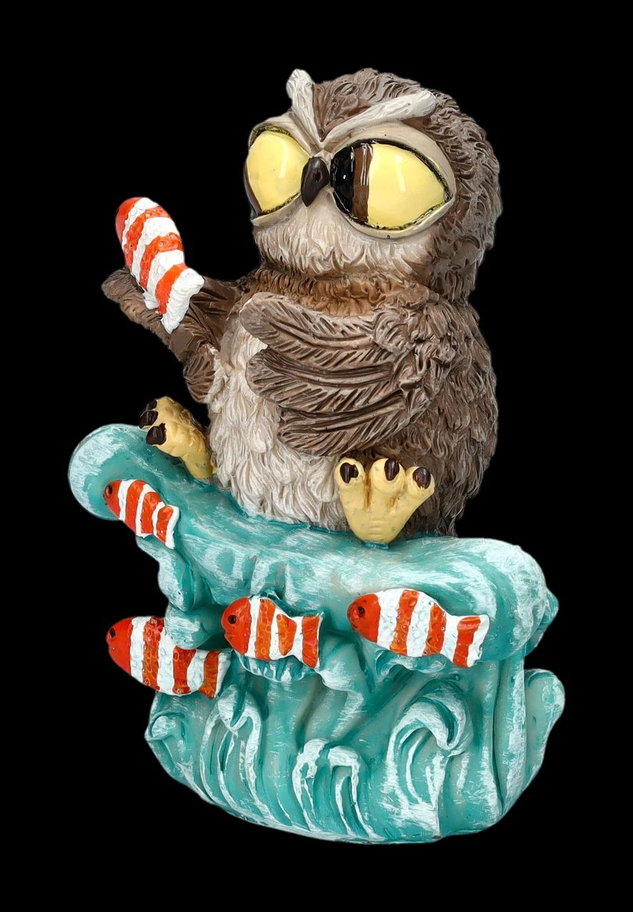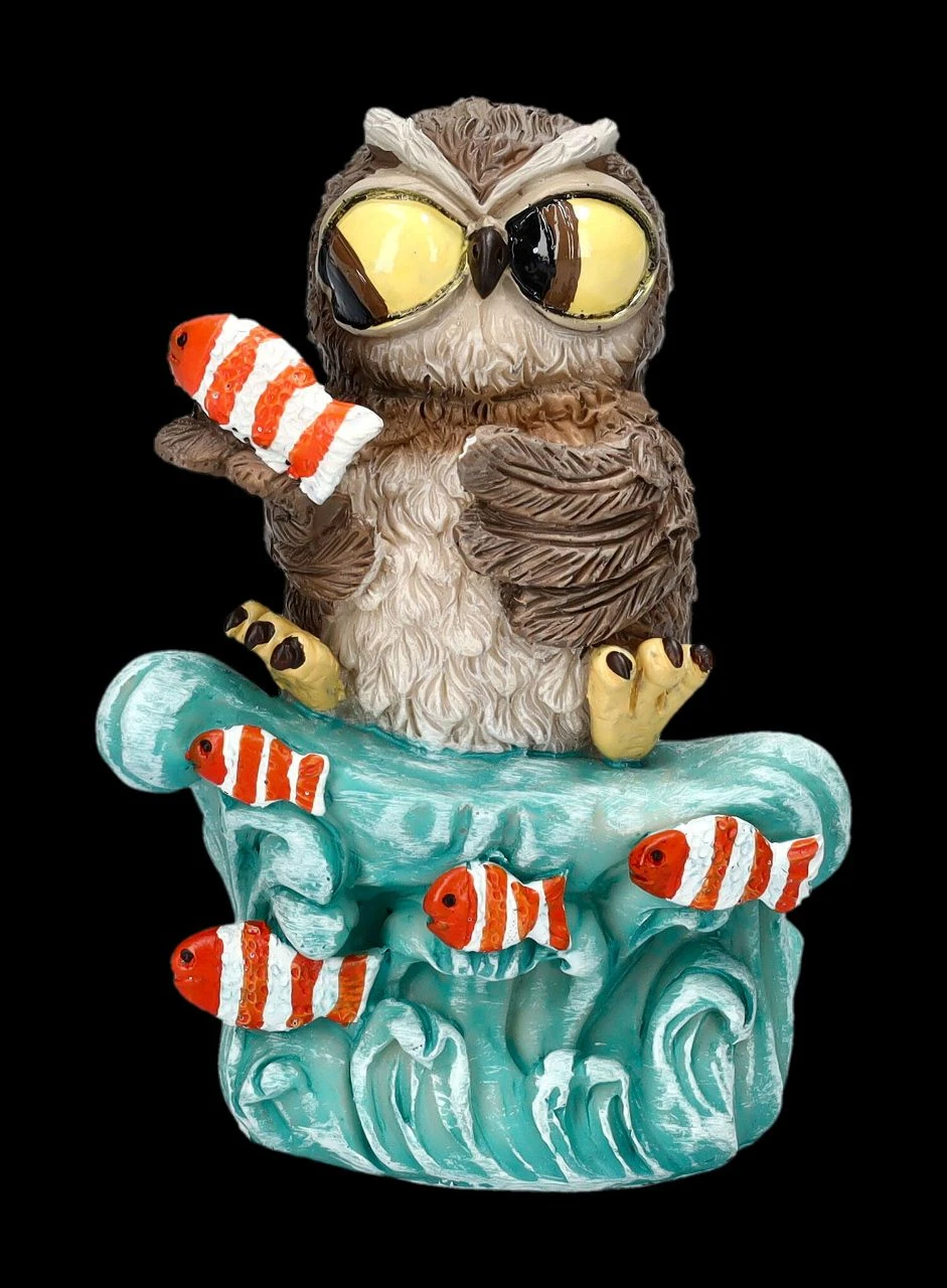Für alle, die im Sternzeichen Fische geboren sind, aber natürlich auch für alle Fischer ist diese witzige Eule das perfekte Geschenk. Sie sieht auch allzu niedlich aus, wie sie einen der Fische, die in den Wogen zu ihren Füßen schwimmen, zärtlich in den Armen hält. Die lustige, 11 cm hohe, 8 cm breite und 5 cm tiefe Eulen-Figur mit den bunten Fischen wurde aus liebevoll handbemaltem Kunststein (Polyresin) gefertigt.