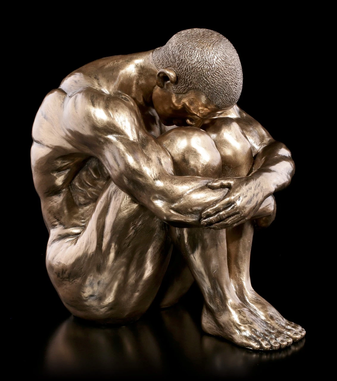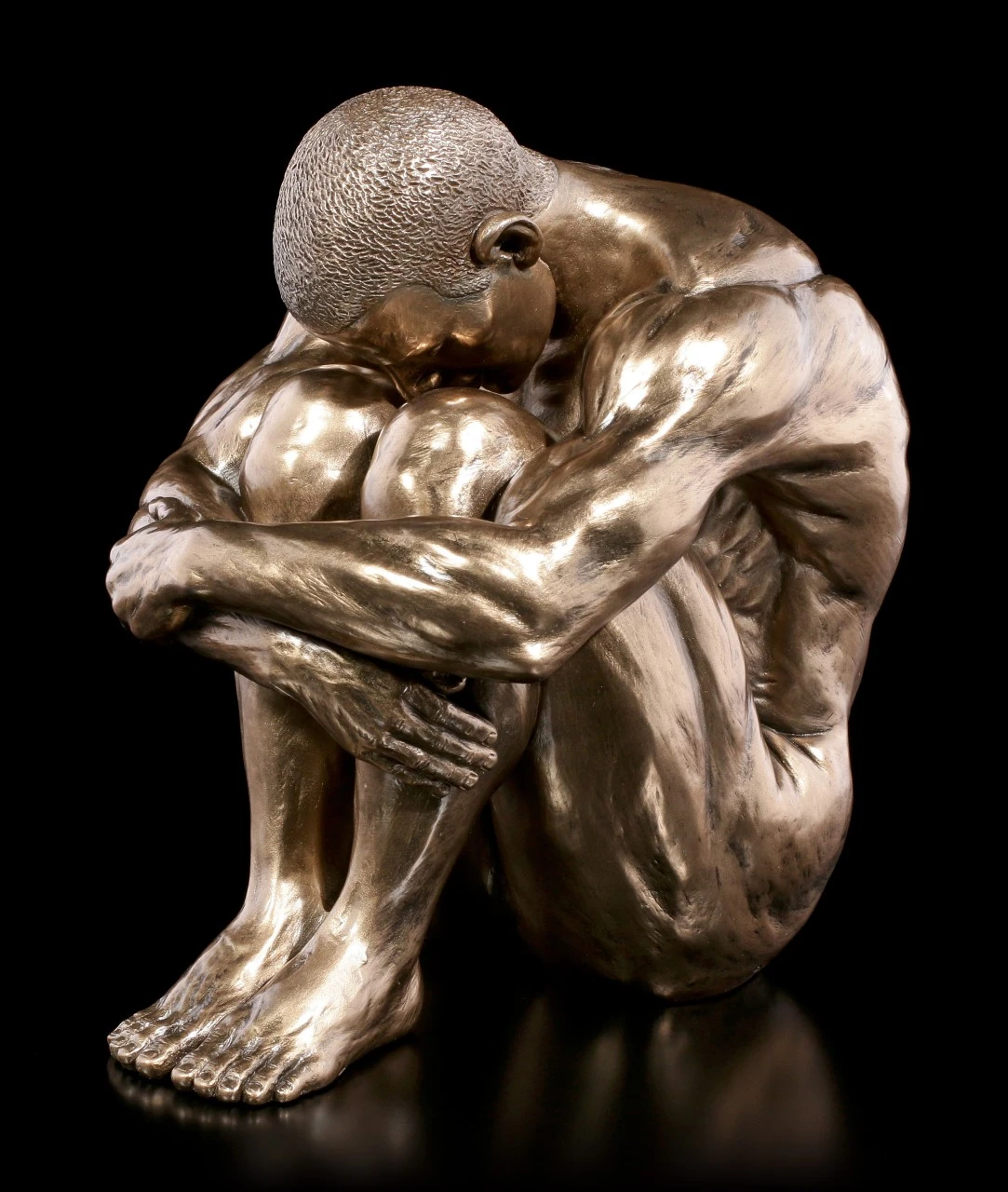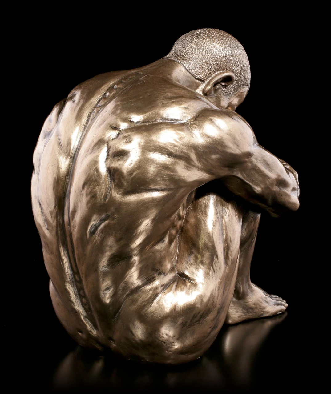 Der bronzierte männliche Akt schimmert sanft im Licht und lässt Ihre Wohnung aufregend sinnlich wirken. Warum knied der muskulöse Mann wohl auf dem Boden? Denkt er gerade über sein Leben nach?