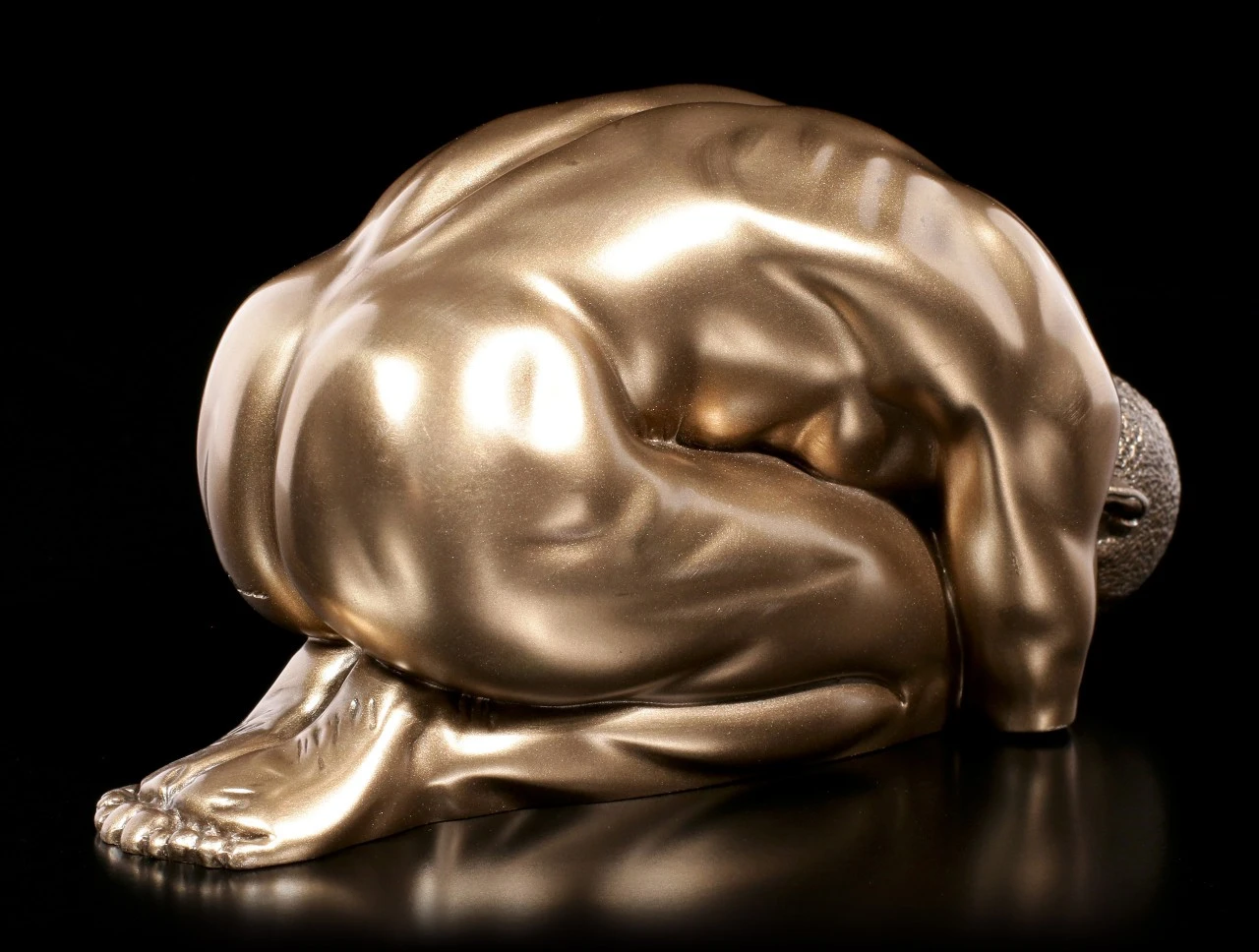 Mit Anmut und Sinnlichkeit kniet der attraktive Mann auf dem Boden und bettet sein Kopf sanft in seine Hände. Damit zieht er sofort alle Blicke auf sich und so wird der männliche Akt zu einem schönen Blickfang.