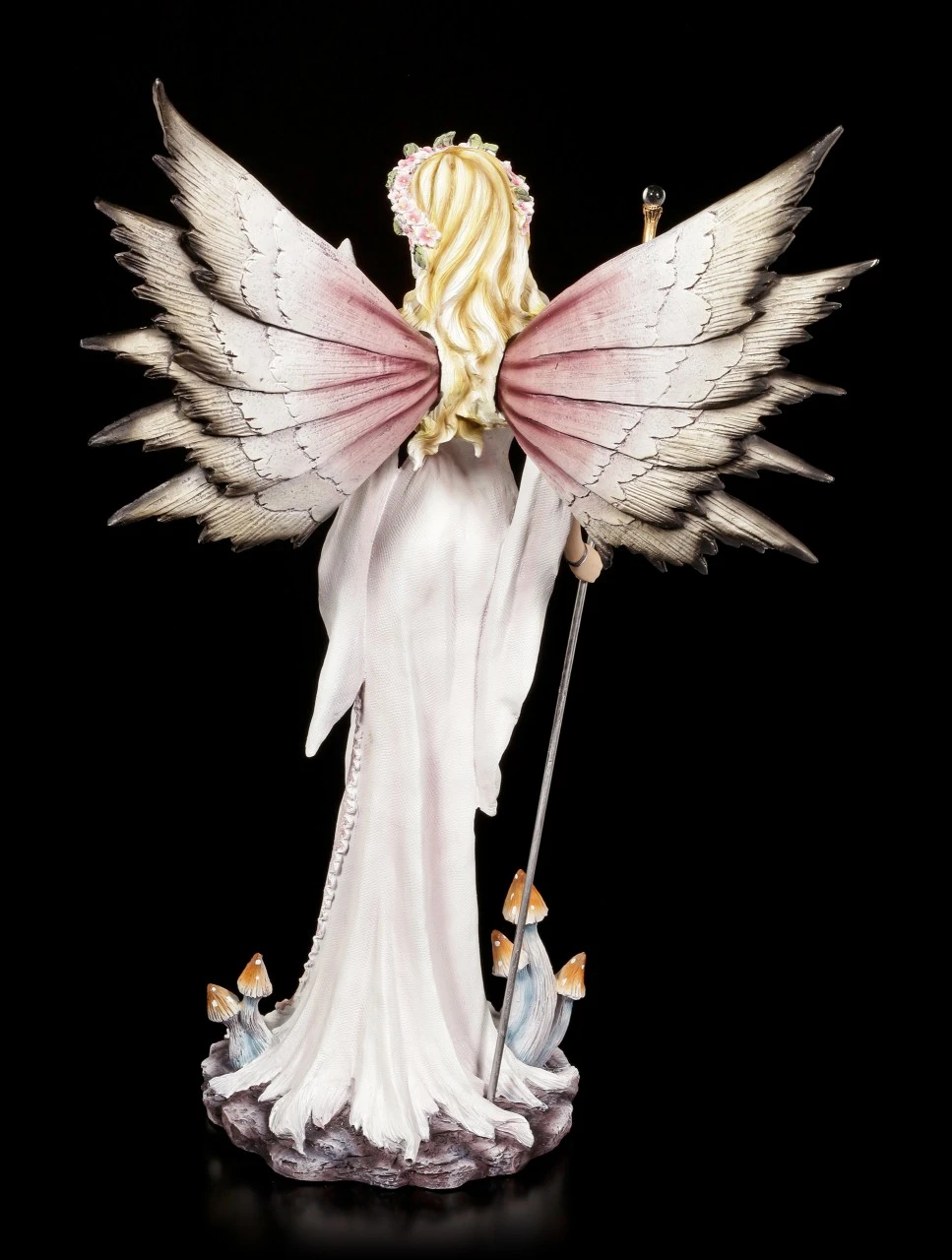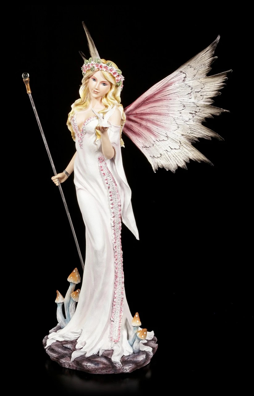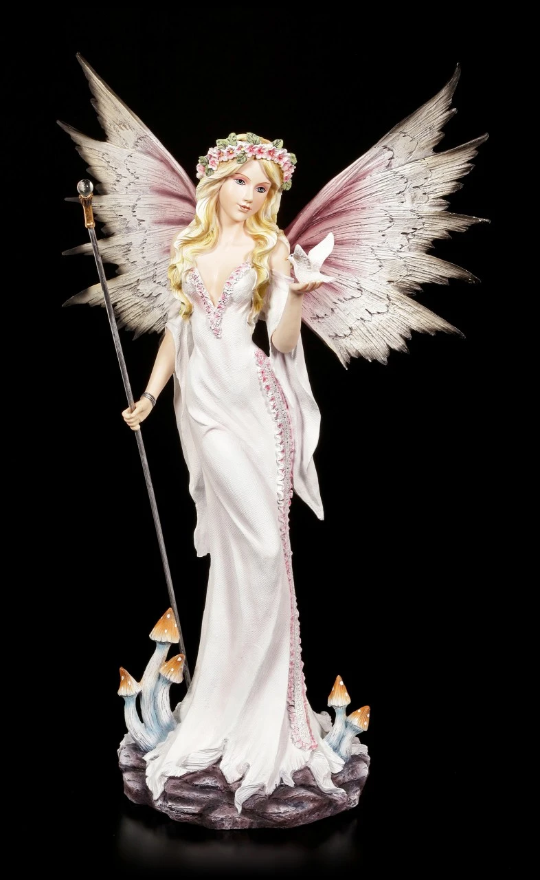 Isahia mit weißer Taube ist eine wunderschöne Kunststein Elfen Figur in Pastellfarben. Mit Ihrem Zepter, dem langen edlen Gewand und dem Blumenkranz im Haar wirkt sie wie die Königin der Elfen.