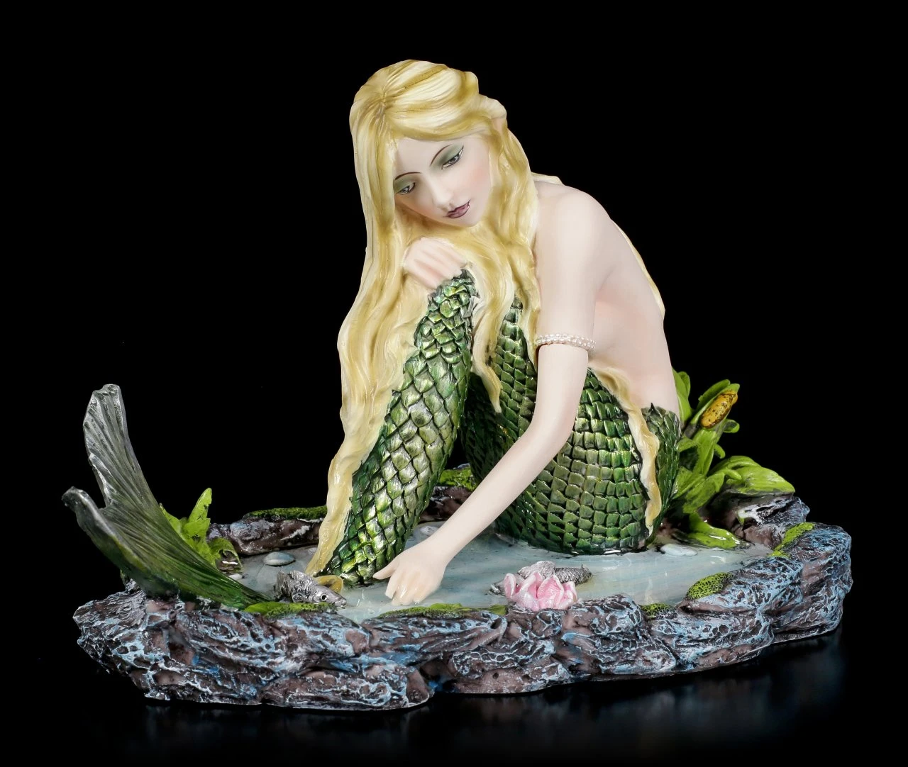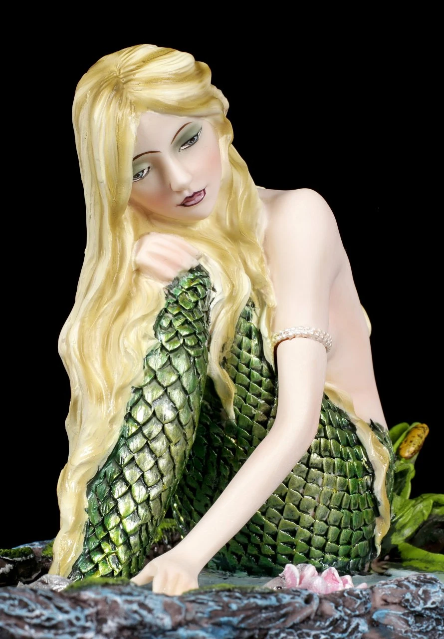 Die hübsche Meerjungfrau sitzt am Ufer eines Gewässers und blickt nachdenklich in die Tiefen. Wohin schweifen wohl ihre Gedanken ab? Die umwerfende Meerjungfrauen Figur ‚Sensitive Dreams‘ aus liebevoll handbemaltem Kunststein (Polyresin) ist eine wunderbare Deko zum Beispiel in einem Badezimmer.