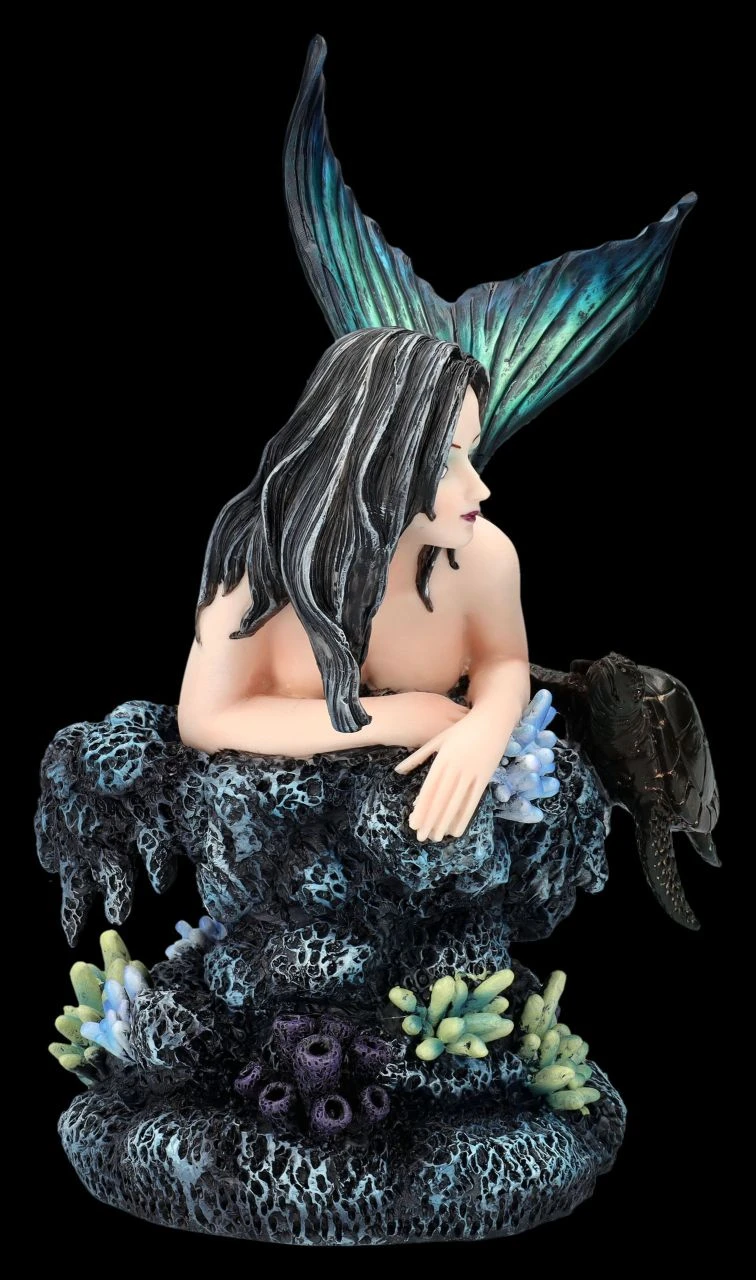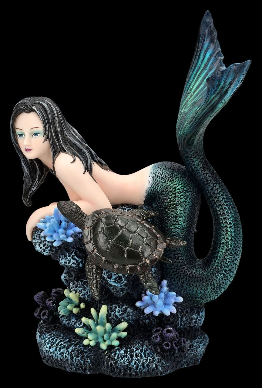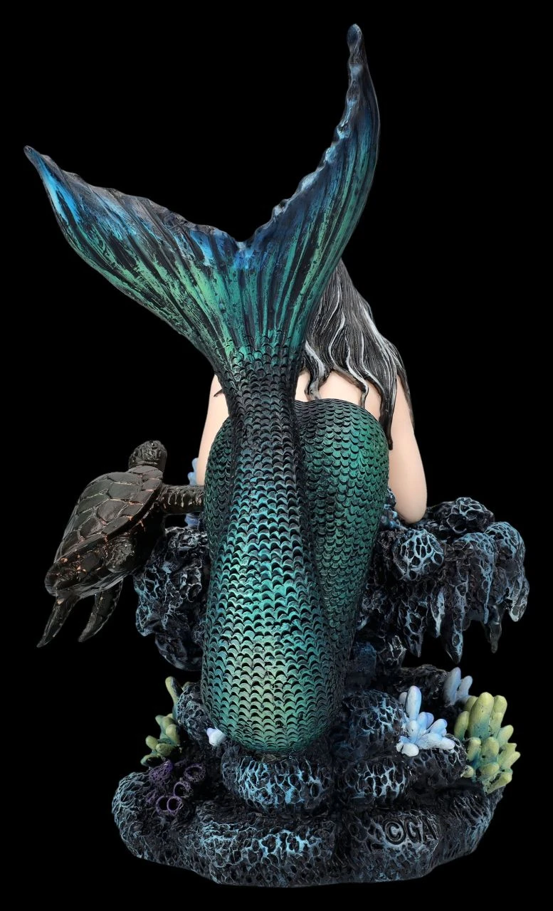 Nicht nur die alte Schildkröte ist verzaubert von der wunderschönen Tatana, die sich in den blau-schwarzen Tiefen des Meeres auf einen Felsen ausruht. Die Meerjungfrau mit den schwarzen Haaren sieht einfach bezaubernd aus. Kein Wunder, dass Meerjungfrauen nicht nur in früheren Zeiten dem einen oder anderen Seemann gefährlich werden können. Die 23 cm hohe, 16 cm breite und 13 cm tiefe Meerjungfrau Tatana mit der Schildkröte ist aus hochwertigem Kunststein (Polyresin) und wurde liebevoll in den Farben des Meeres von Hand bemalt. Im Bad oder auch zwischen den Pflanzen auf der Blumenbank wird die schöne Meerjungfrauen-Figur garantiert zum sofortigen Blickfang und ist damit für alle, die das Meer und seine mystischen Bewohner lieben, auch ein perfektes Geschenk.
