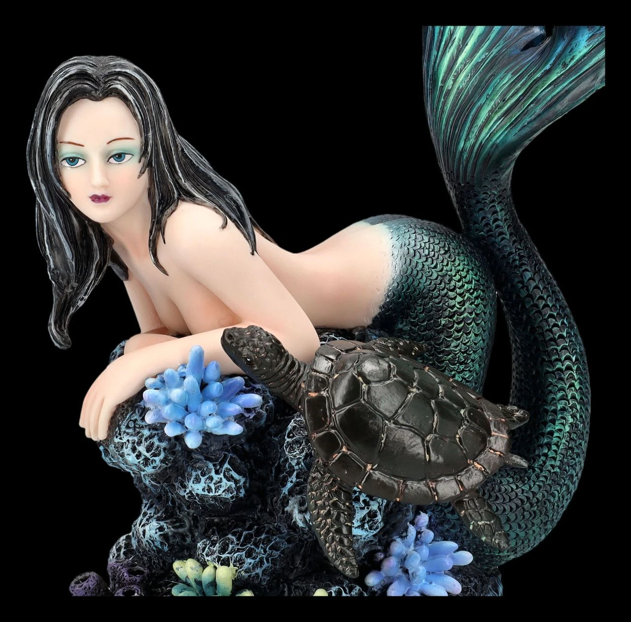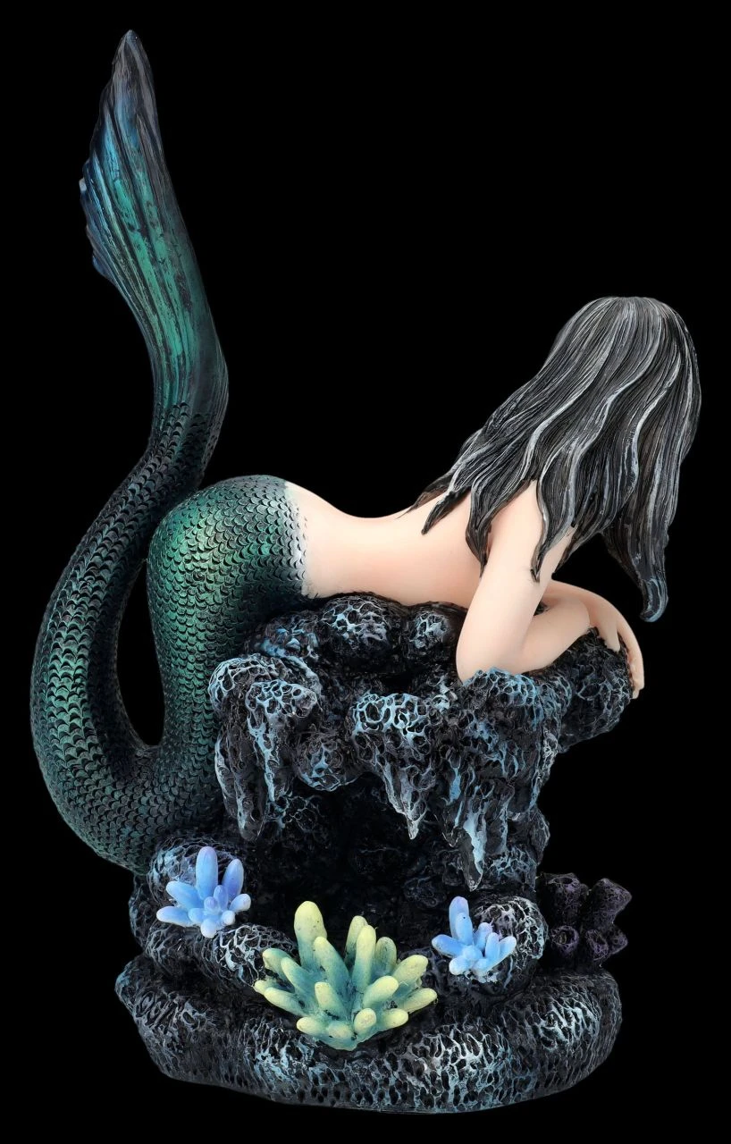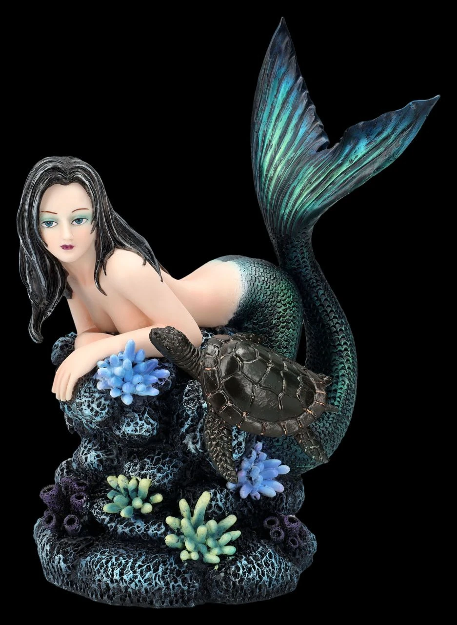 Nicht nur die alte Schildkröte ist verzaubert von der wunderschönen Tatana, die sich in den blau-schwarzen Tiefen des Meeres auf einen Felsen ausruht. Die Meerjungfrau mit den schwarzen Haaren sieht einfach bezaubernd aus. Kein Wunder, dass Meerjungfrauen nicht nur in früheren Zeiten dem einen oder anderen Seemann gefährlich werden können. Die 23 cm hohe, 16 cm breite und 13 cm tiefe Meerjungfrau Tatana mit der Schildkröte ist aus hochwertigem Kunststein (Polyresin) und wurde liebevoll in den Farben des Meeres von Hand bemalt. Im Bad oder auch zwischen den Pflanzen auf der Blumenbank wird die schöne Meerjungfrauen-Figur garantiert zum sofortigen Blickfang und ist damit für alle, die das Meer und seine mystischen Bewohner lieben, auch ein perfektes Geschenk.